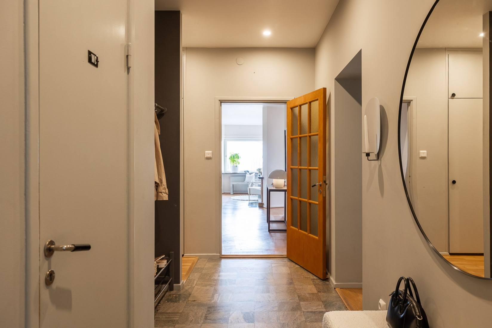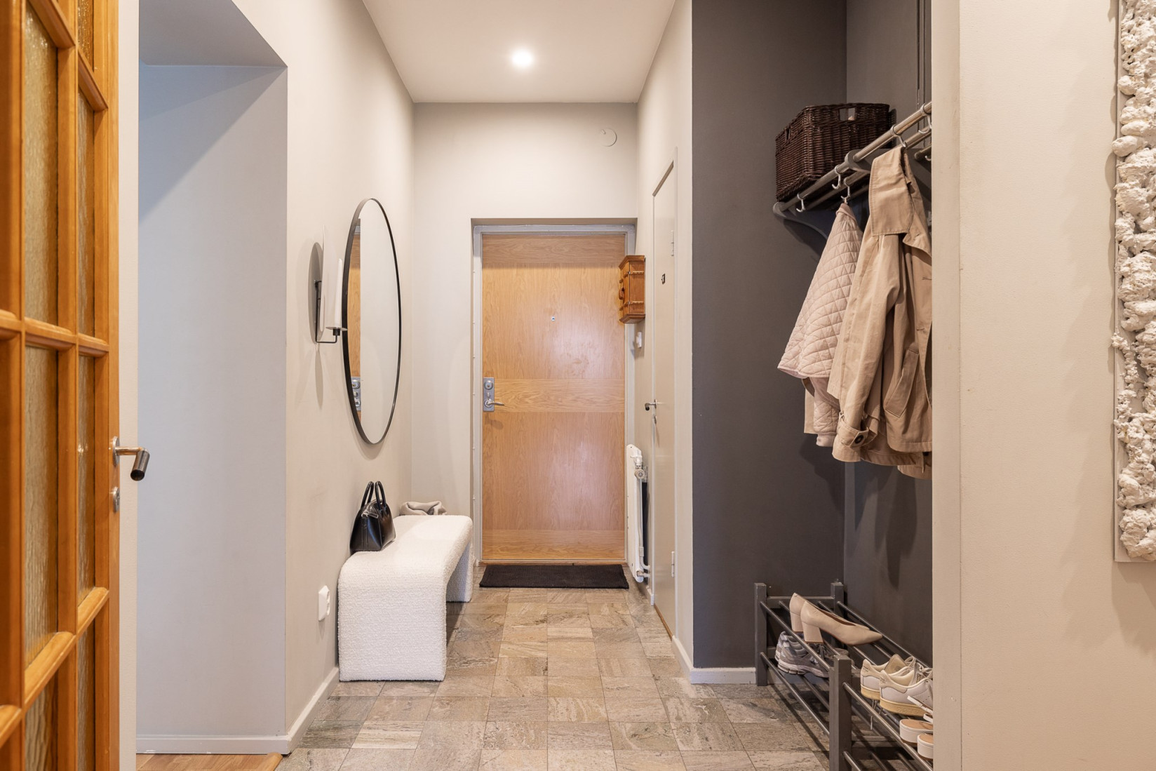 Redan i entrén möts du av en elegant hall med vacker Kolmårdsmarmor på golvet och infällda spotlights som ger ett behagligt ljus. Här finns gott om smart förvaring som gör hallen både praktisk och stilren. I direkt anslutning ligger en fräsch och inbjudande gästtoalett.