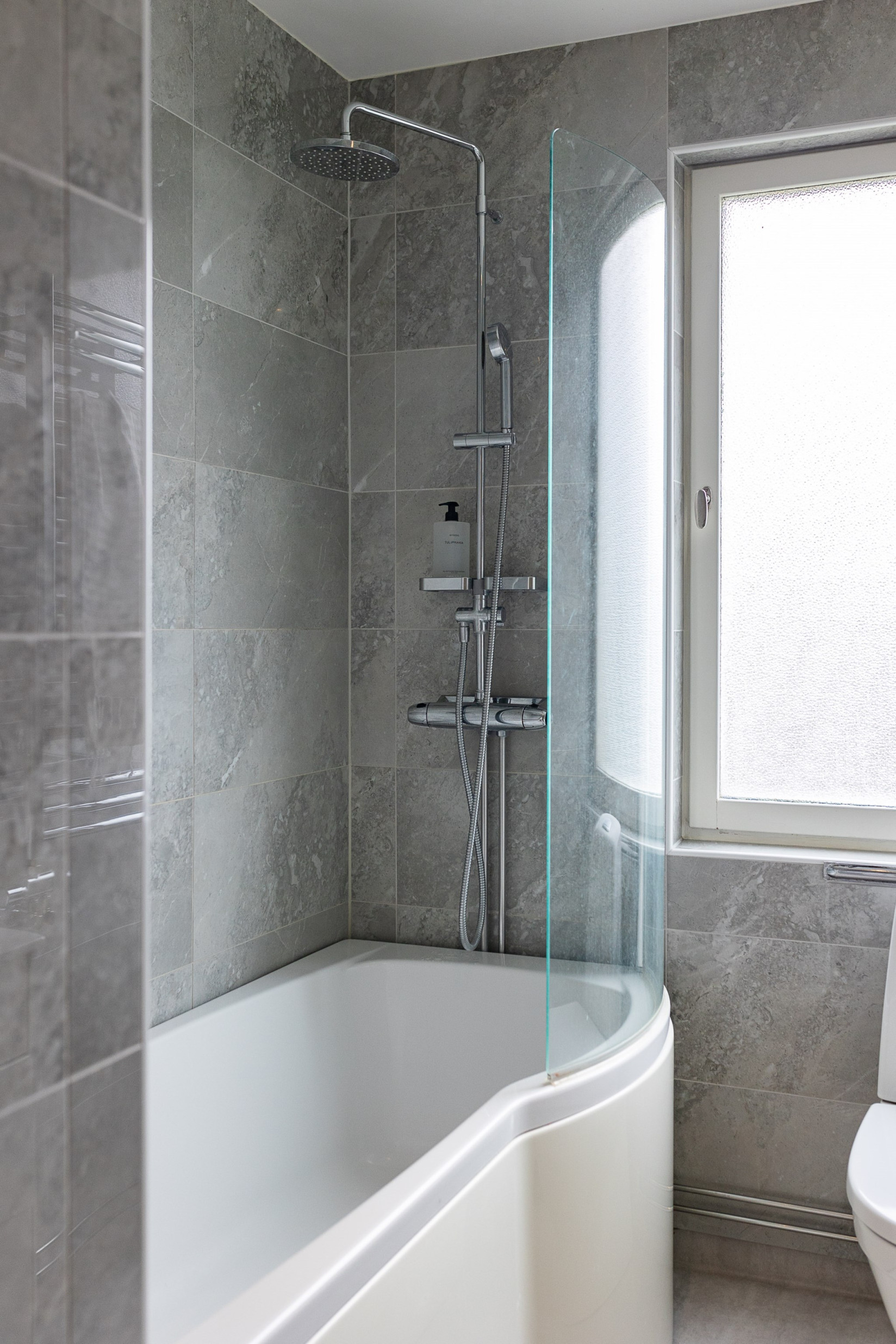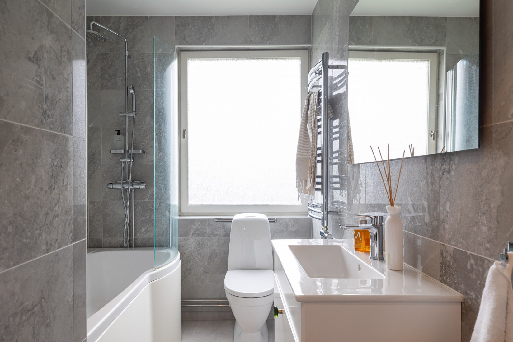 Badrummet är helkaklat och smakfullt inrett med ett badkar, handfat med kommod och toalett. Ett öppningsbart fönster ger ett behagligt ljusinsläpp och möjliggör naturlig vädring.