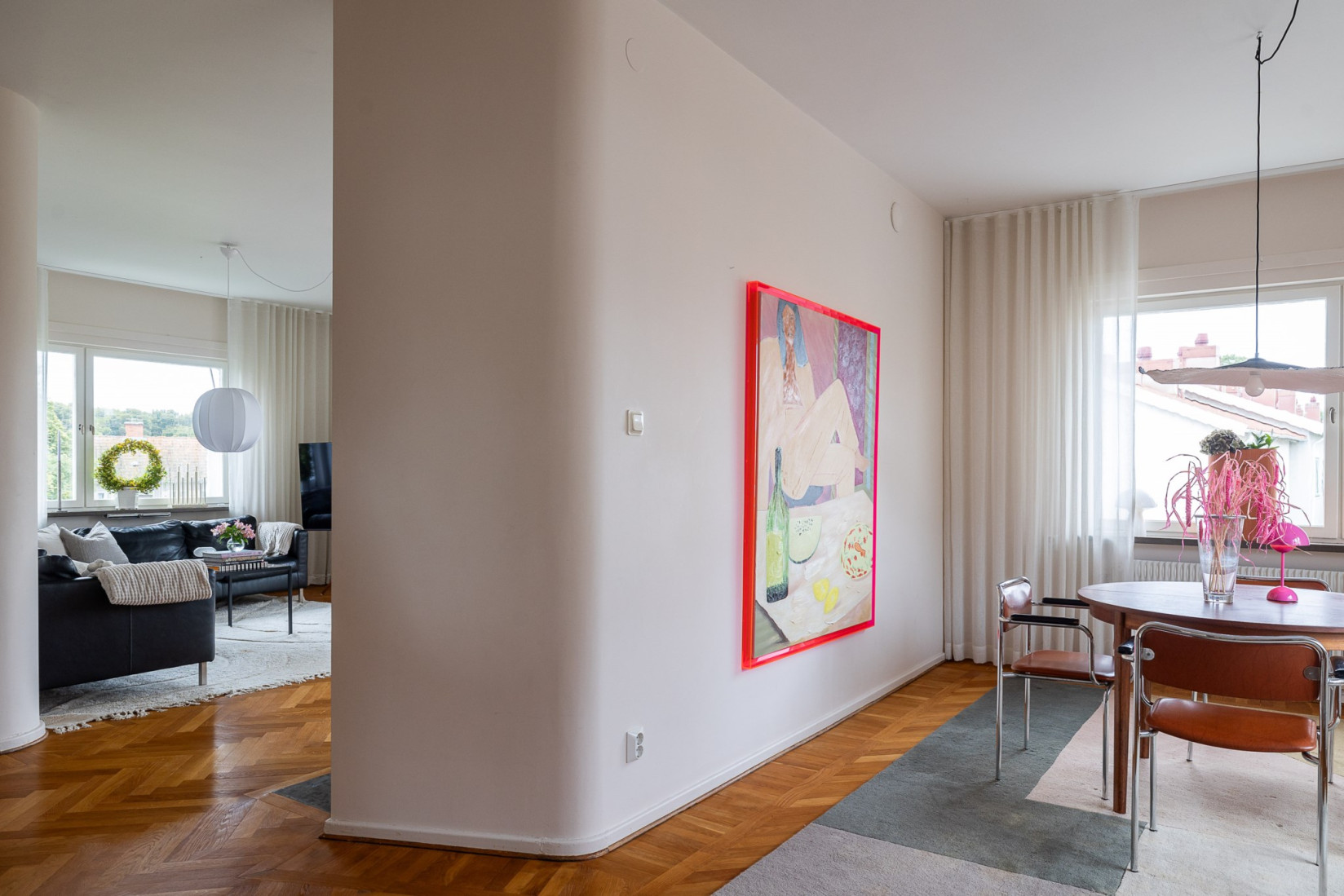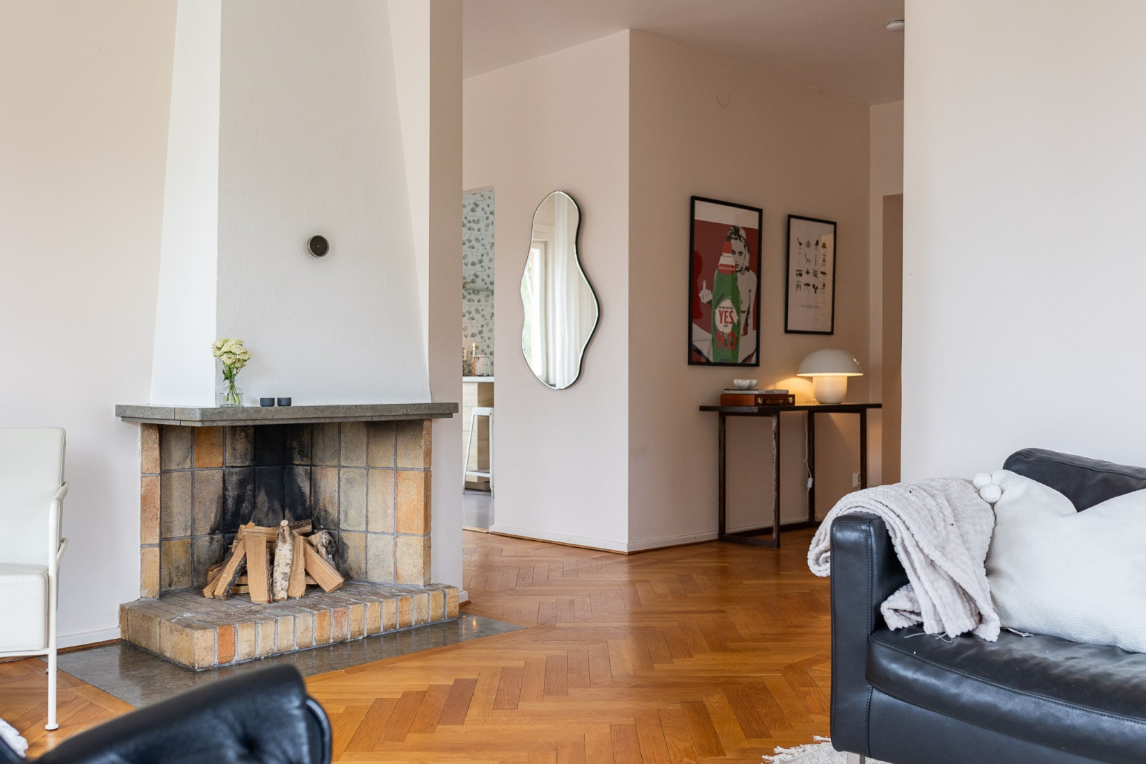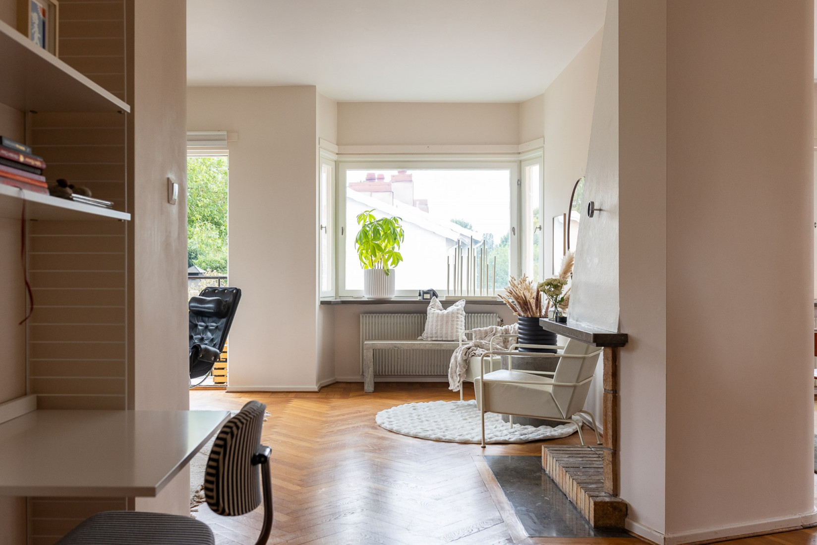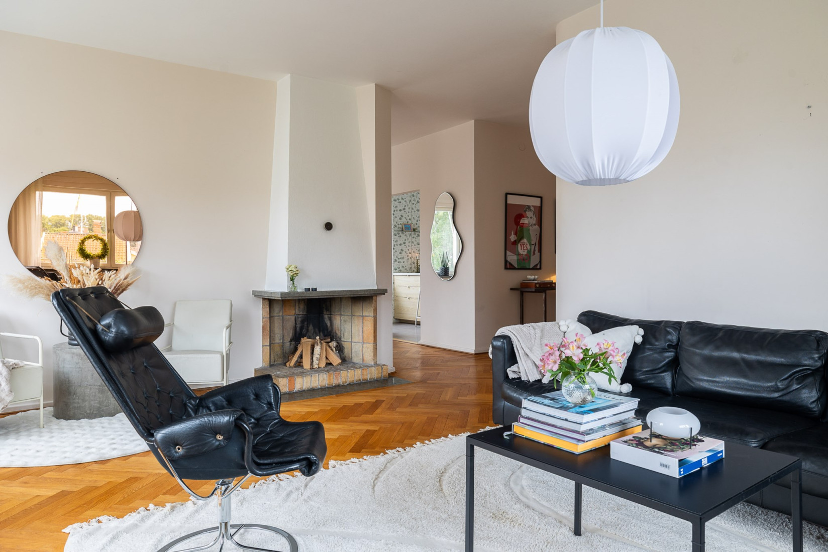 Vardagsrummet ligger även det i gavel och bjuder på samma vackra fiskbensparkett som pryder matsalen. Som pricken över i finns en öppen eldstad som skapar en varm och ombonad känsla. Rummet är lättmöblerat och kan disponeras på flera olika sätt, vilket ger stor flexibilitet.