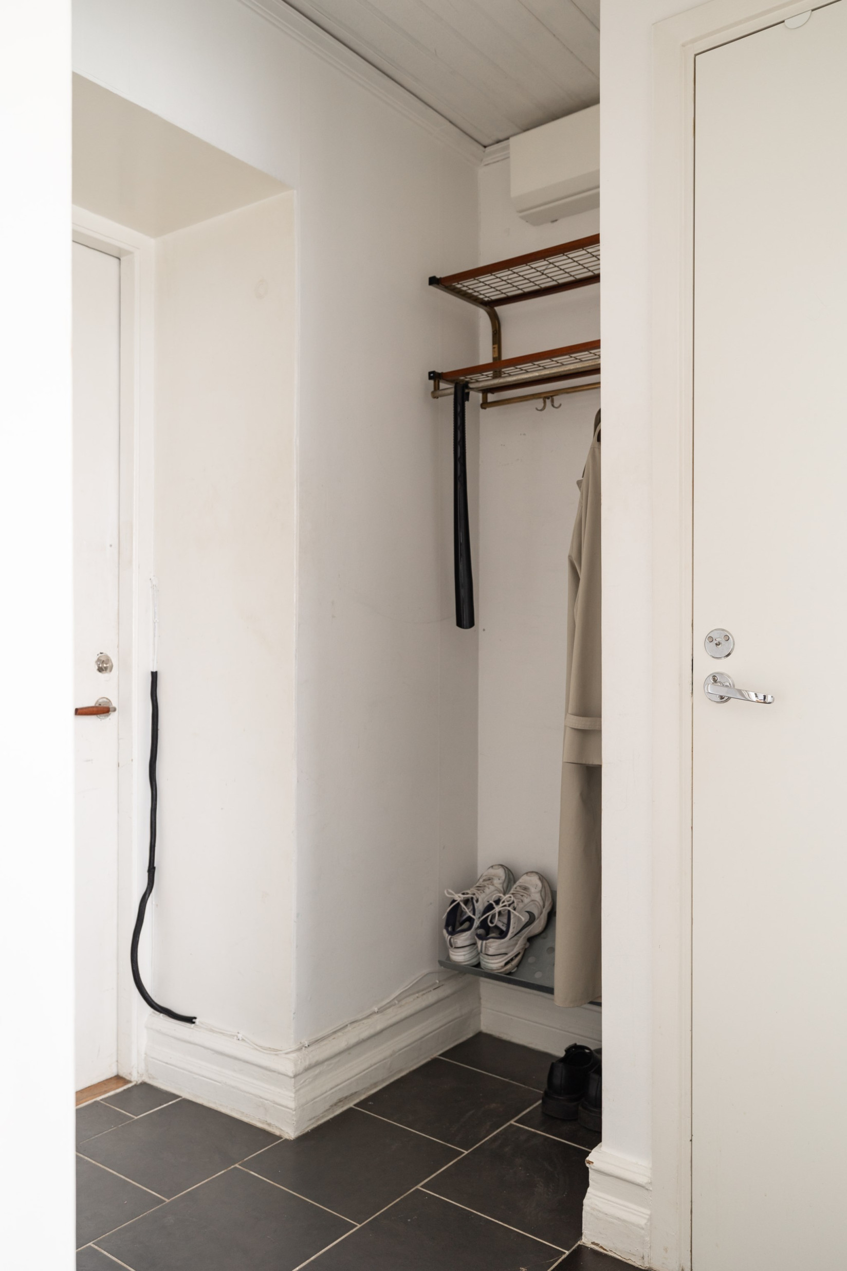 Hallen har gott om plats för avhängning och leder vidare till bostadens alla rum.