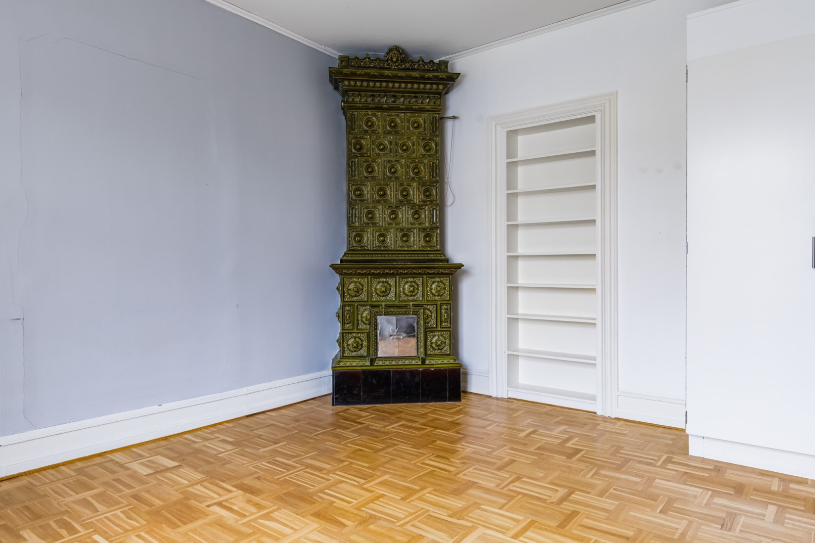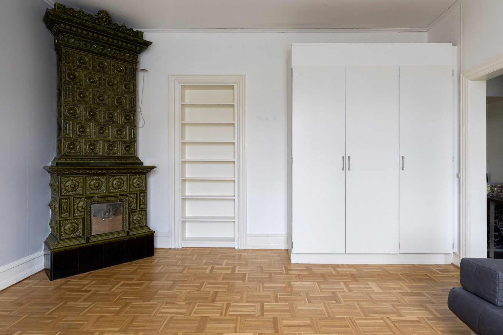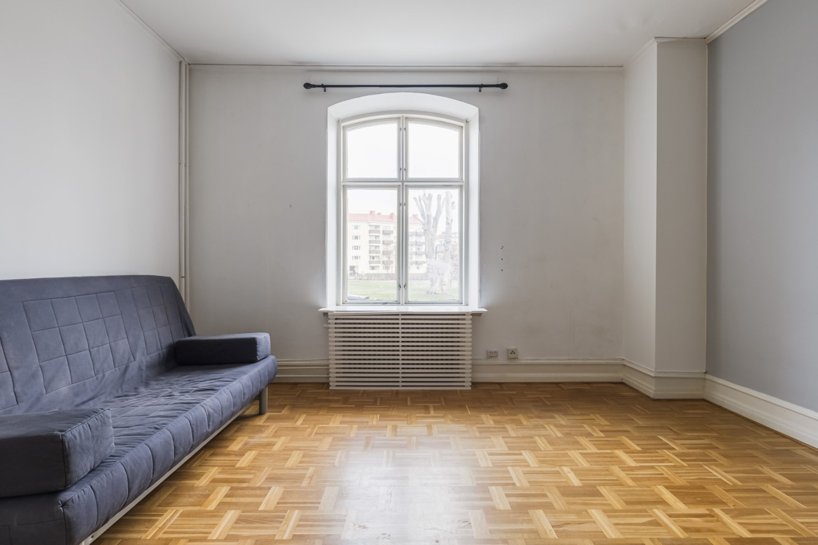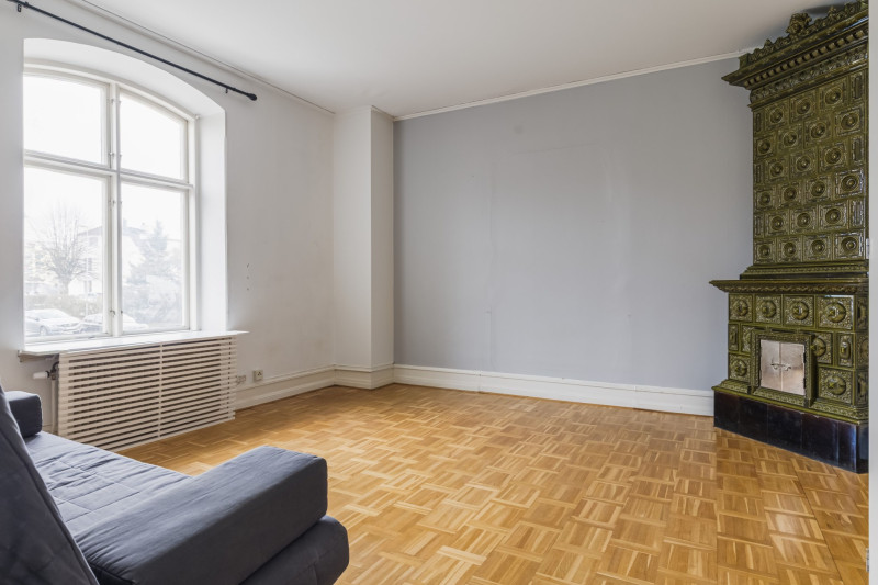 Vardagsrummet har fint parkettgolv, ett vackert rundat fönster mot gatan, gedigen takhöjd och en vacker kakelugn (ej fungerande). Här finns gott om plats för sovplats, soffa och matbord på den stora, öppna ytan.