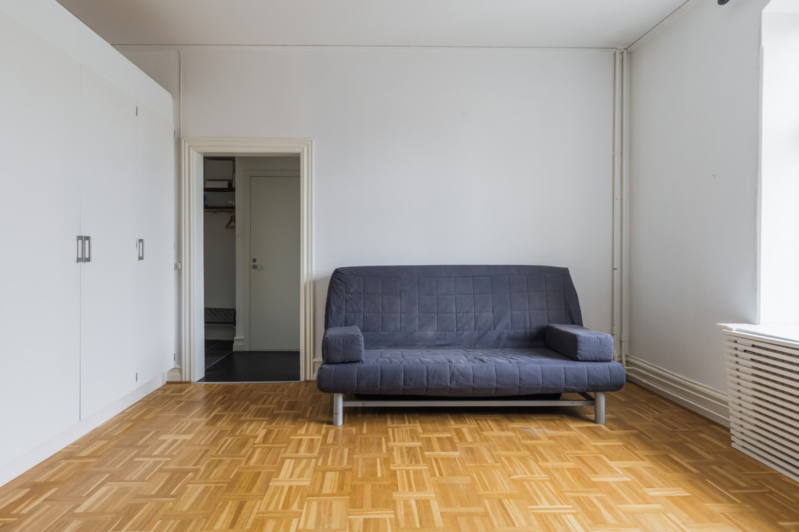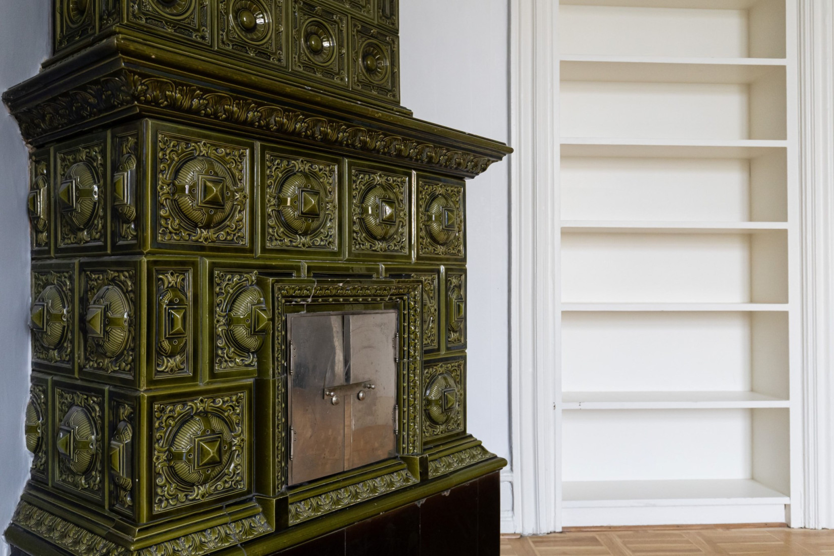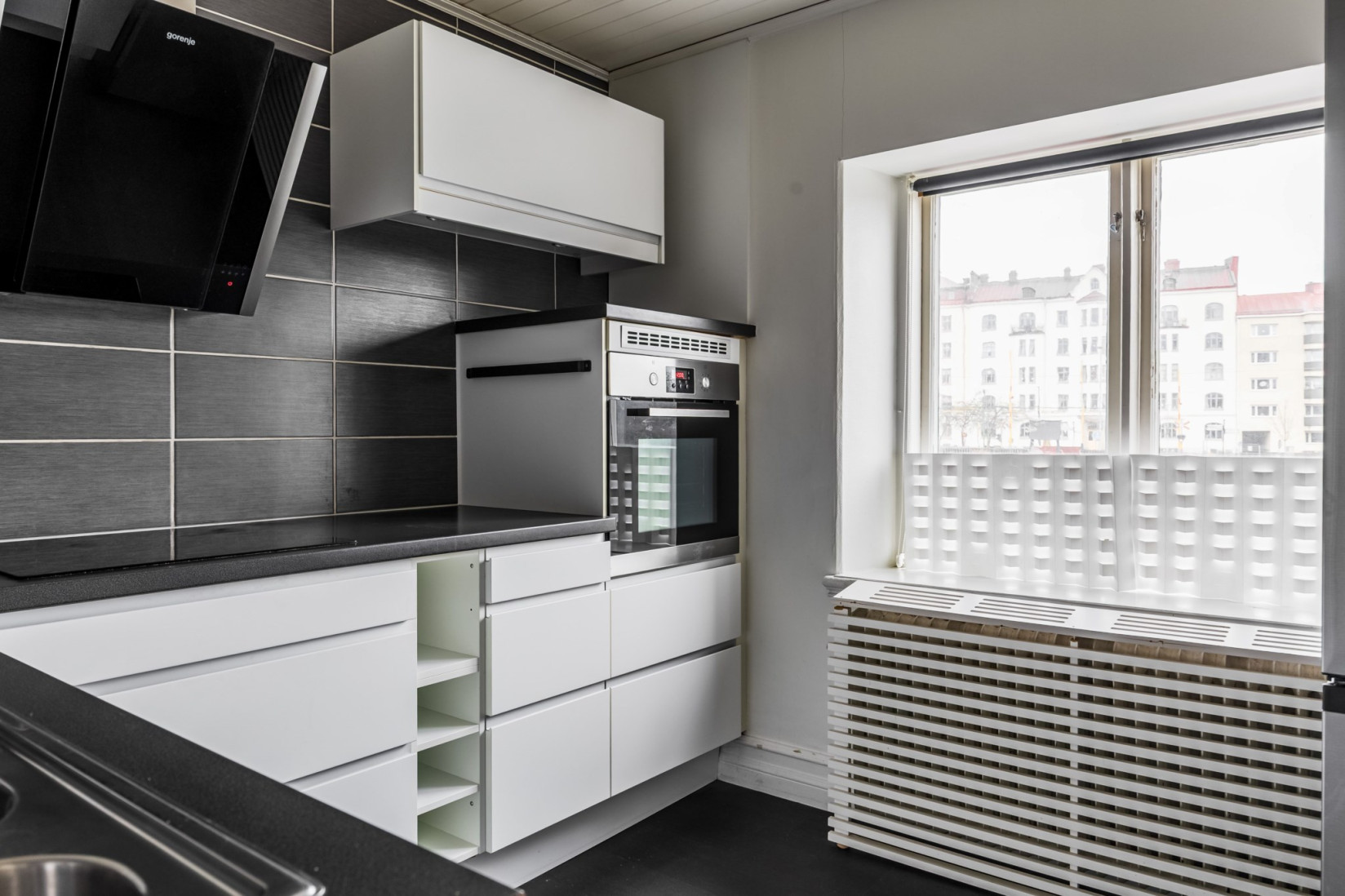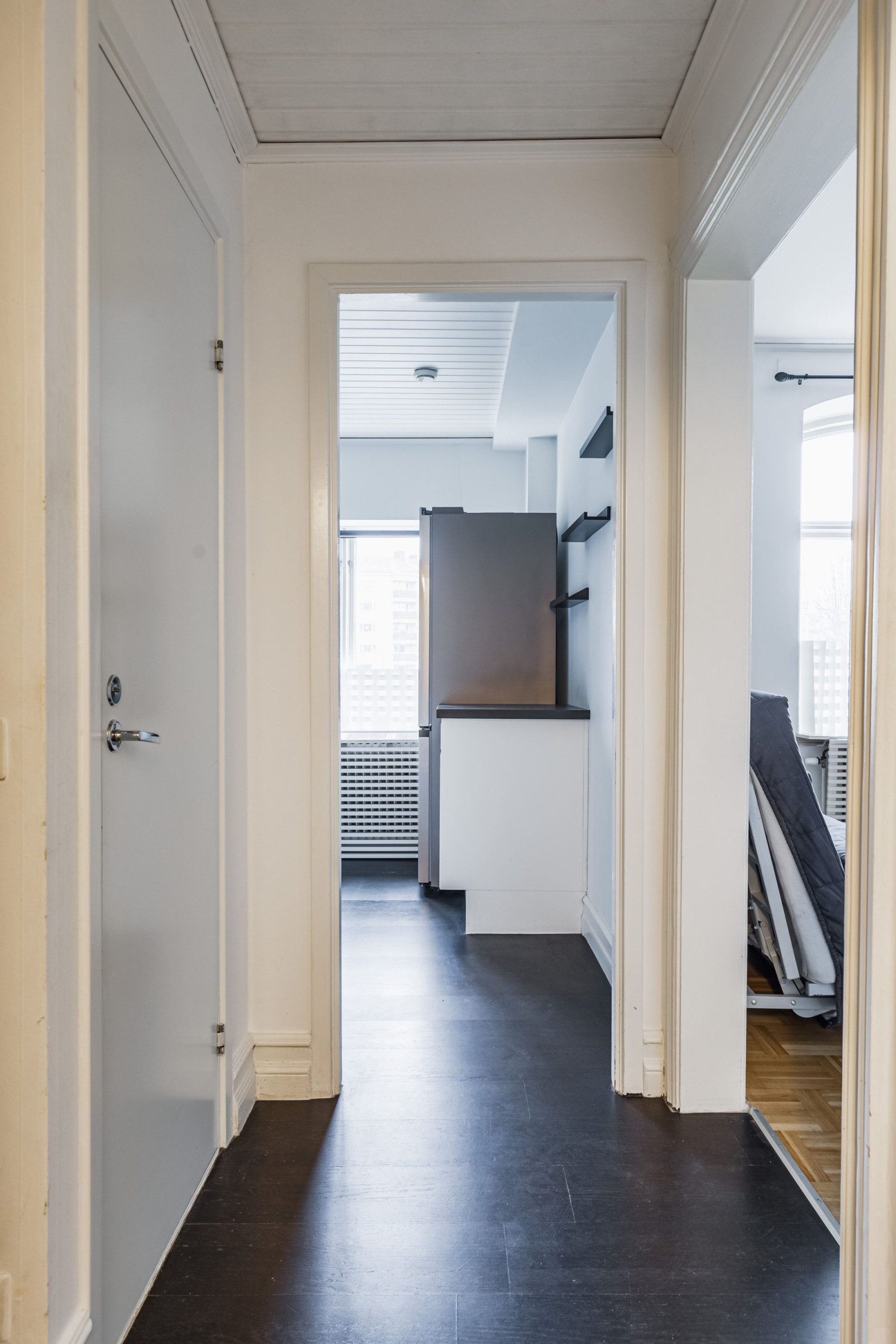 Vardagsrummet har fint parkettgolv, ett vackert rundat fönster mot gatan, gedigen takhöjd och en vacker kakelugn (ej fungerande). Här finns gott om plats för sovplats, soffa och matbord på den stora, öppna ytan.