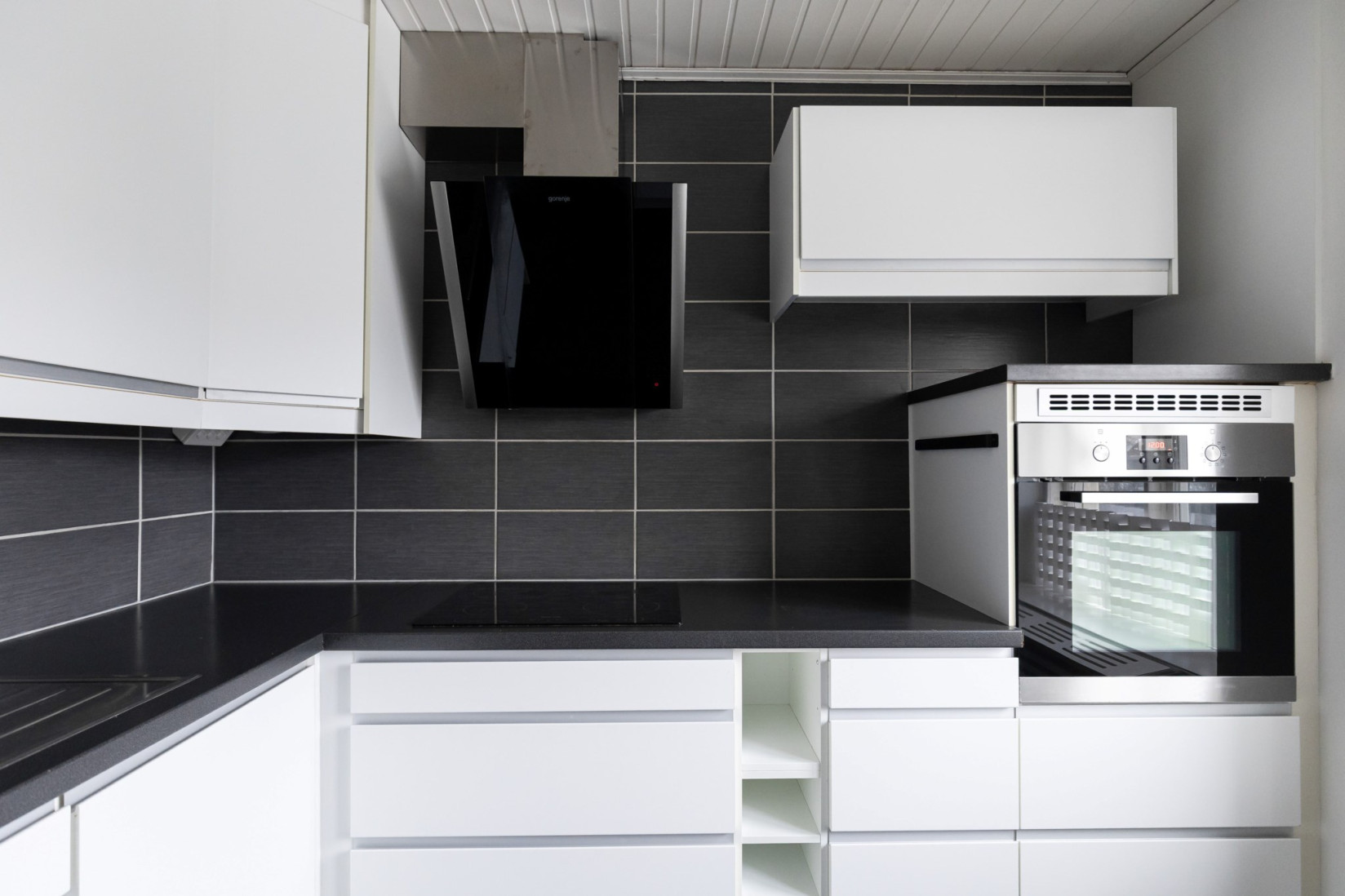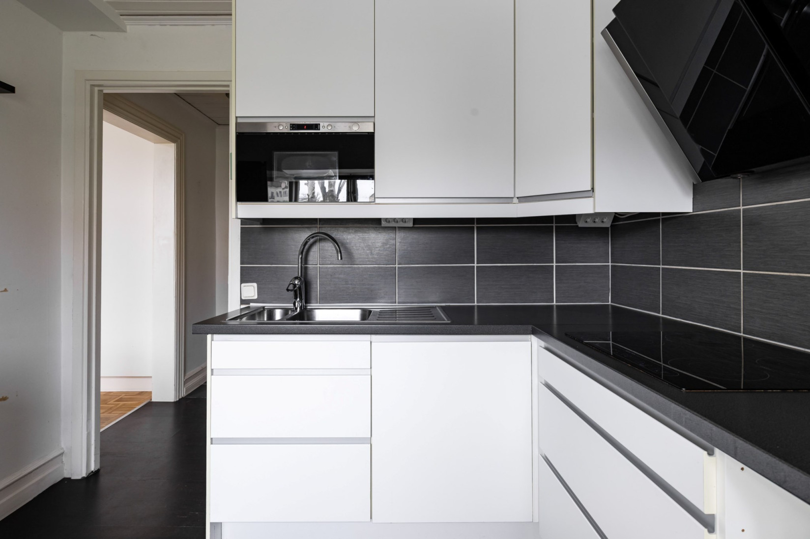 Rakt fram i hallen ligger det välplanerade köket med rostfria vitvaror och vita skåpluckor. Bra arbetsytor och förvaring kombineras med plats för köksbord vid fönstret mot gatan. Den maskinella utrustningen inkluderar häll, fläkt, ugn och kyl/frys.
