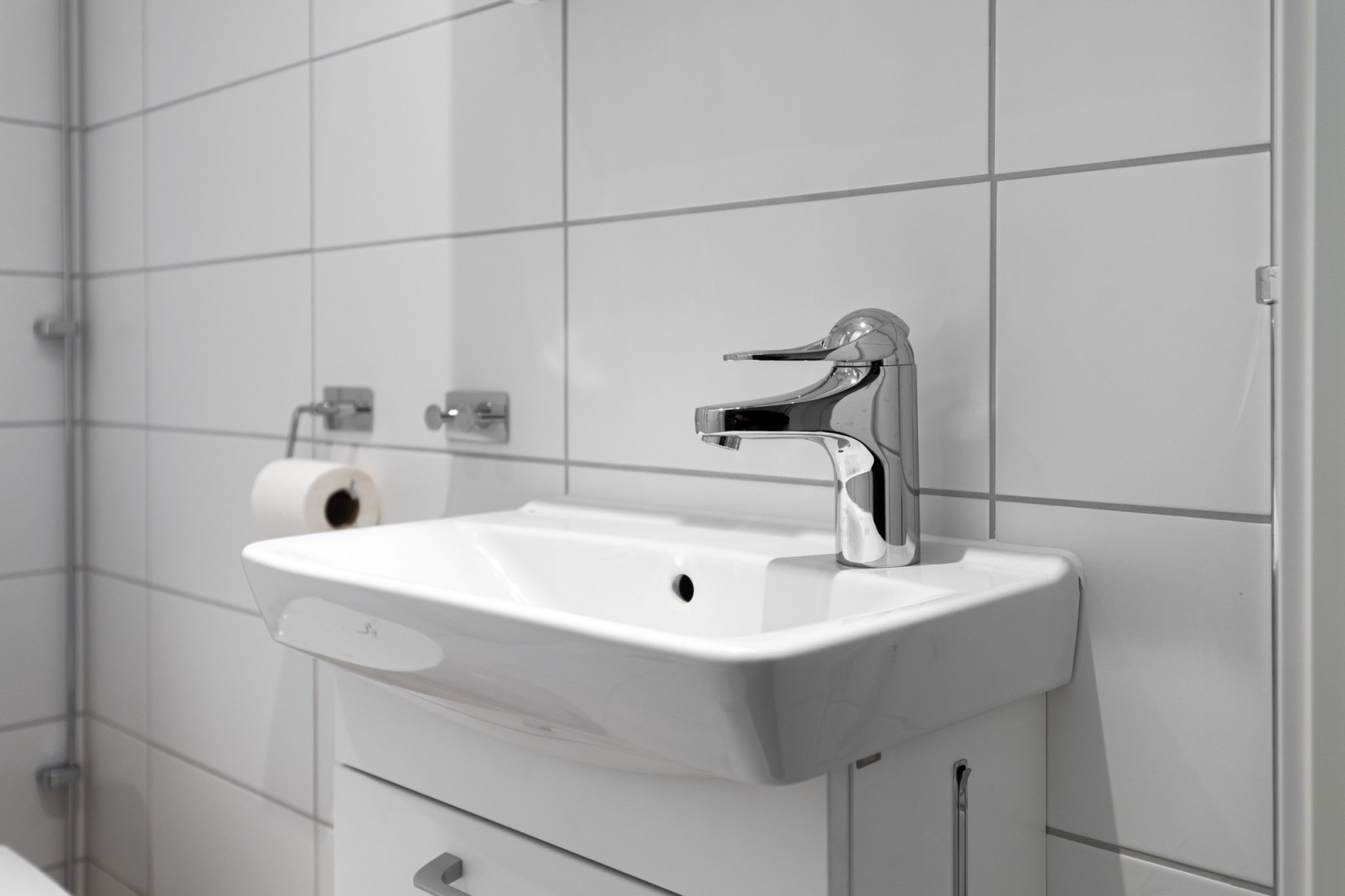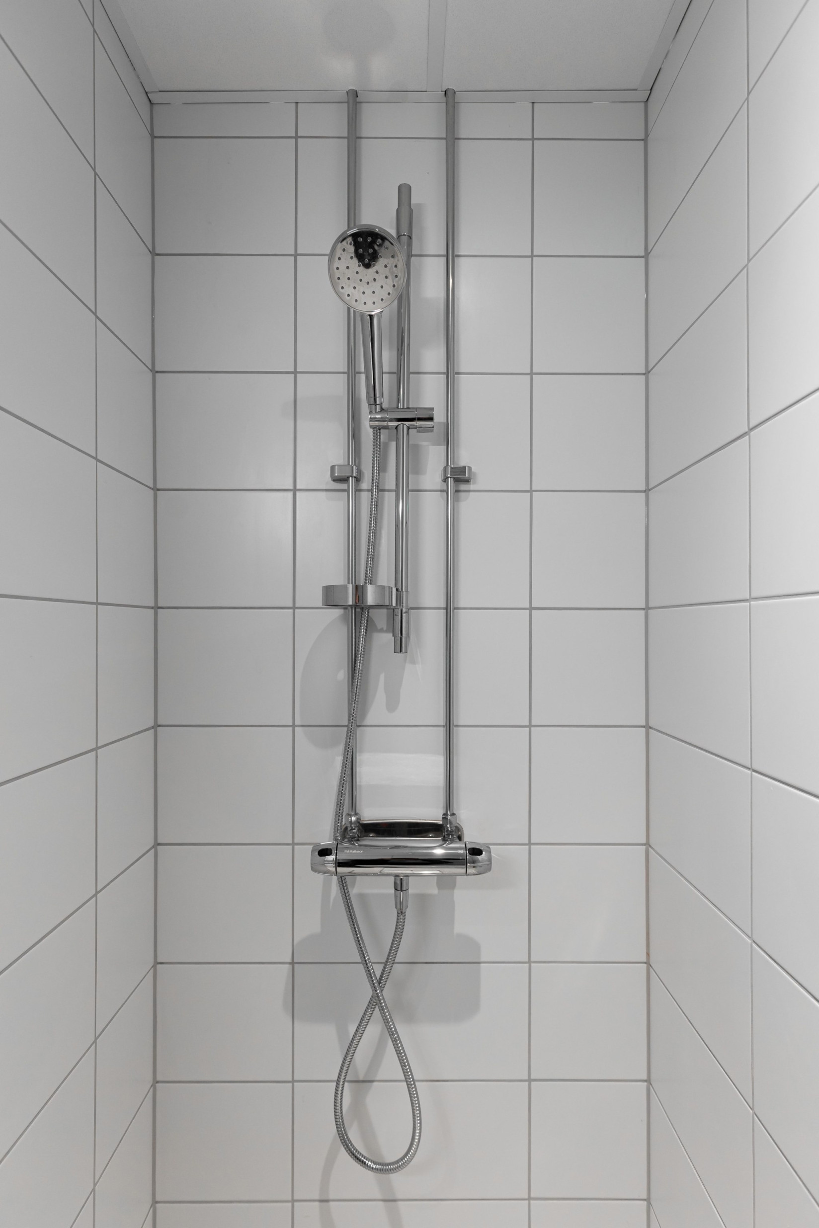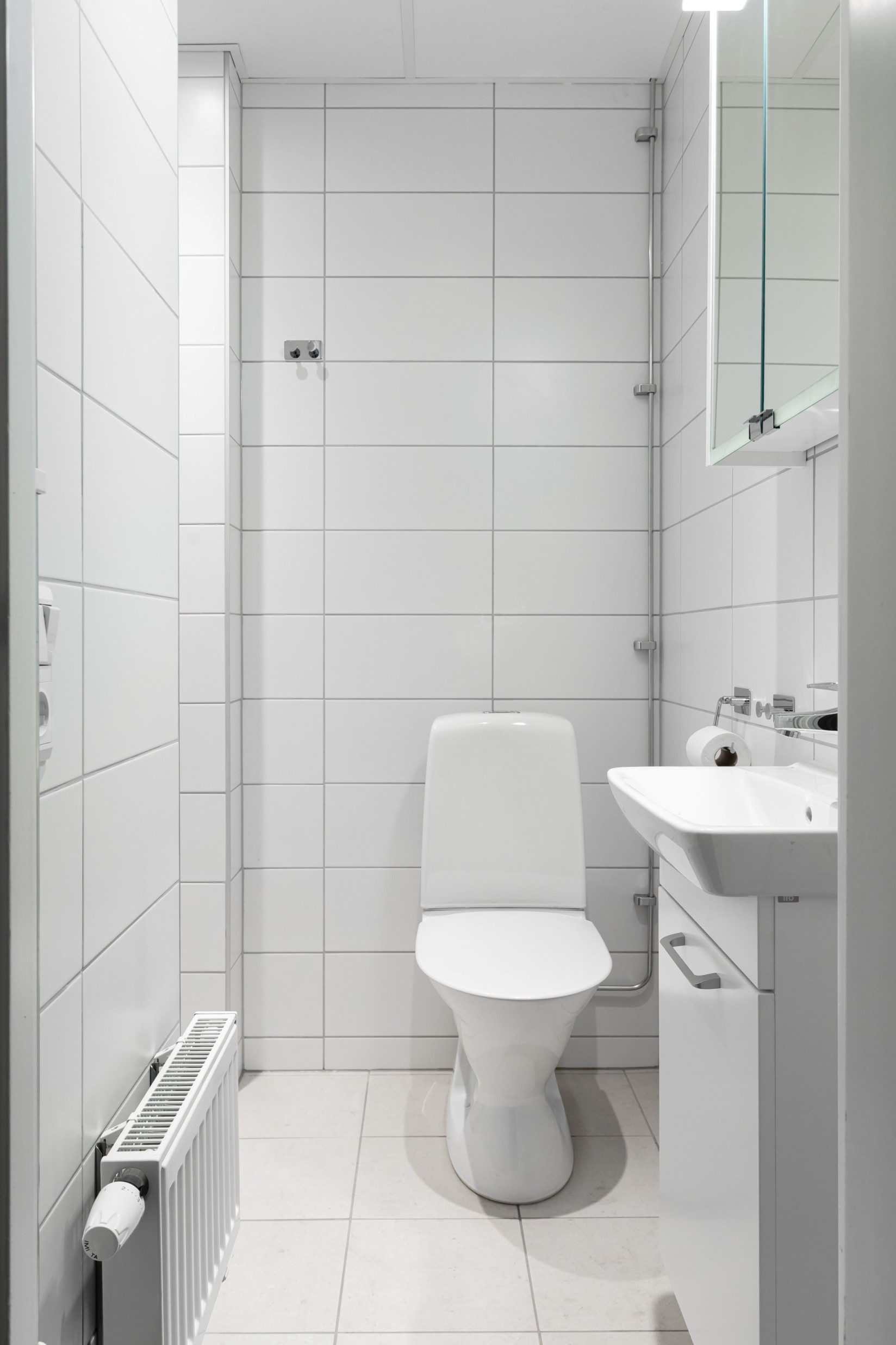 Till vänster från hallen finns det nyrenoverade, helkaklade badrummet med duschhörna, toalett samt kommod med handfat och spegelskåp.