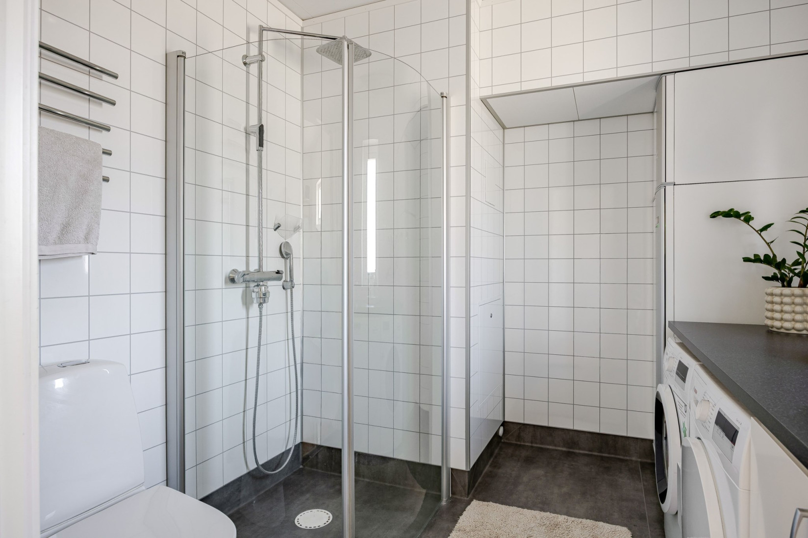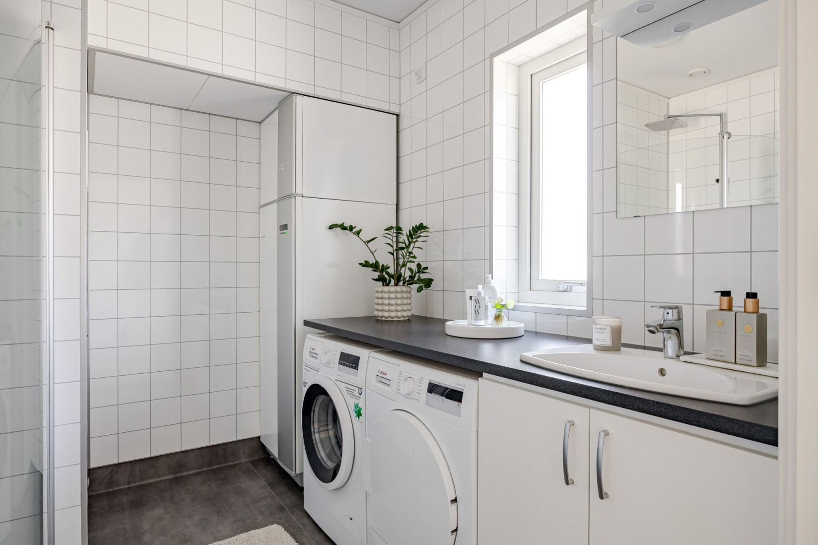 Till höger ligger det första av två badrum, utrustat med dusch, toalett, handfat och badrumsskåp. Här finns även en praktisk tvättmaskin och torktumlare med en bekväm arbetsbänk ovanpå.