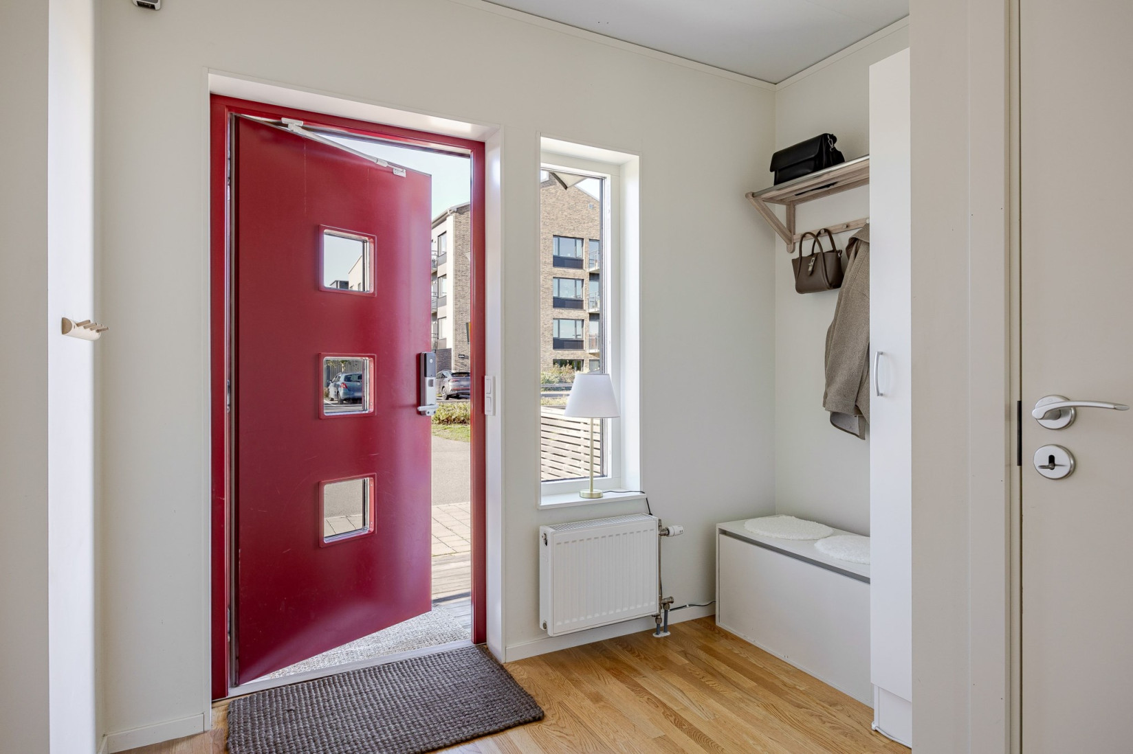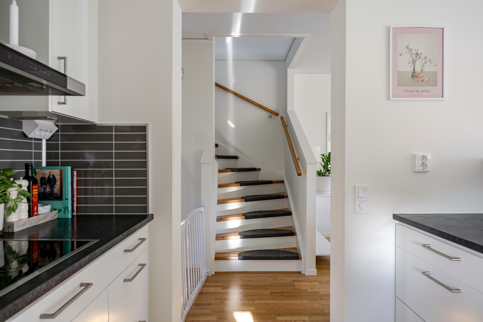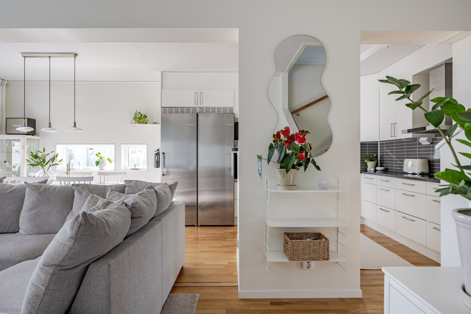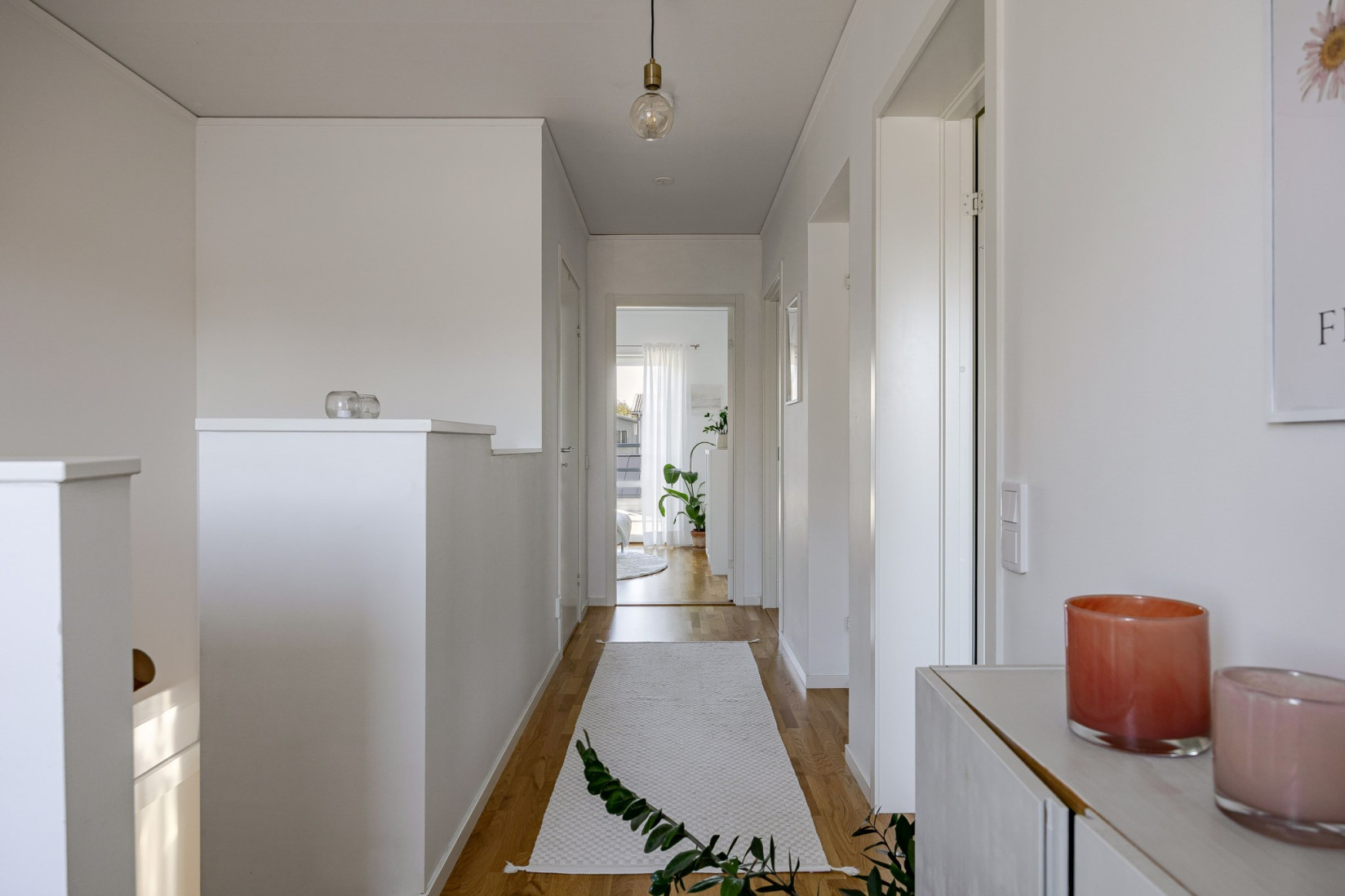 Din bil parkerar du smidigt på din egen uppfart längs bostadens sida, med plats för tre bilar – perfekt när vännerna är på besök! Från parkeringen är det bara några steg till ytterdörren, som öppnar upp till en inbjudande och ljus hall. Här löper parkettgolvet genom hela bostaden och skapar en enhetlig och varm känsla. Hallen har gott om utrymme för kläder och skor samt en rymlig städgarderob som bidrar till en välorganiserad vardag.