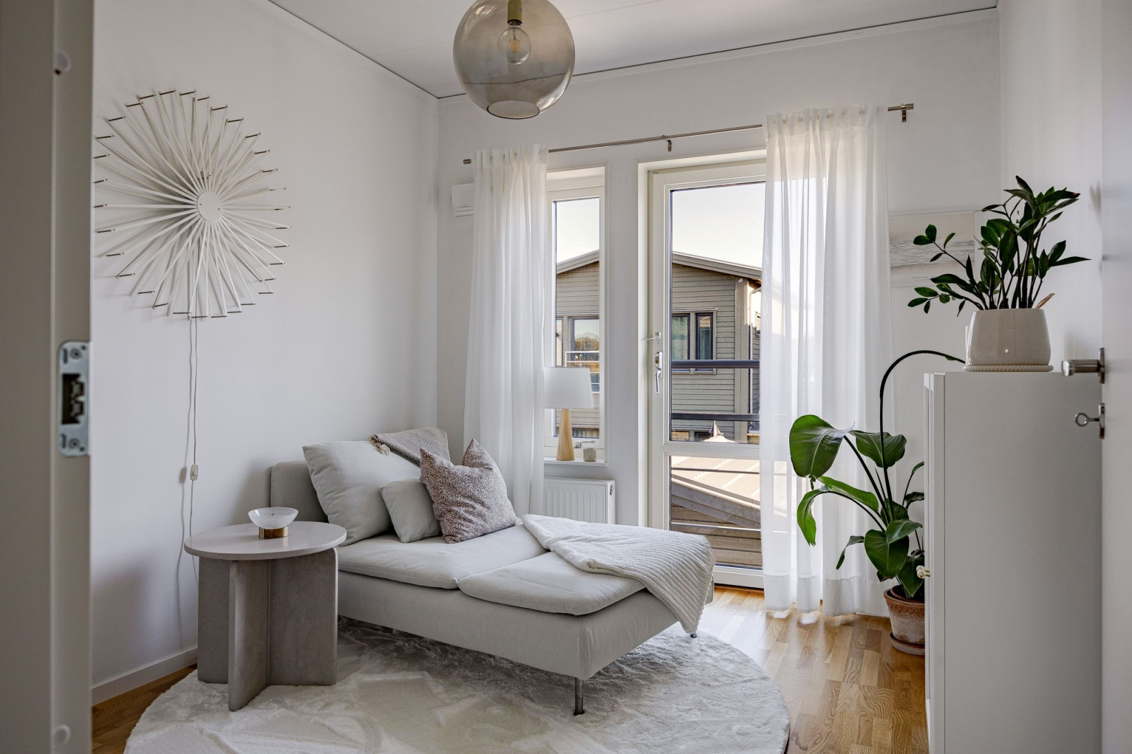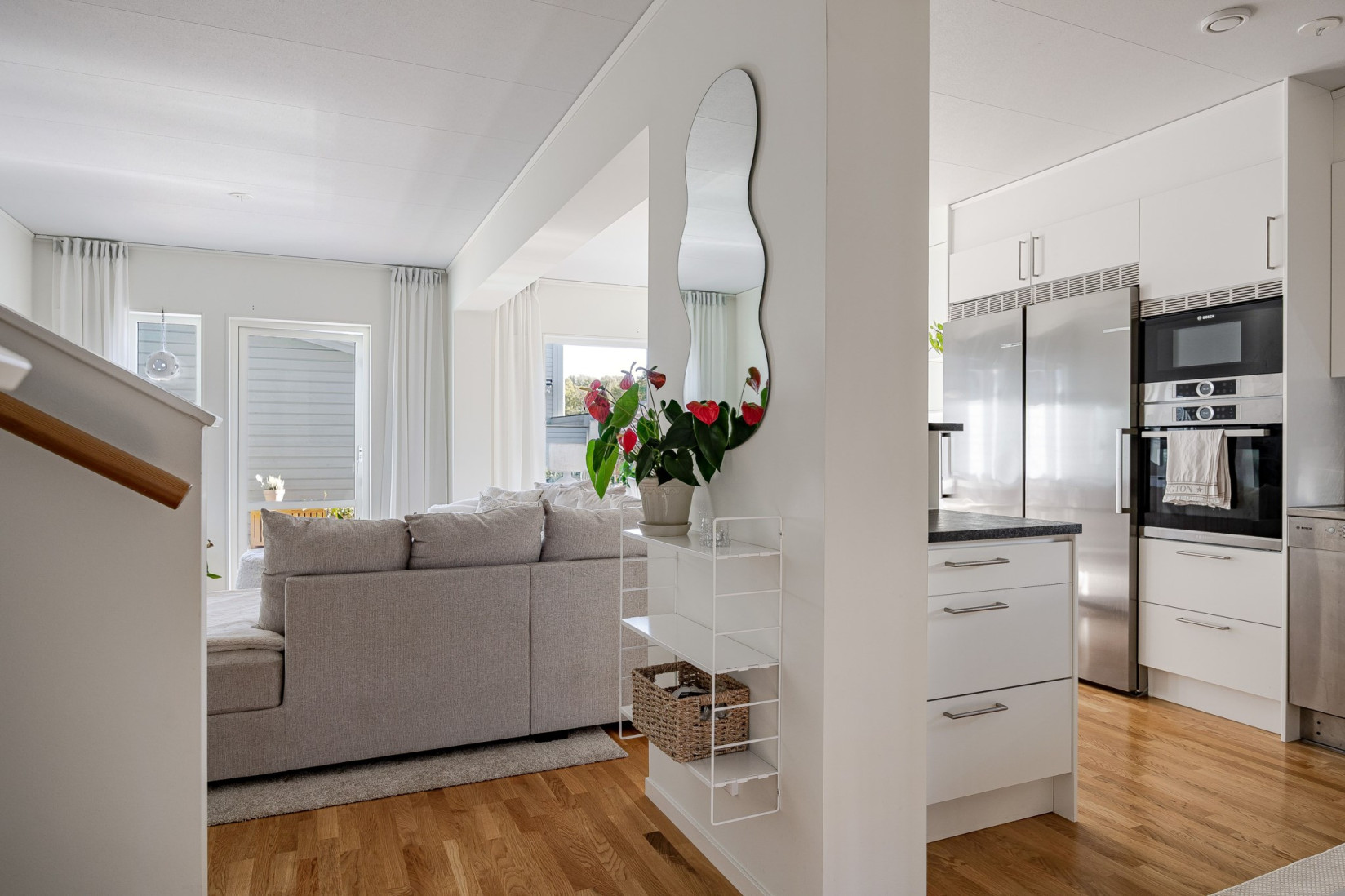 Köket är integrerat i en öppen planlösning mot vardagsrummet, vilket skapar en luftig och social miljö. Här finns gott om plats för en bekväm soffgrupp och TV-möblering – perfekt för avkoppling och umgänge.
