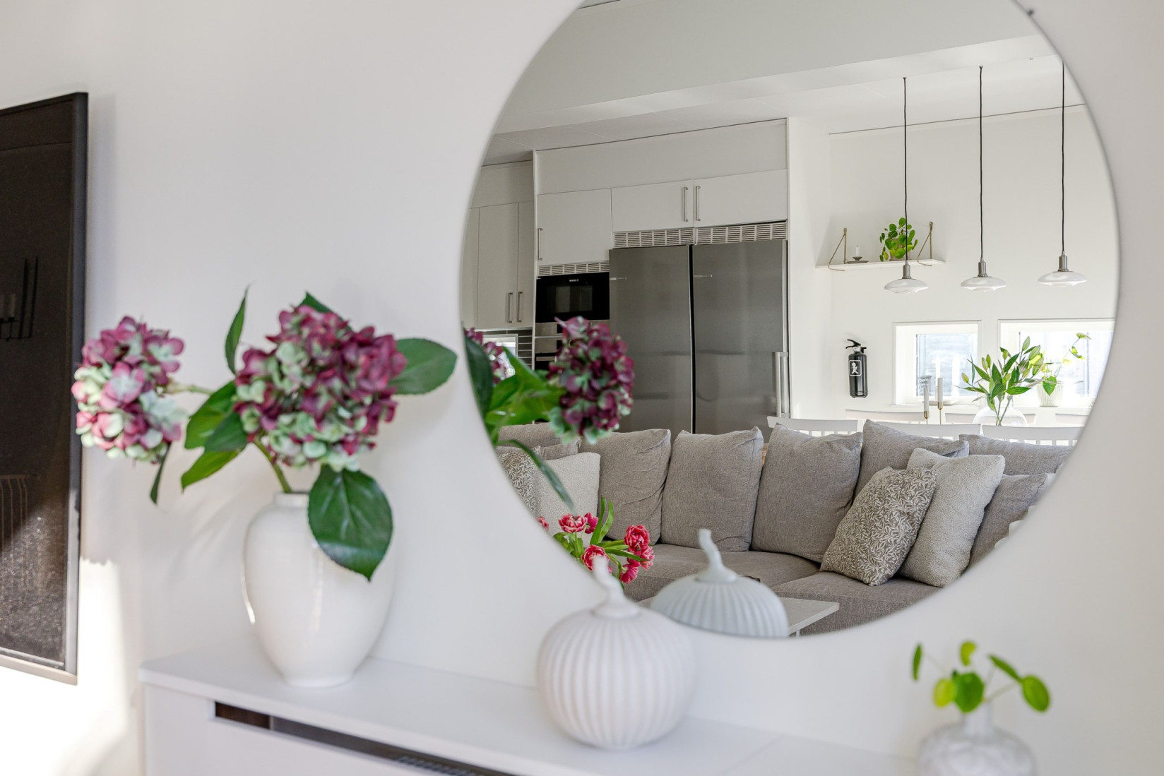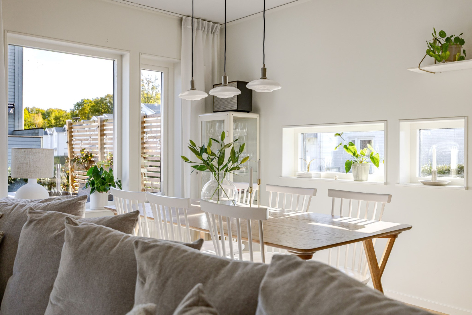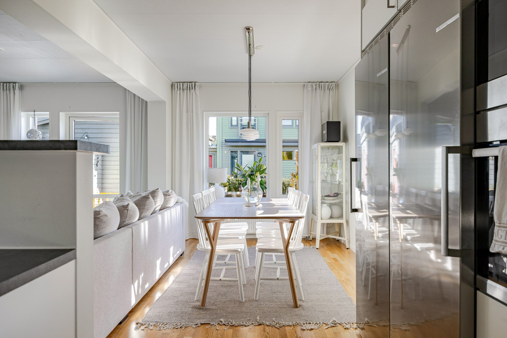 Vidare in i hemmet möts du av det öppna vardagsrummet och köket. Det moderna och hållbara köket erbjuder generösa förvaringsmöjligheter och är fullt utrustat med spishäll, fläkt, diskmaskin, inbyggnadsugn, mikrovågsugn samt en rymlig kyl och frys. Intill köksfönstret finns plats för ett matbord för upp till åtta personer, med utsikt över husets baksida.