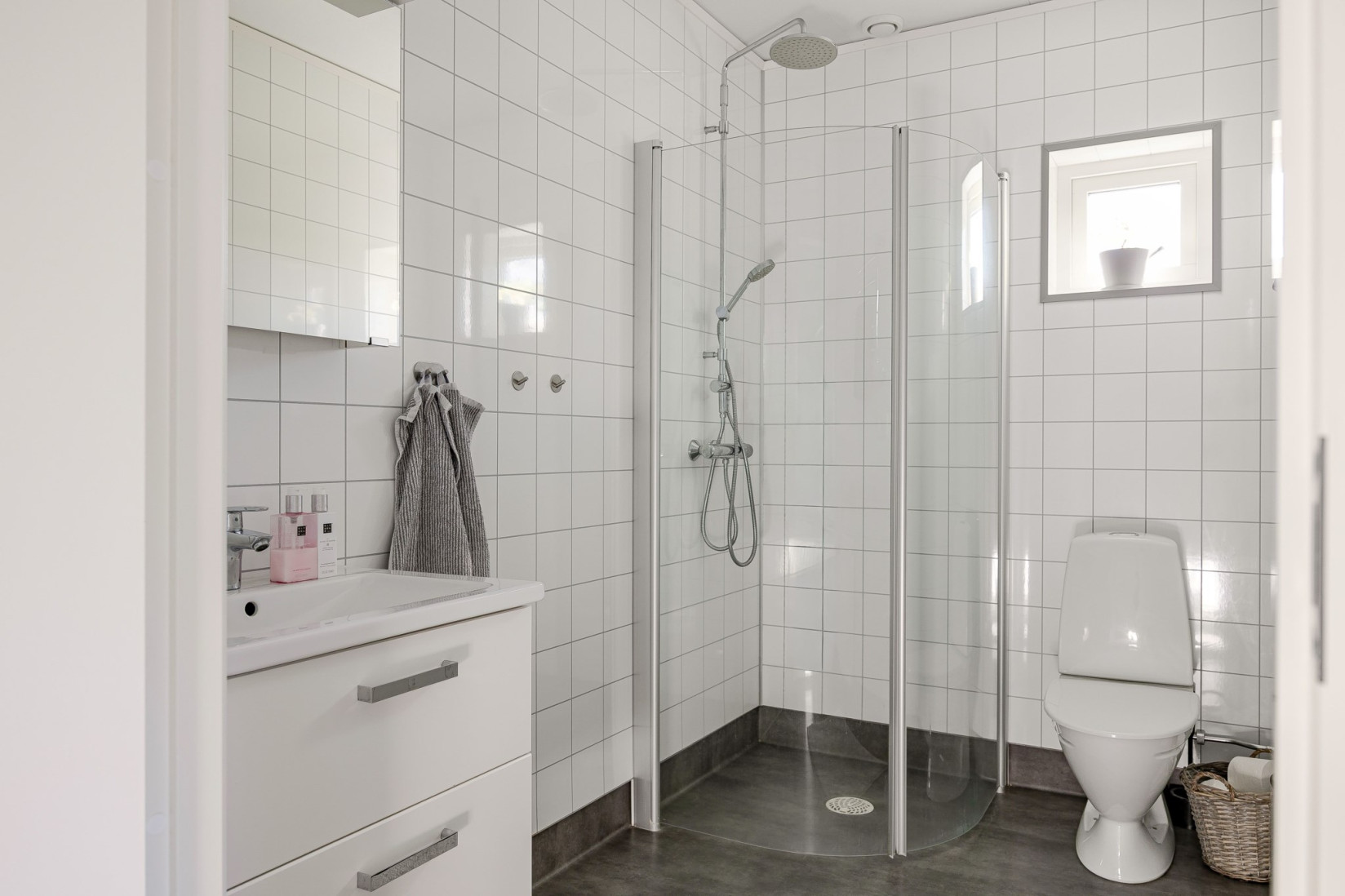 Badrummet på övervåningen är stilrent inrett med kaklade väggar och en mörk våtrumsmatta. Här finns dusch, toalett, handfat med kommod, spegelskåp samt ett fönster som släpper in naturligt ljus.