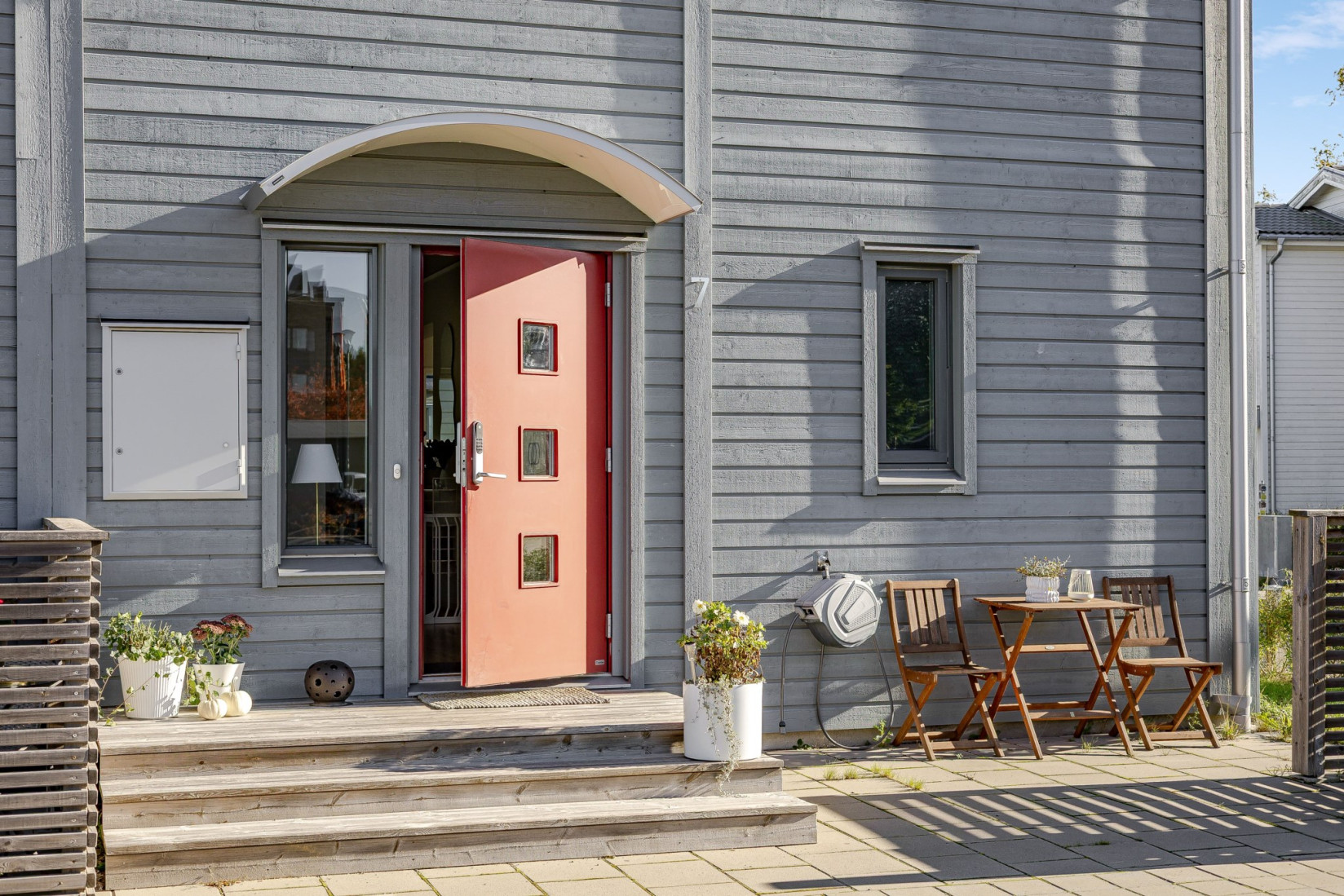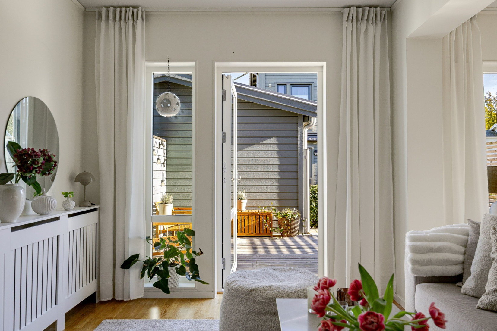 Från vardagsrummet når du direkt ut till altandäcket, där det finns plats för loungegrupp och grill – en idealisk plats för långa sommarkvällar. Den angränsande gräsmattan ger utrymme för lek och andra aktiviteter. Precis nedanför uteplatsen finns ett praktiskt förråd för trädgårdsredskap.