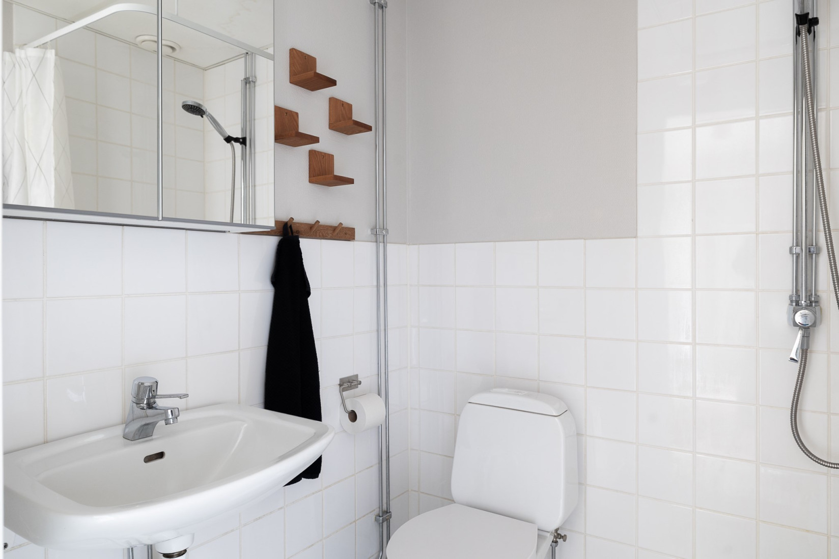 Badrummet är delvis kaklat. Här möts du av neutrala färg- och materialval. I badrummet finns dusch, toalett, handfat, spegelskåp och handdukstork.