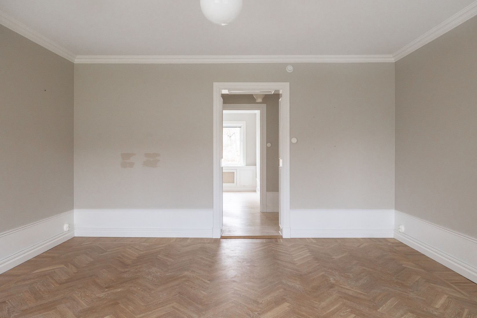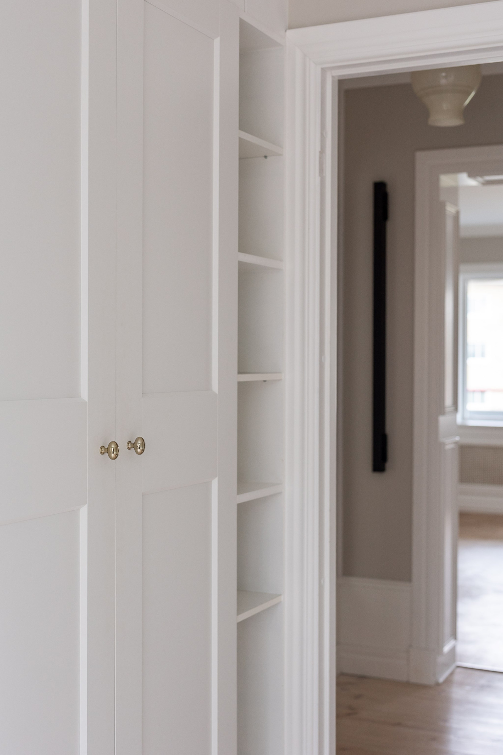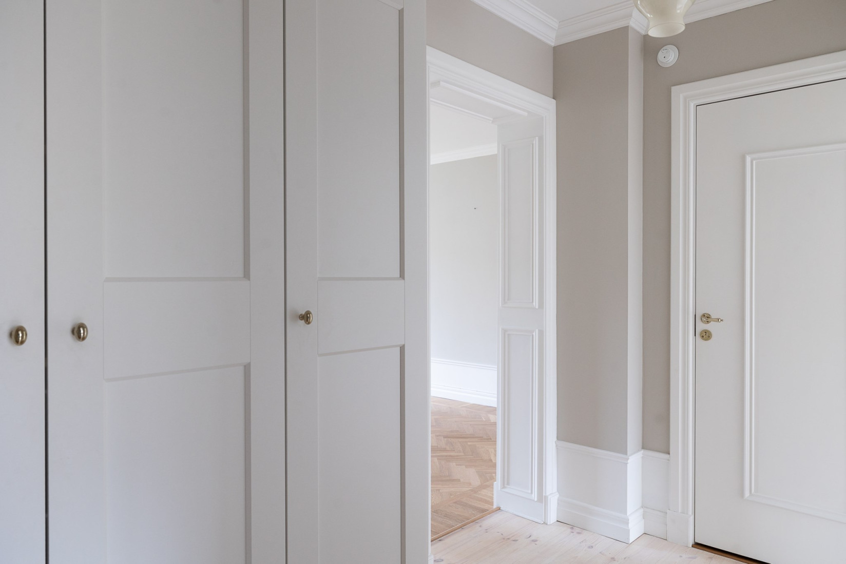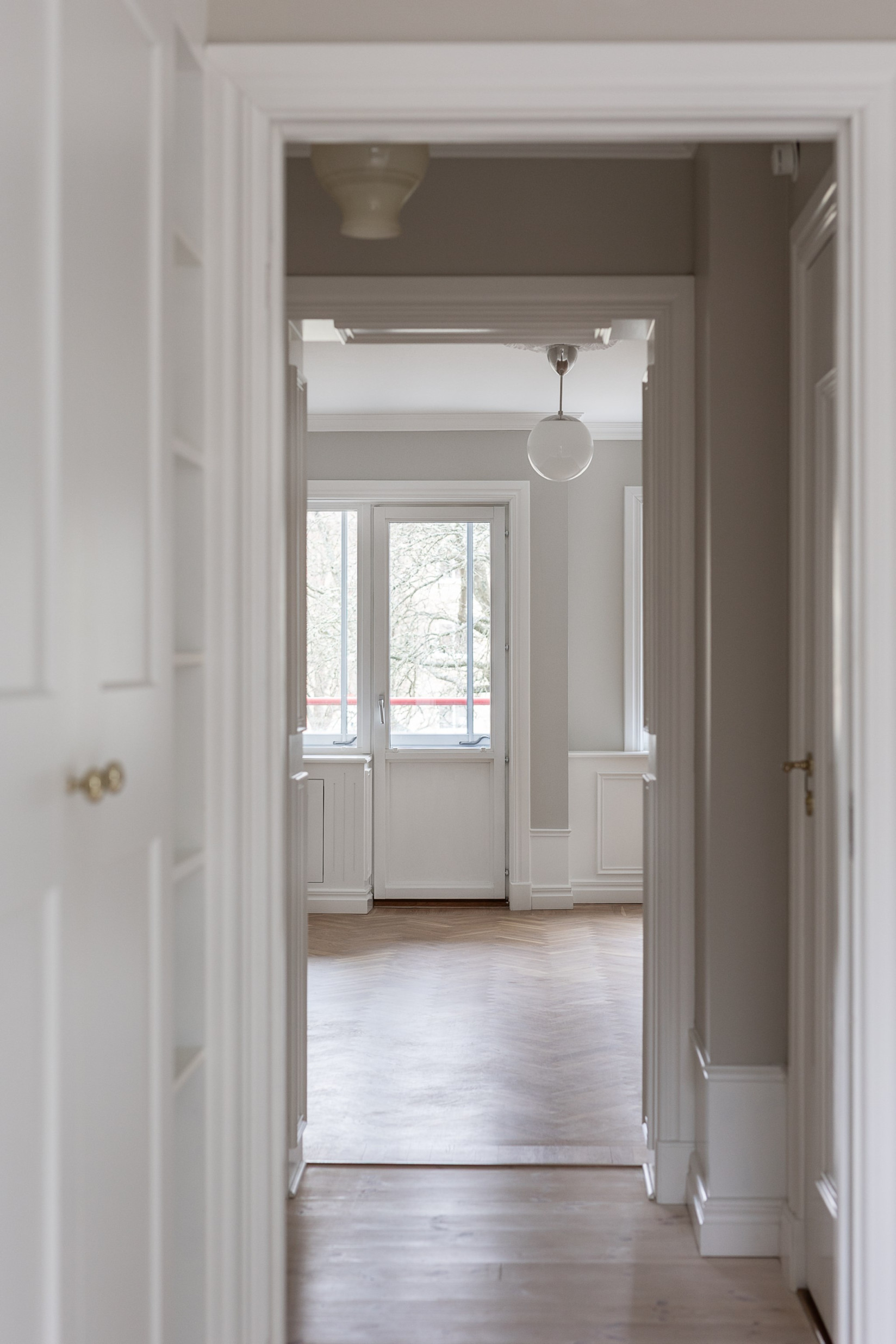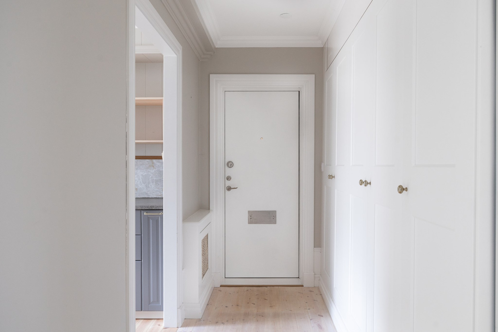 Optimalt placerad i huset, med endast några få trappsteg till ytterdörren men fortfarande lagom högt upp för att slippa besvärande insyn. Stig på. Du möts av en ljus hall. Titta ner och upptäck det vackra golvet. Ljust plankgolv. Ett golv som möter oss i alla rum förutom i vardagsrummet. Behagliga färgtoner, höga golvsocklar och en detaljrikedom som imponerar. Hallen sätter helt klart ribban för detta besök. Längs med långsidan följer fem garderober med knoppar i mässing. De tråkiga nätverkssladdarna är gömda bakom det platsbyggda skåpet.