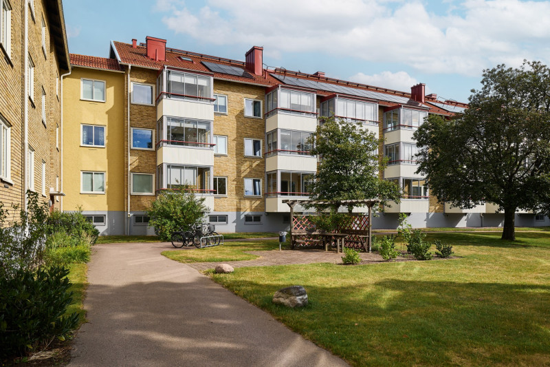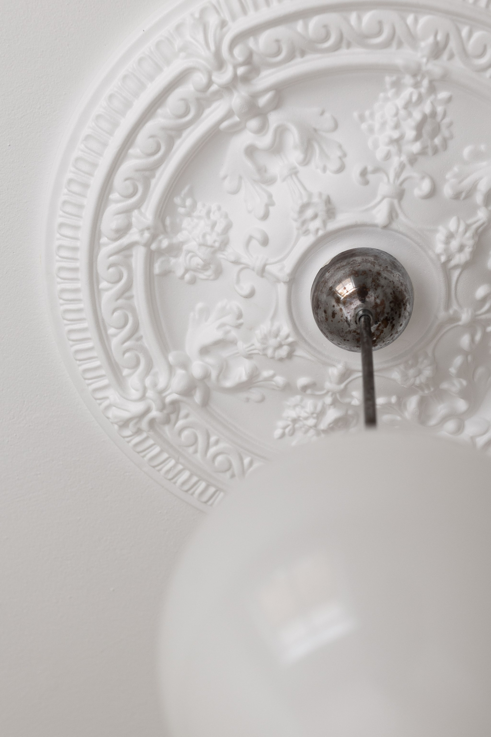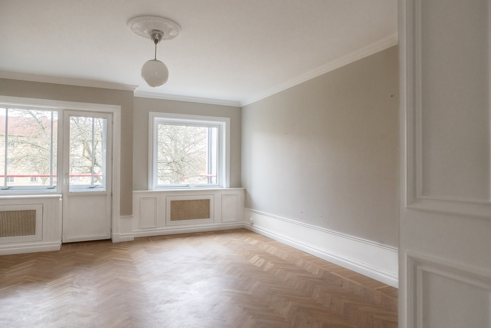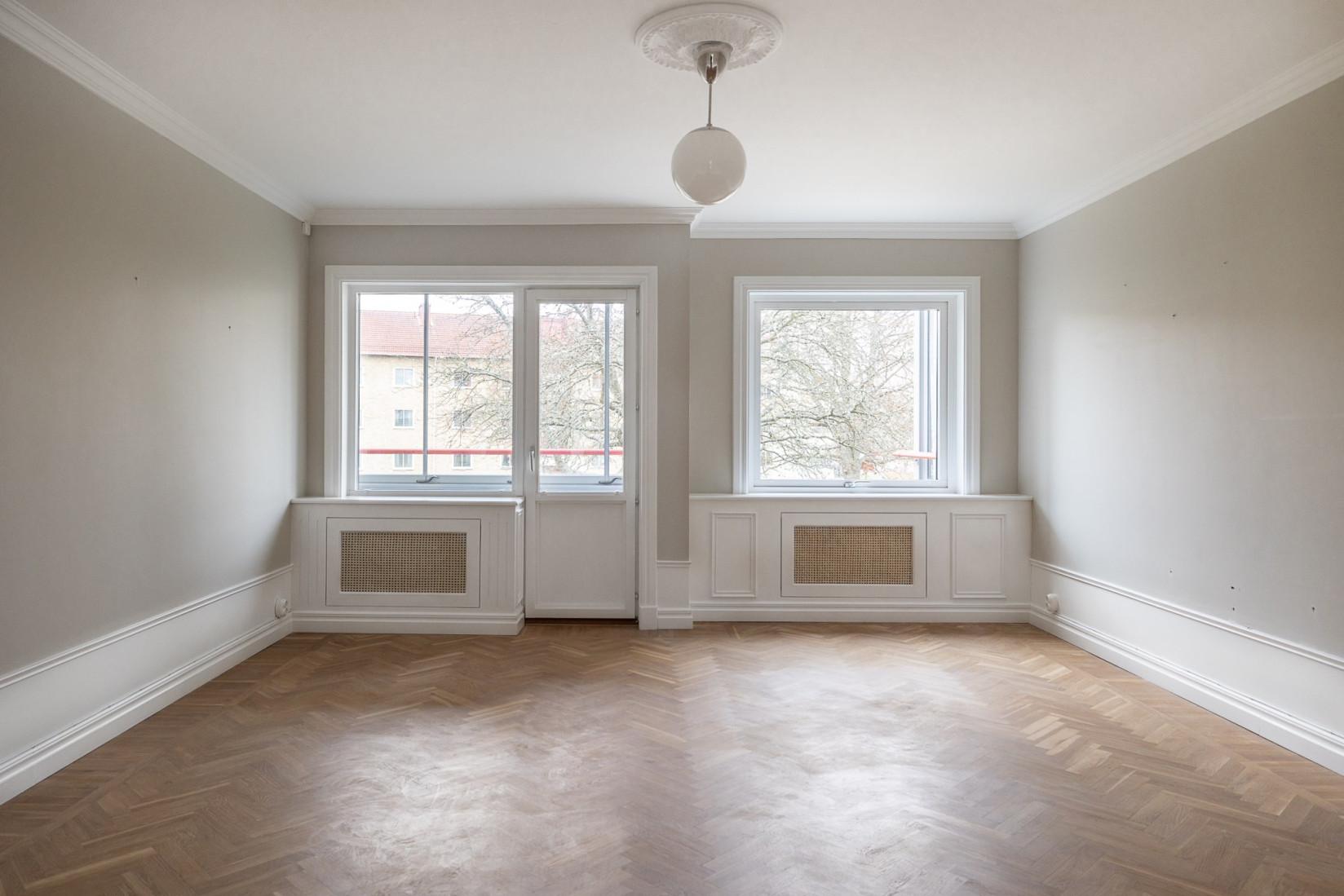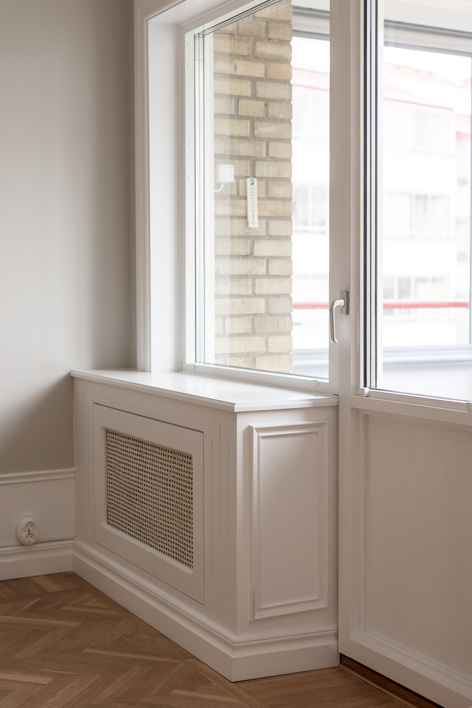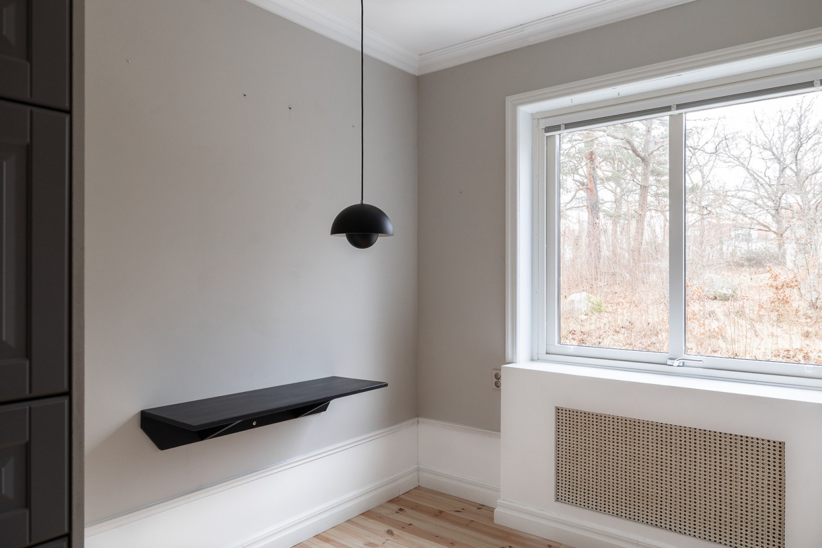 Optimalt placerad i huset, med endast några få trappsteg till ytterdörren men fortfarande lagom högt upp för att slippa besvärande insyn. Stig på. Du möts av en ljus hall. Titta ner och upptäck det vackra golvet. Ljust plankgolv. Ett golv som möter oss i alla rum förutom i vardagsrummet. Behagliga färgtoner, höga golvsocklar och en detaljrikedom som imponerar. Hallen sätter helt klart ribban för detta besök. Längs med långsidan följer fem garderober med knoppar i mässing. De tråkiga nätverkssladdarna är gömda bakom det platsbyggda skåpet.