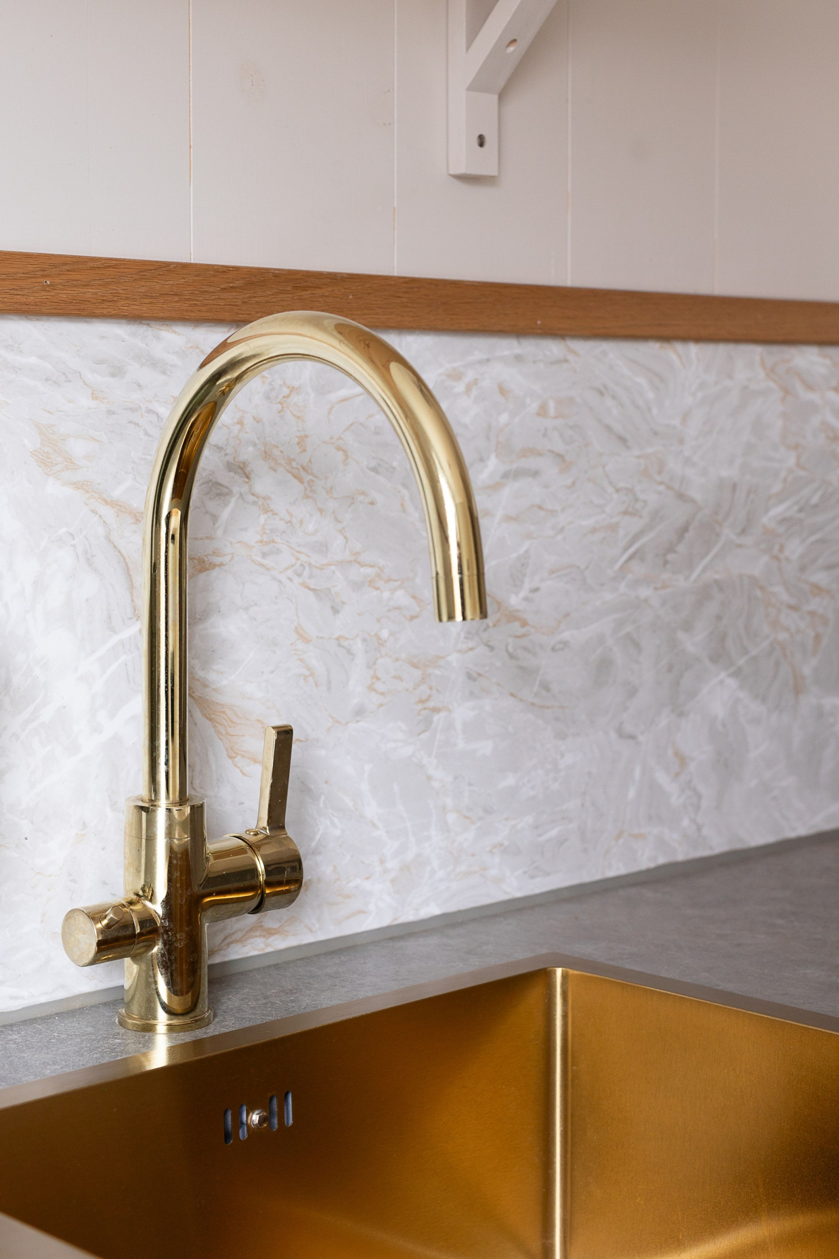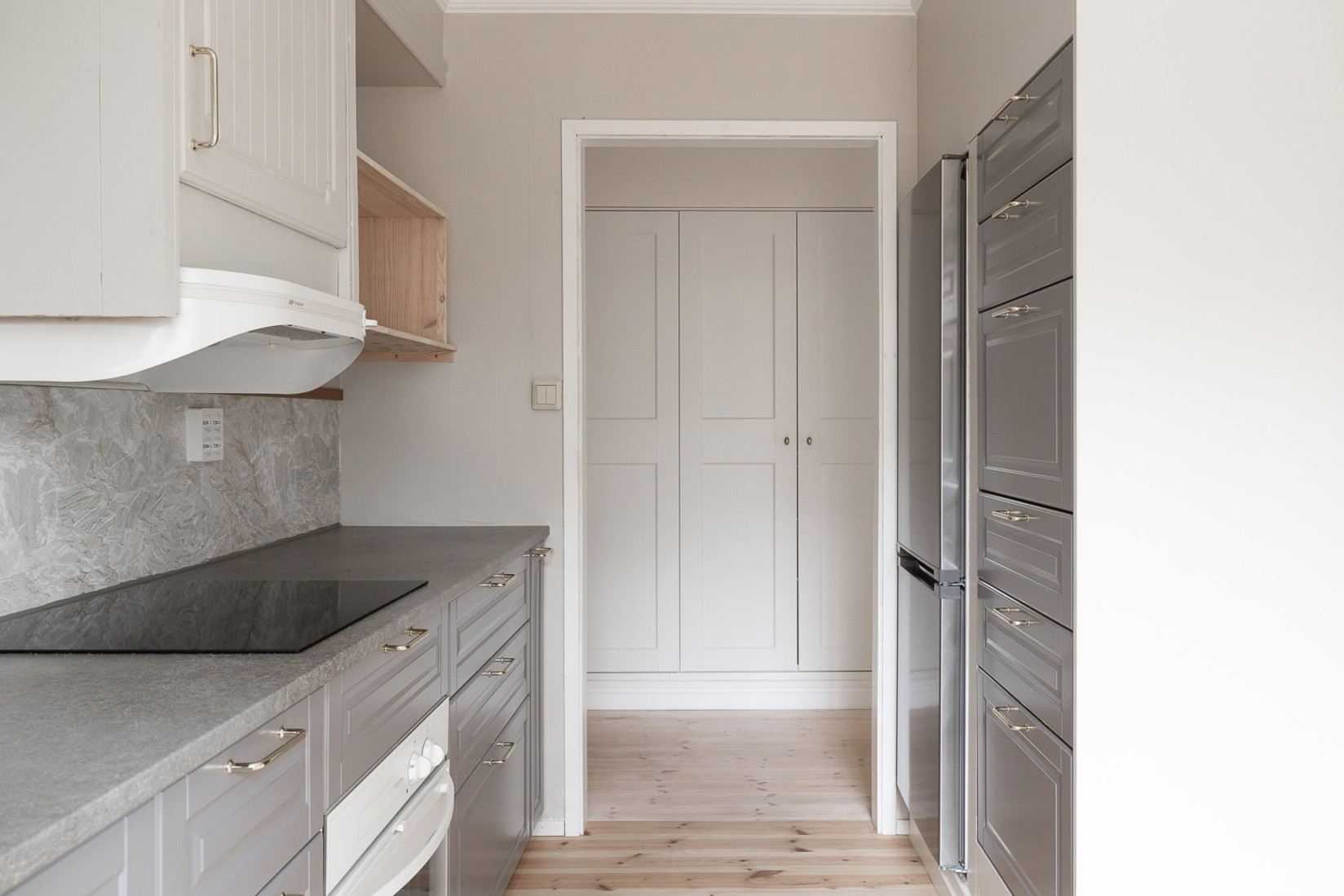 Med en högersväng når vi köket. Smakfullt, nytt och modernt. Du möts av profilerade luckor i grått. Handtag i mässing och en maskinpark som heter duga! Det här är ett rum att trivas i! Stort fönsterparti i blickfånget med vy över intilliggande skog. Gott om arbetsytor. Förvaringen är inte att klaga på. Du får plats med alla kastruller, grytor och pannor. En självklar matplats intill nyss nämnda fönsterparti. Den maskinella utrustningen består av fläkt, ny induktionshäll, ny kyl/frys, diskmaskin och inbyggd ugn. De ljusa golven är nylagda och elementskyddet måttanpassat. Att uppskatta är kökets storlek och utformning. Det är verkligen ett plus att man kan vara fler i köket. Samla vännerna runt matbordet medan du lagar maten. Alla får plats!