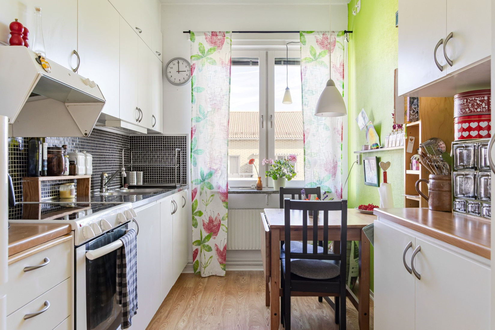 Längre intill vänster ligger ett kök med vit köksinredning. Plats för matbord och fönster som vetter mot husets baksida. Den maskinella utrustningen består av kyl/frys, fläkt och spis med häll.