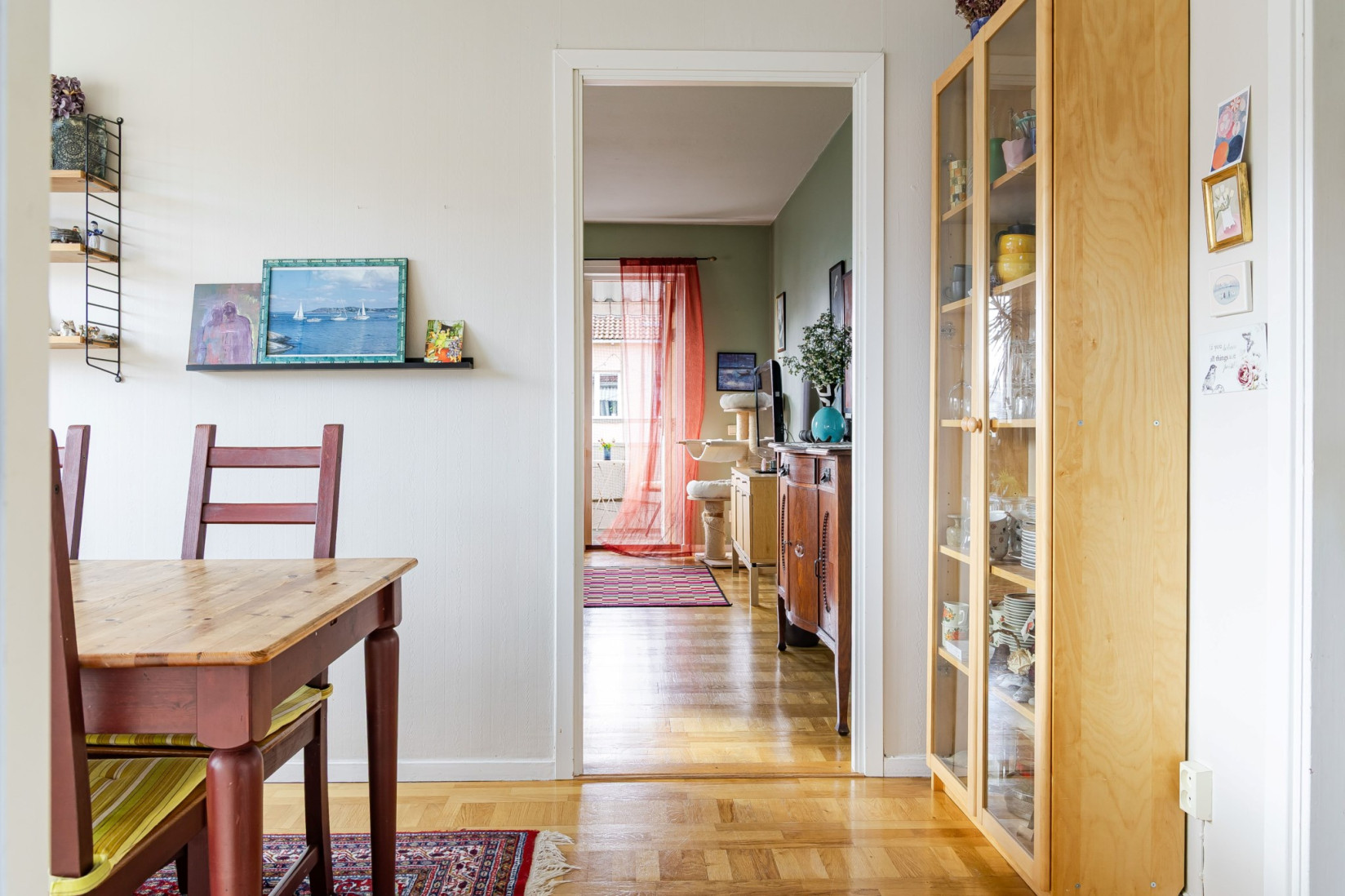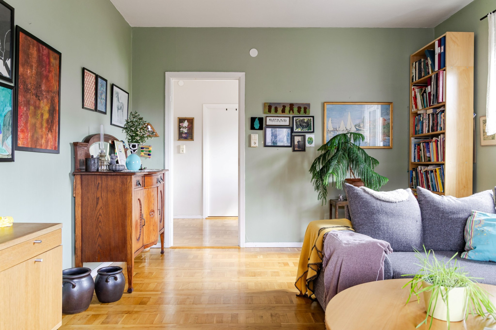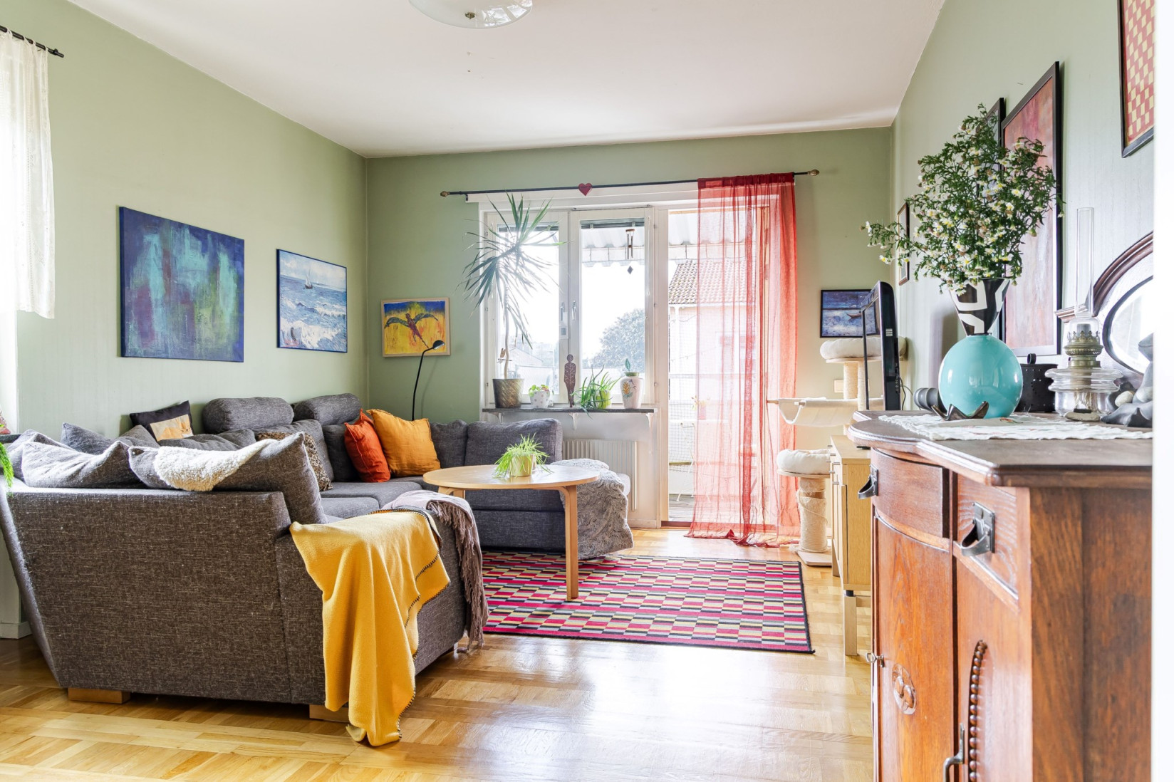 Till höger från mellanrummet ligger ett vardagsrummet med fönster åt två hål vilket ger ett härligt ljus. Vidare från vardagsrummet kommer man ut till en balkong i väster med eftermiddags- och kvällssol.