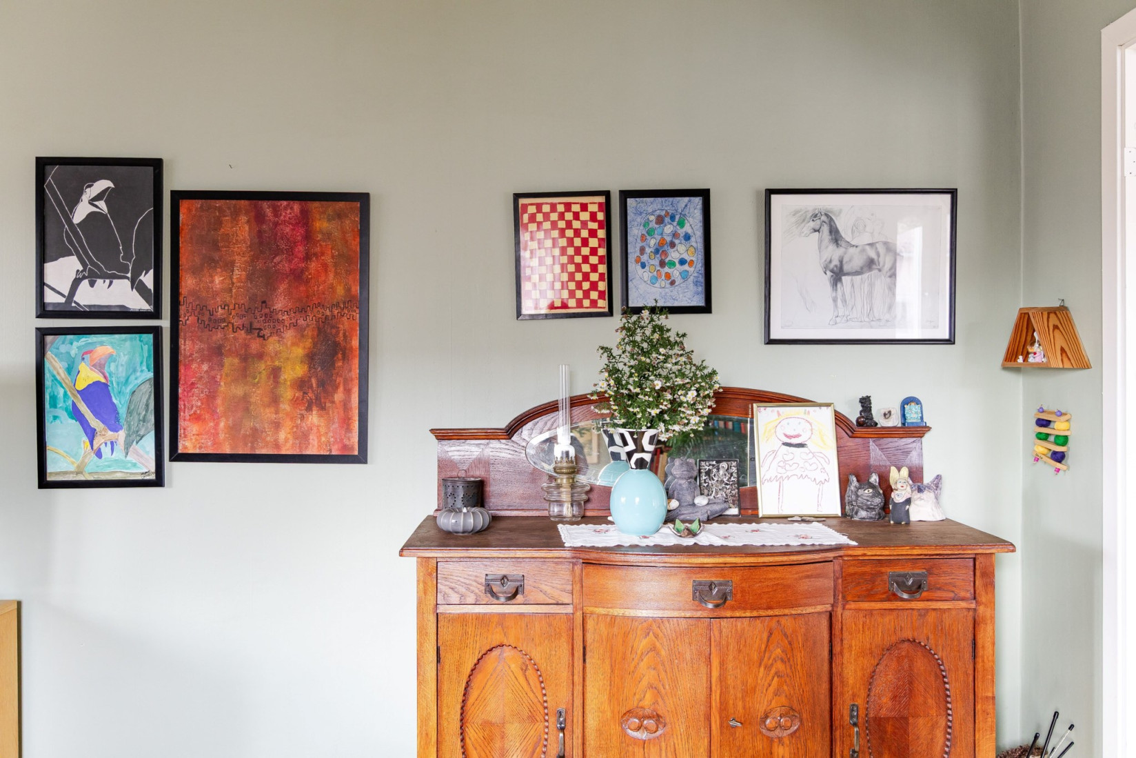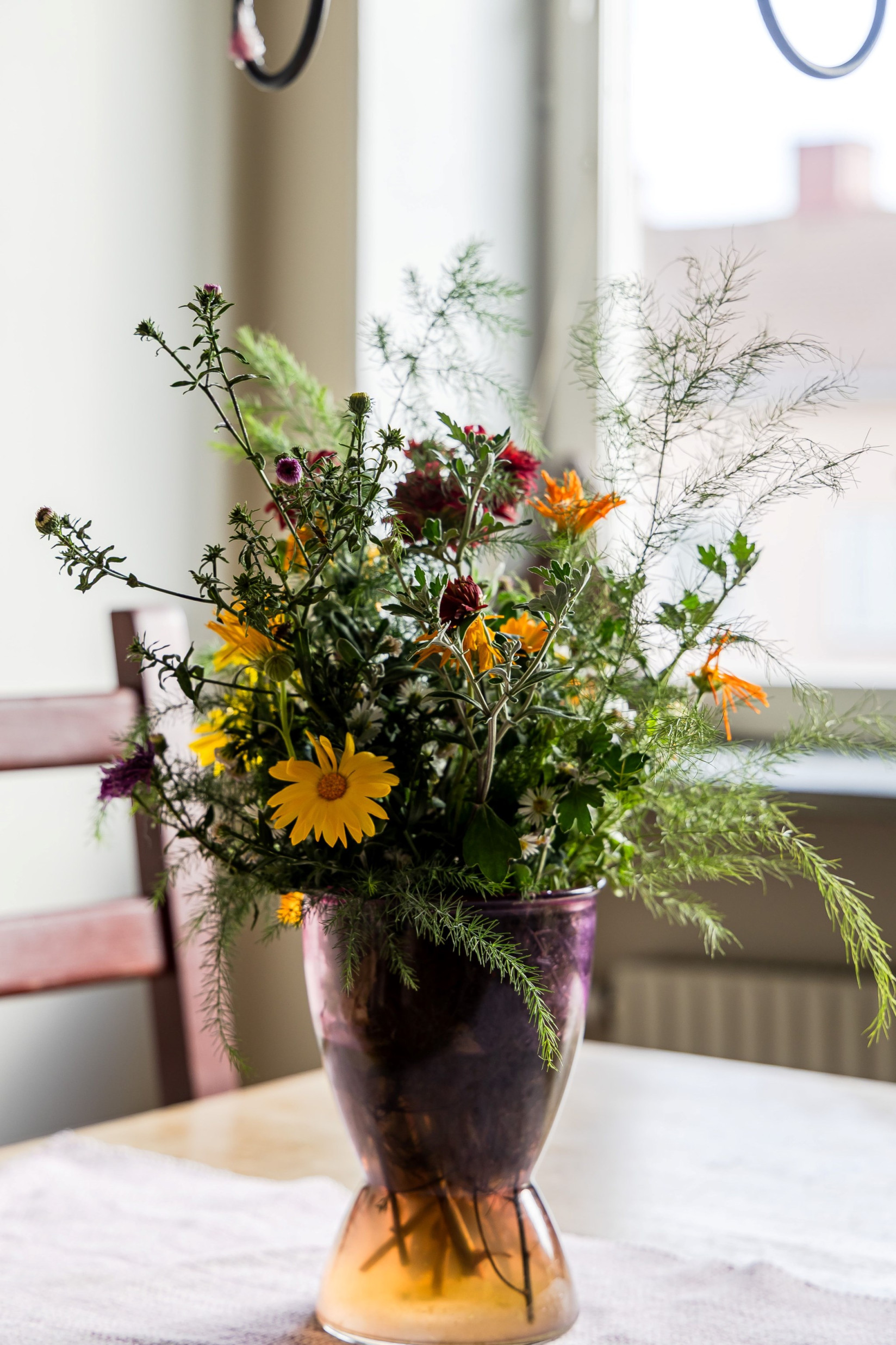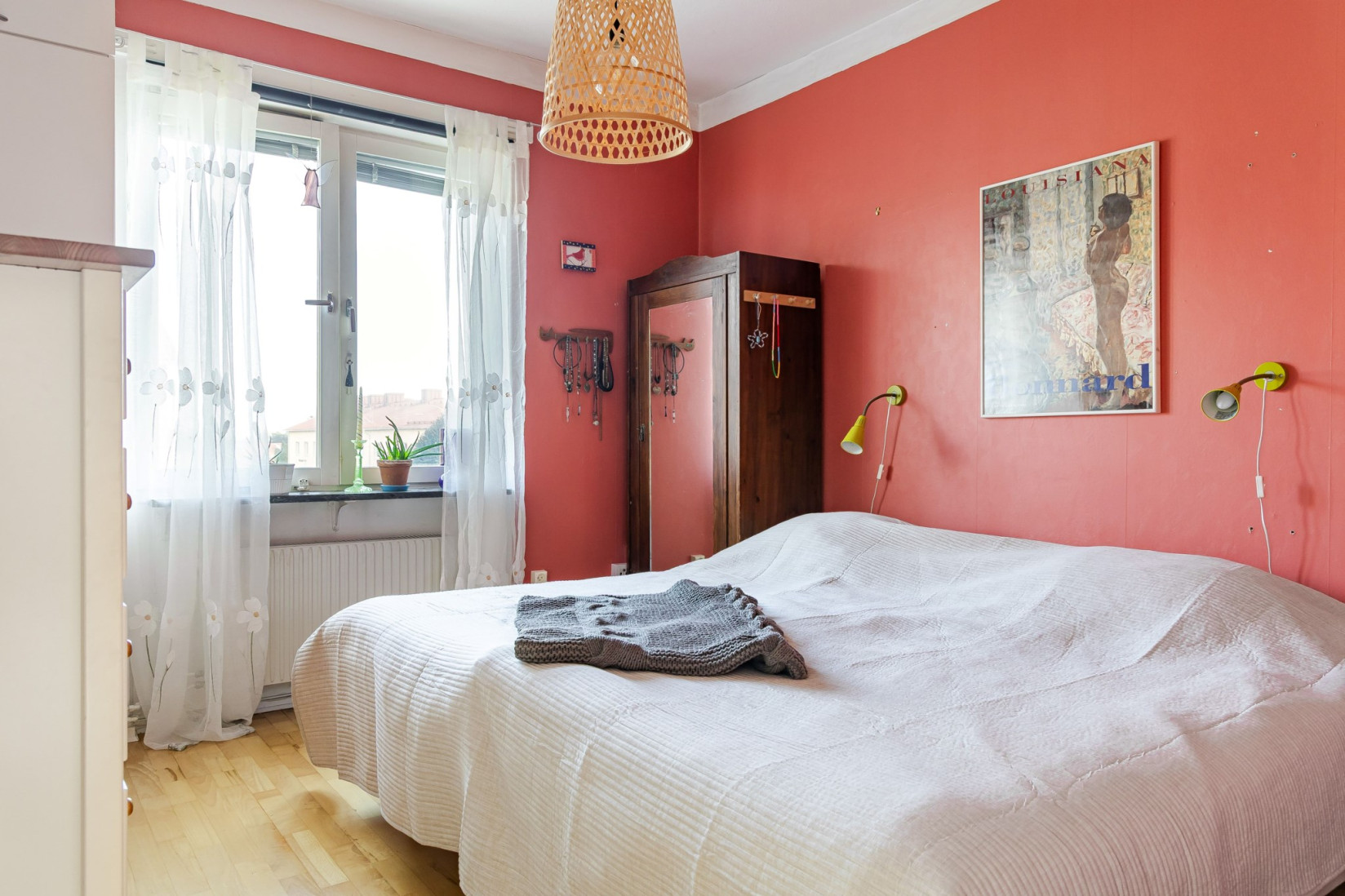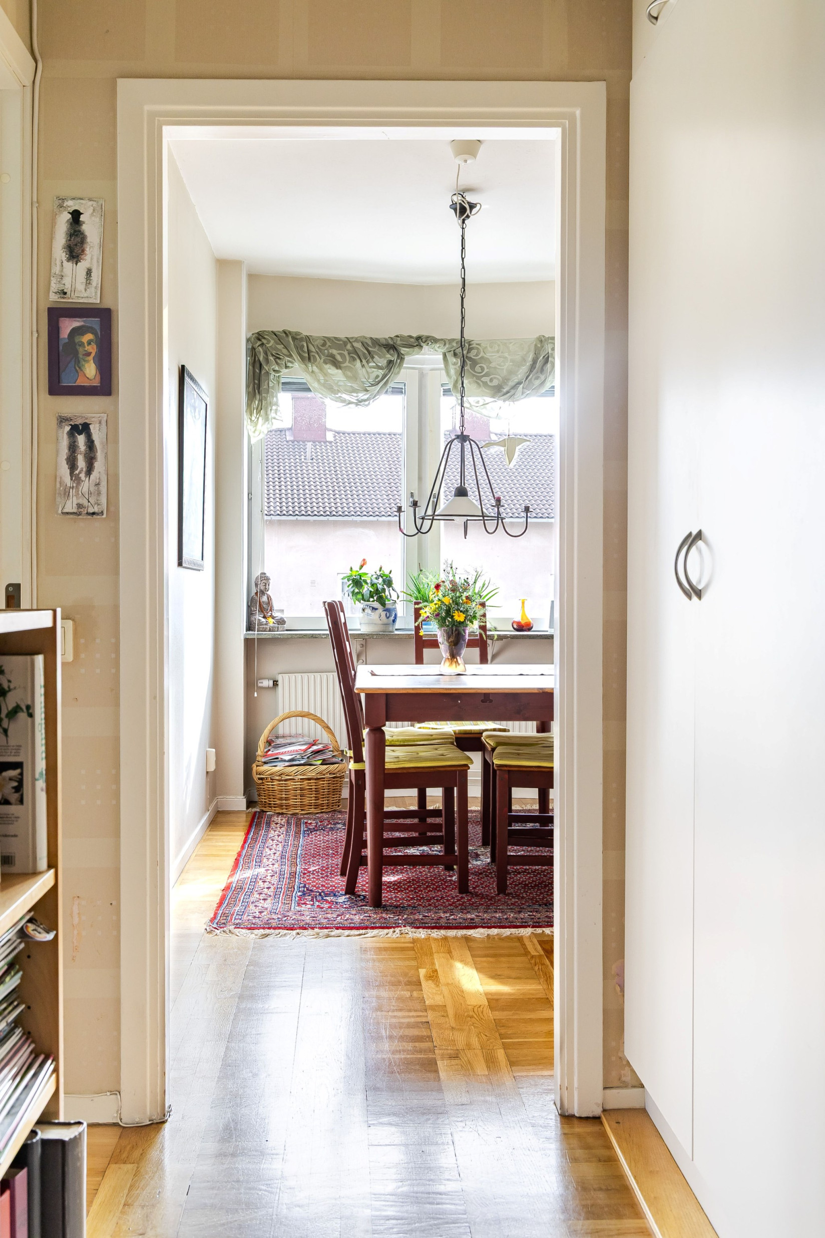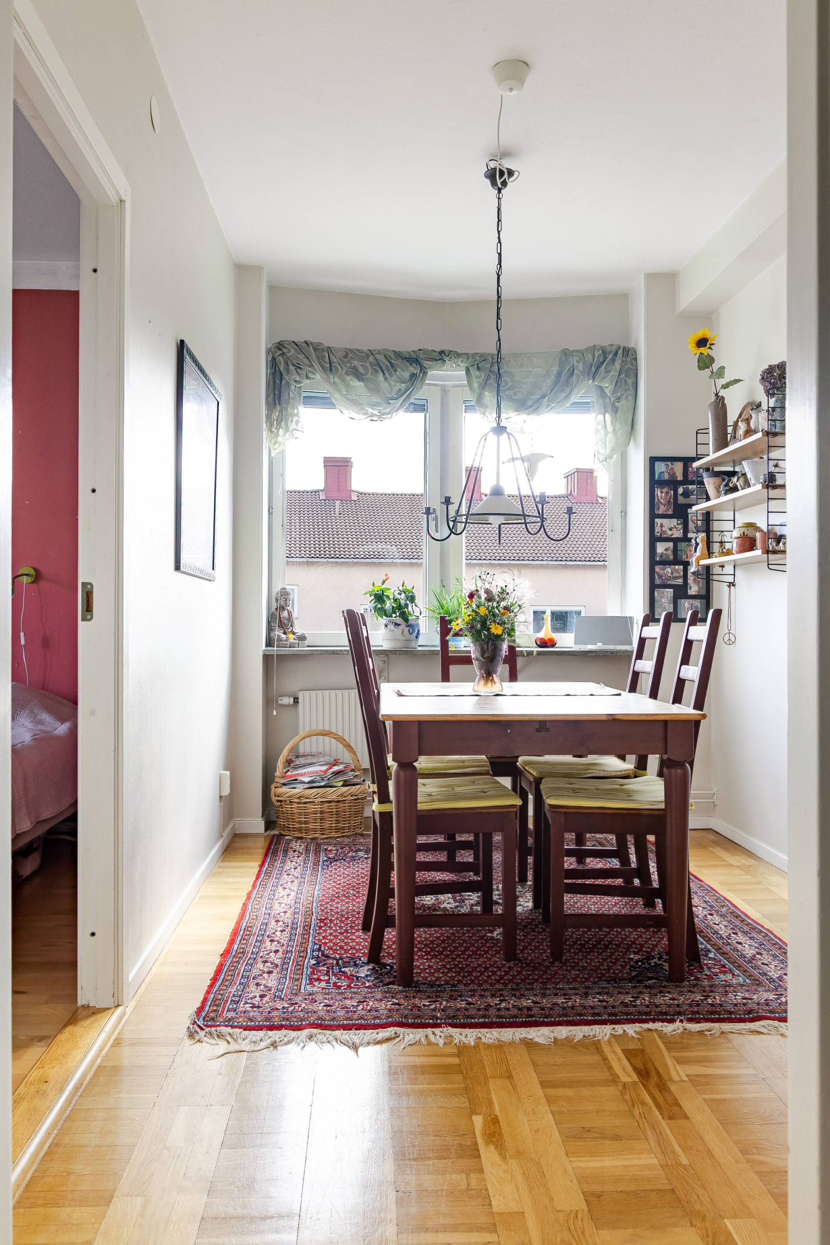 Rakt fram öppet från hallen ligger ett mat-/sovrum/kontor med originalgolv och vackert burspråk med stenskiva för blomsterprakten.