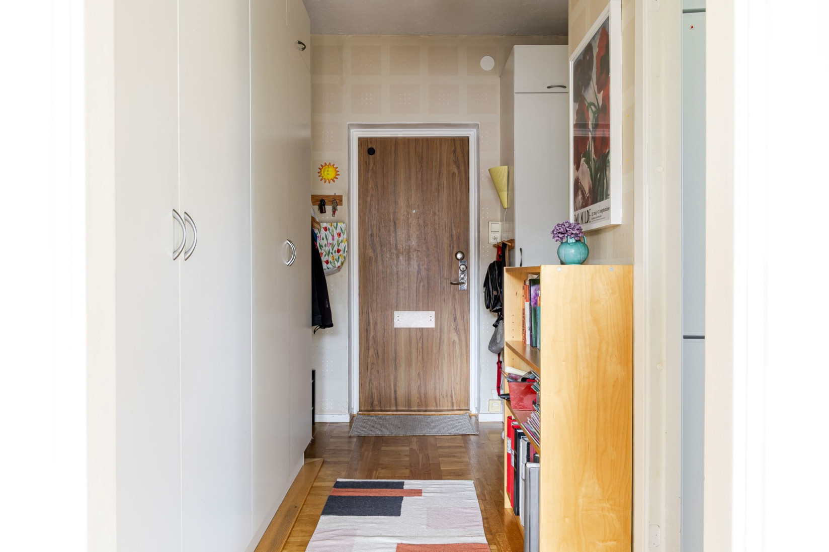 När du tagit hissen upp till tredje våningen välkomnas du en en hall som inrymmer garderober med överskåp.