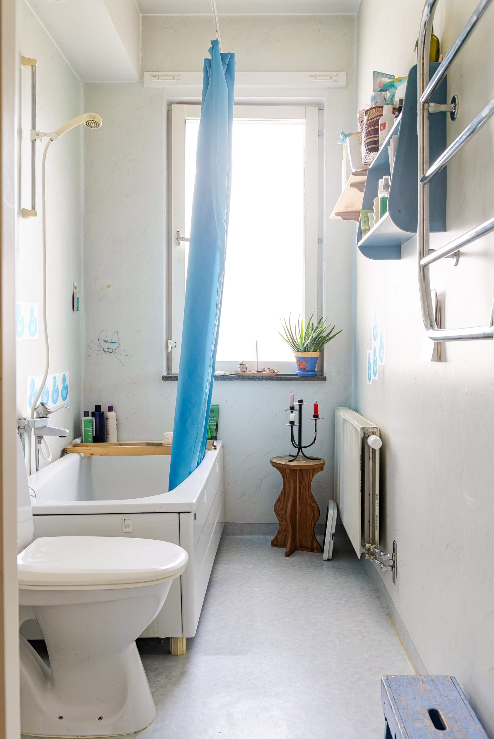 Till vänster i hallen ligger ett badrum med matta på golv och väggar. Har finns badkar, kommod, wc och spegelskåp.