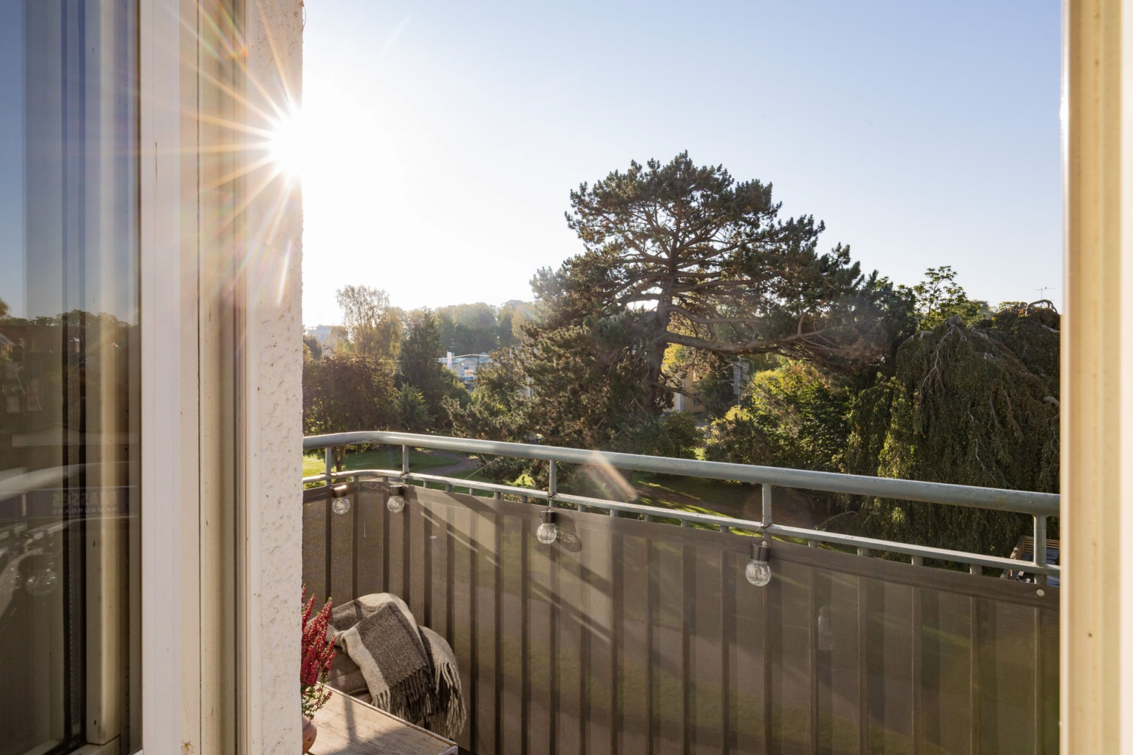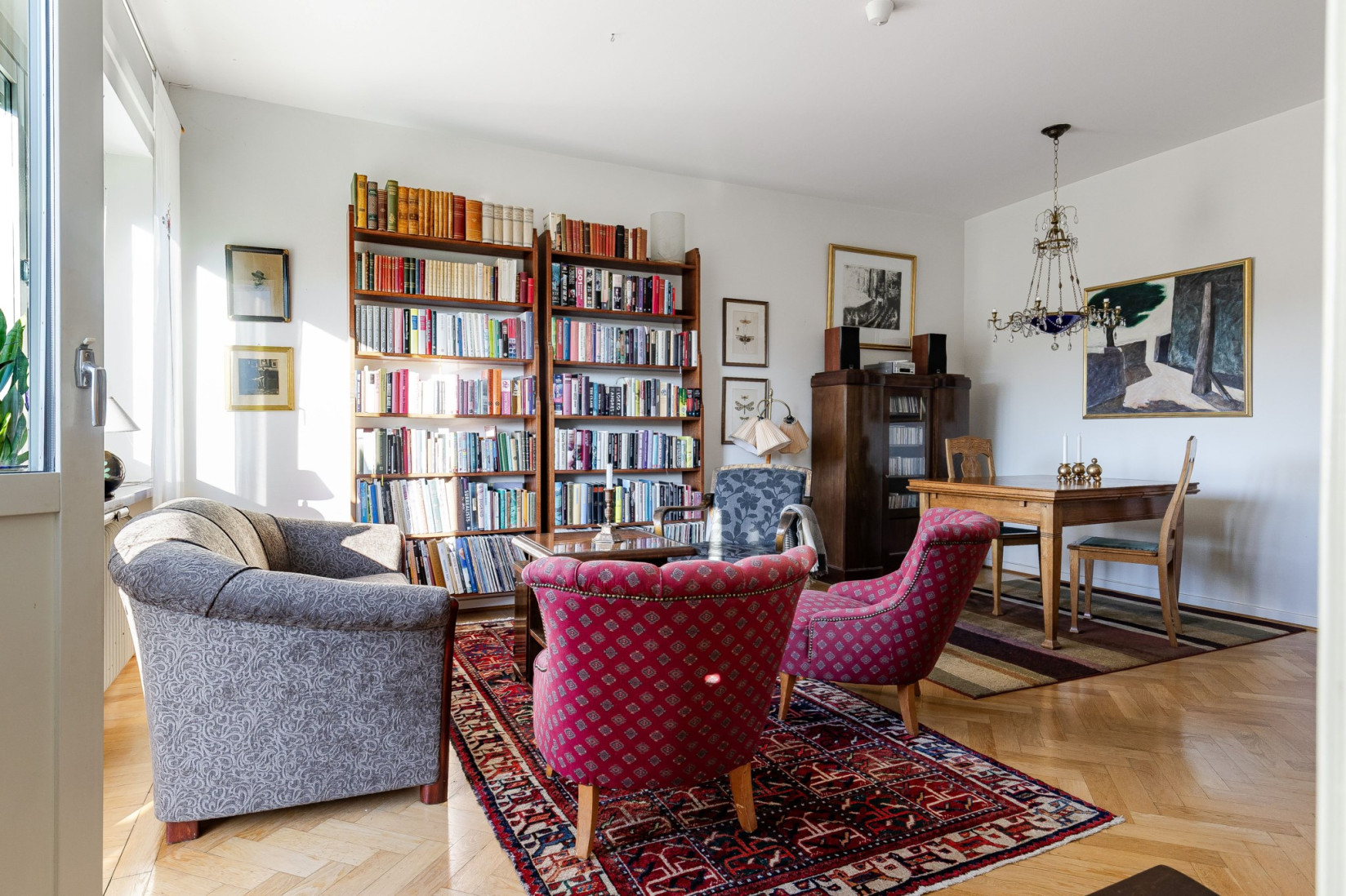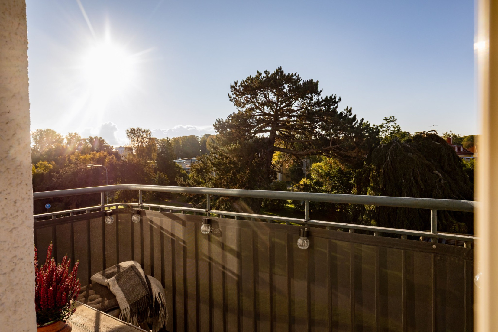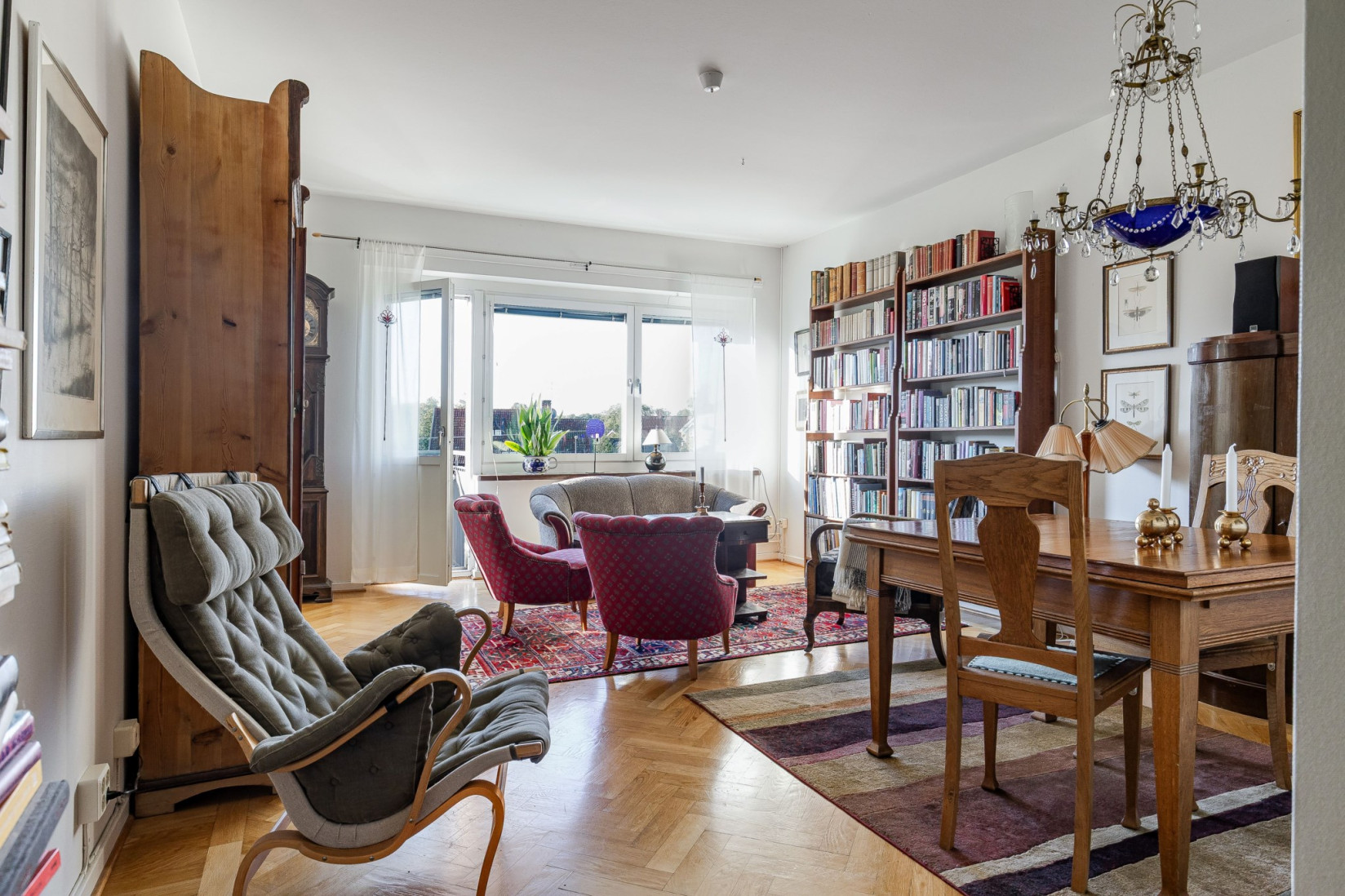 I vardagsrummet ligger vacker fiskbensparkett och väggarna är även här vita. Det stora fönsterpartiet ger rikligt med ljusinsläpp och en fantastisk utsikt. Från vardagsrummet nås balkongen i söderläge som bjuder på många soltimmar.
