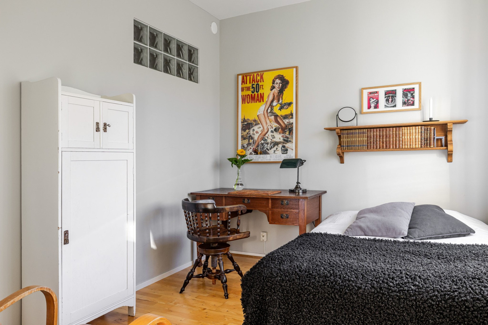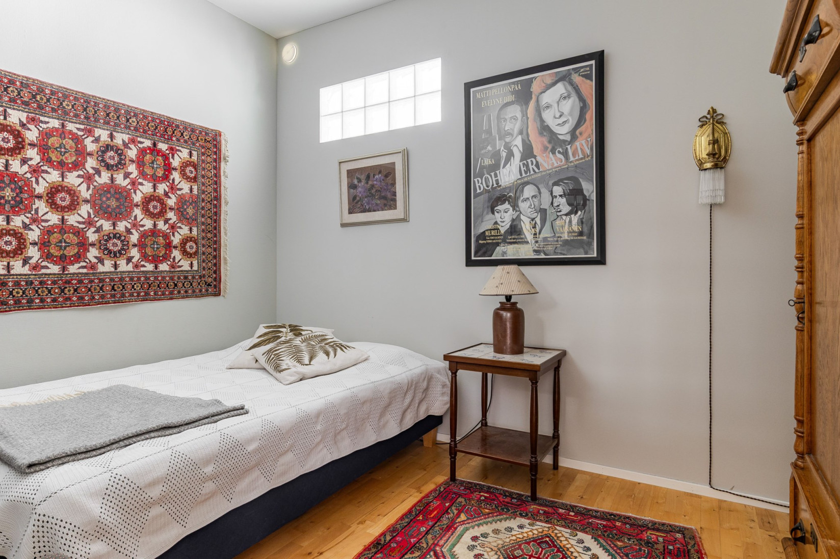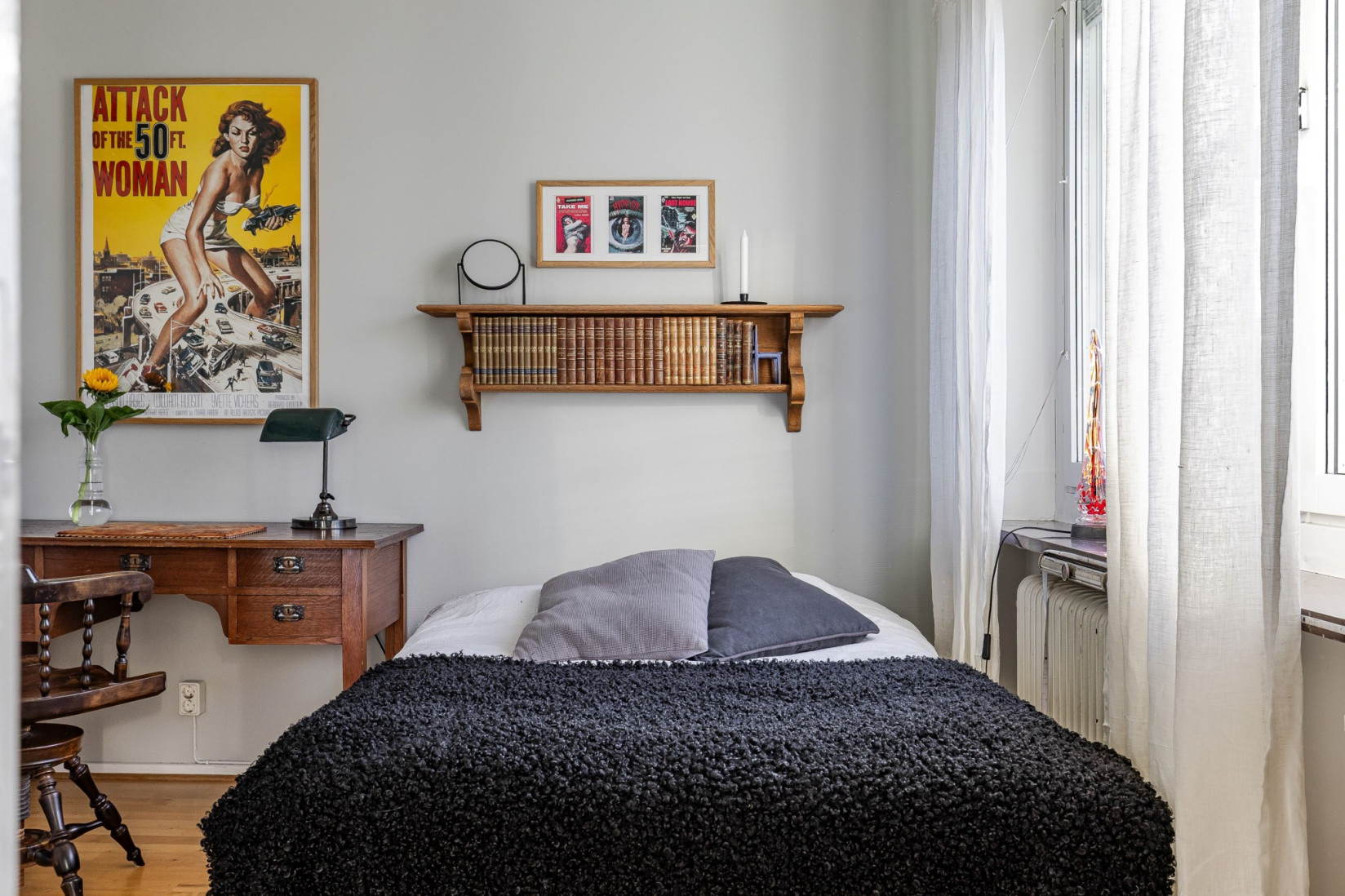 Från början hade sovrummet ingång både via hallen och vardagsrummet, men nuvarande ägare har satt upp en vägg och skapat två sovrum. Vill man hellre ha ett större sovrum går det enkelt att återställa.