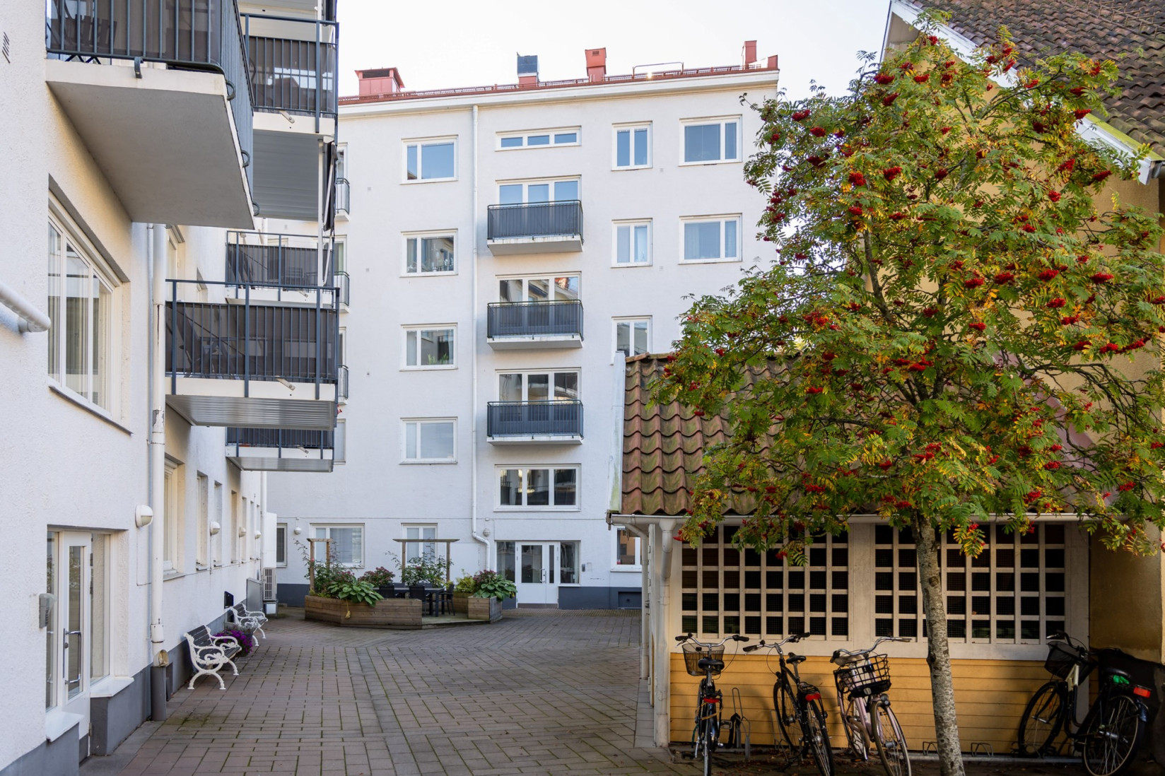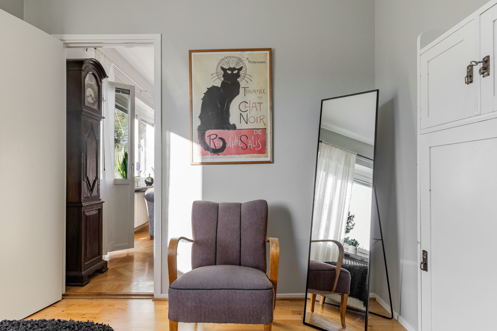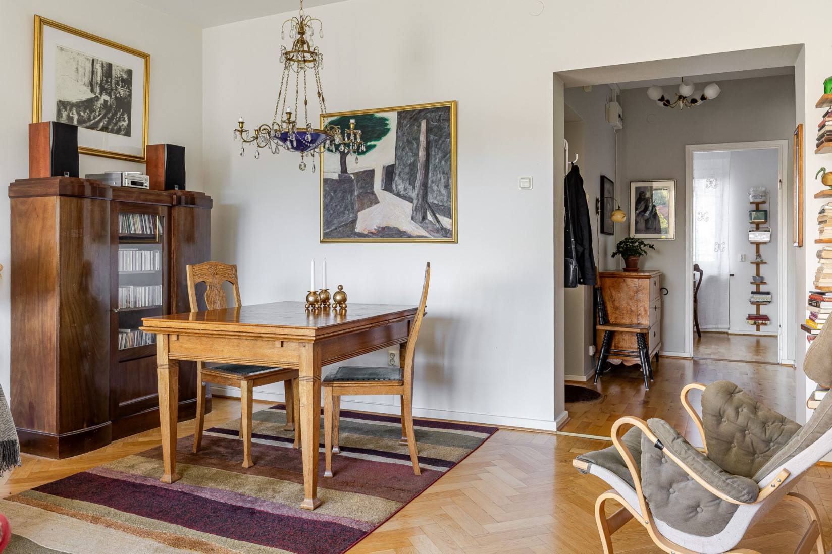 Från början hade sovrummet ingång både via hallen och vardagsrummet, men nuvarande ägare har satt upp en vägg och skapat två sovrum. Vill man hellre ha ett större sovrum går det enkelt att återställa.