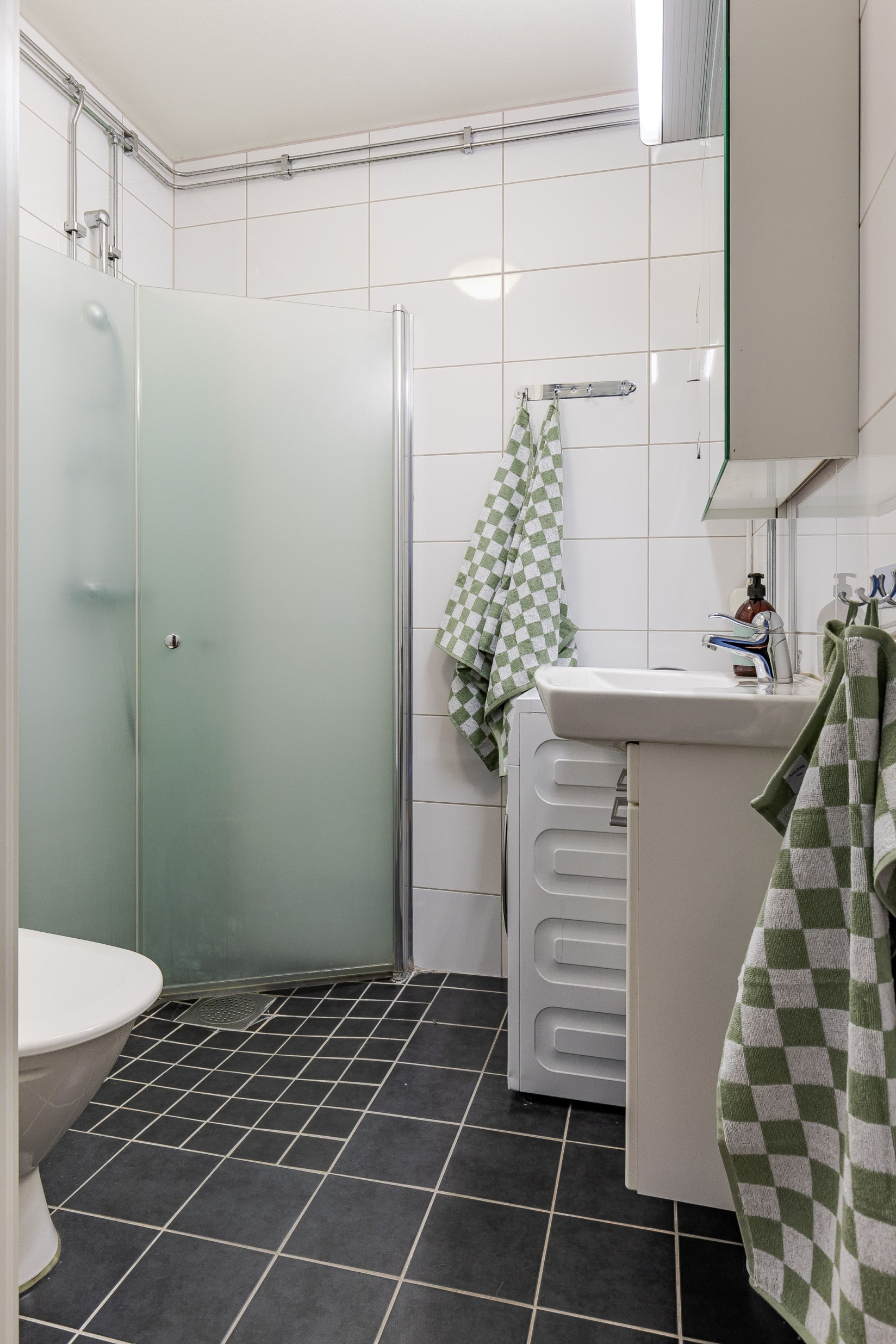 Badrummet är helkaklat med vita väggar och mörkt klinkergolv. Här finns duschhörna, spegelskåp med belysning, toalett, handfat med kommod samt tvättmaskin.
