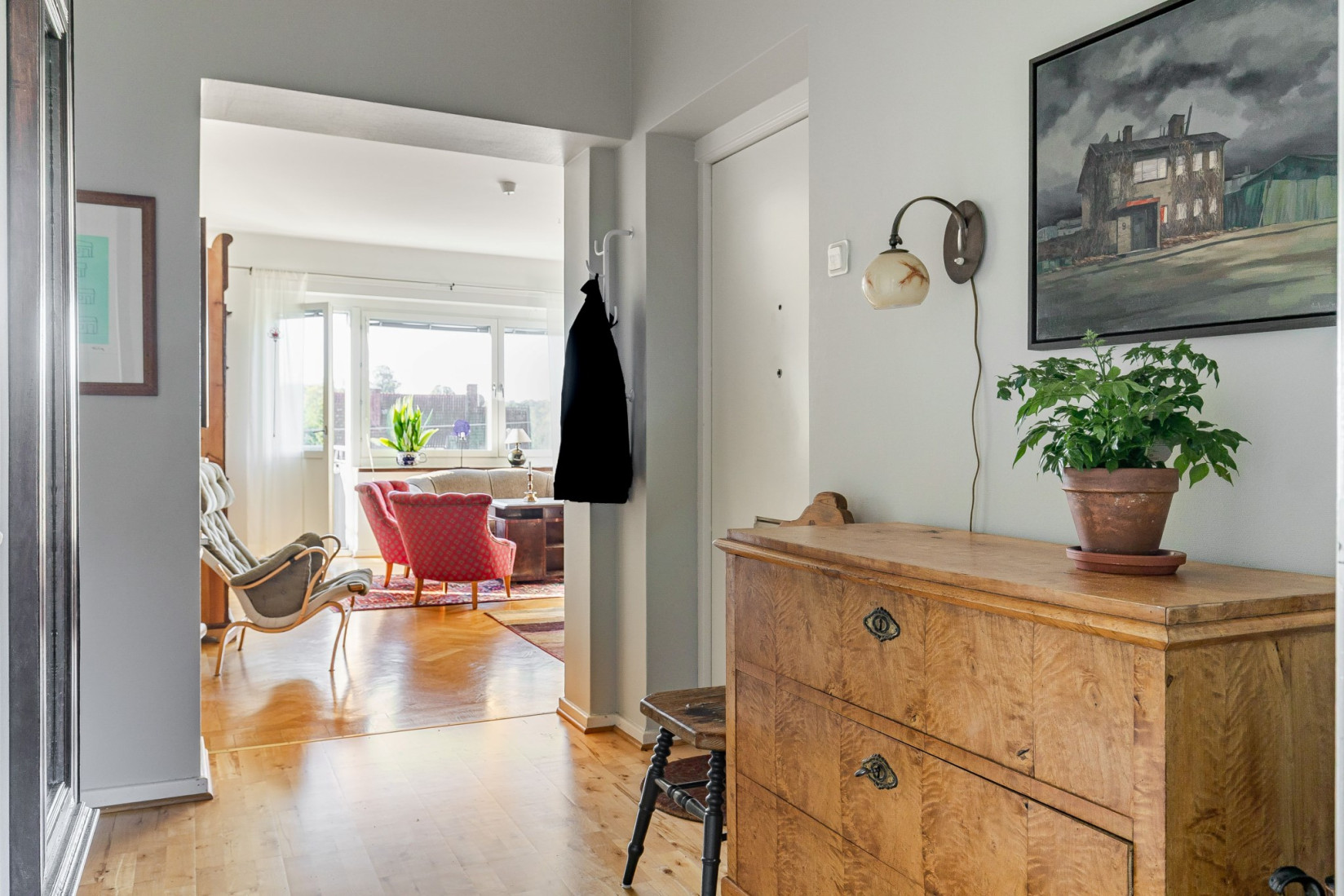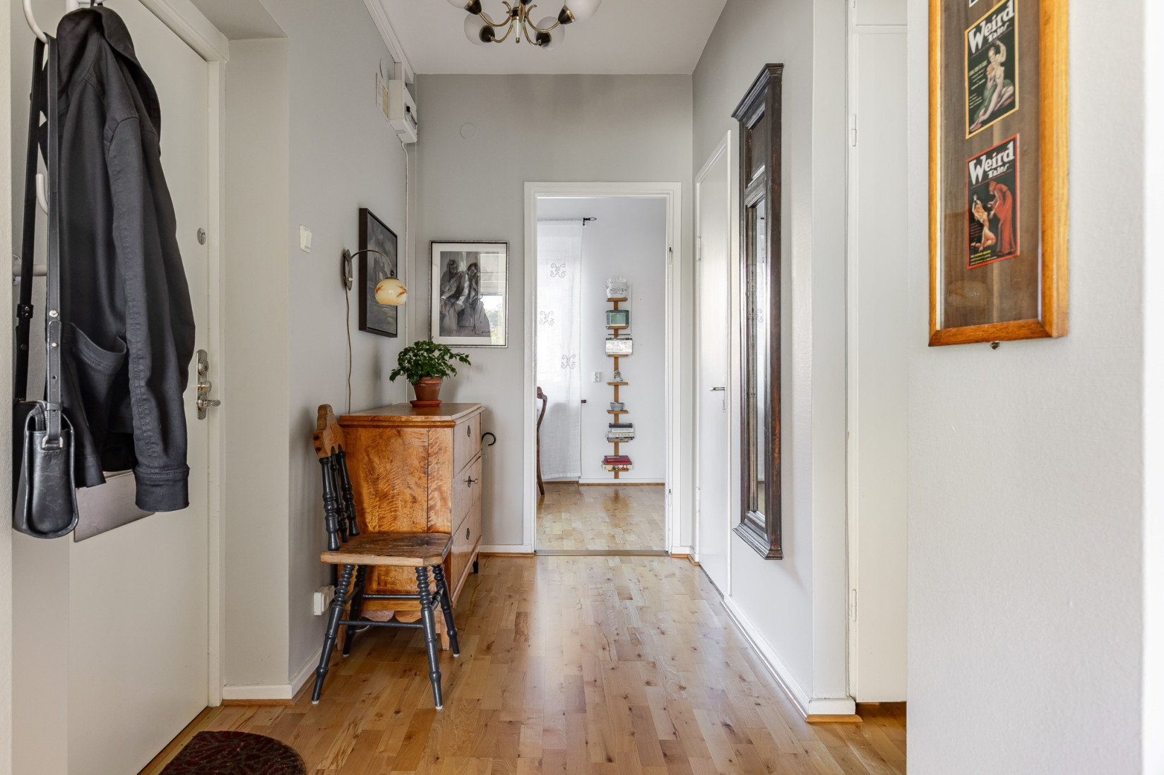 Med hiss från markplan når du enkelt bostaden. När du öppnar dörren möts du av en trevlig och rymlig hall. Till vänster finns plats att hänga av ytterkläder och skor. Väggarna är genomgående vita och ljusa. Förvaringsmöjligheter erbjuds i garderober med överskåp samt en klädkammare.