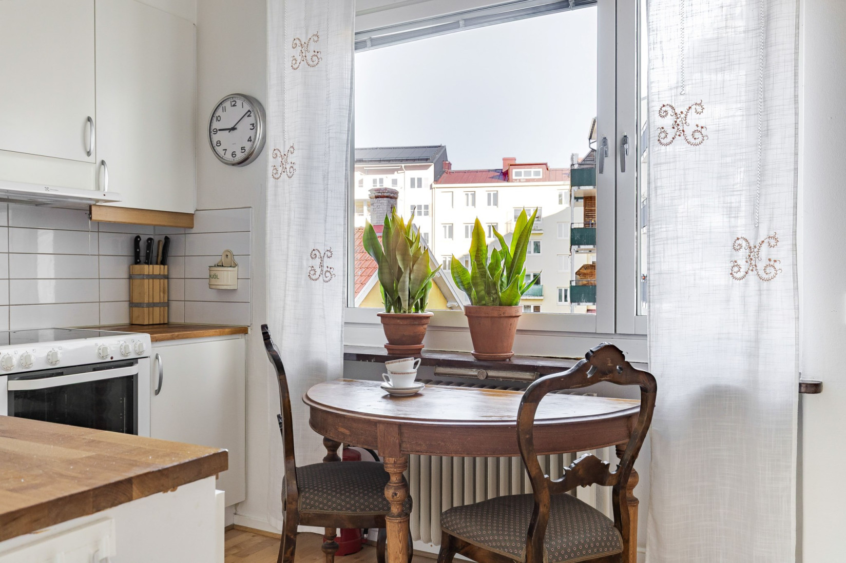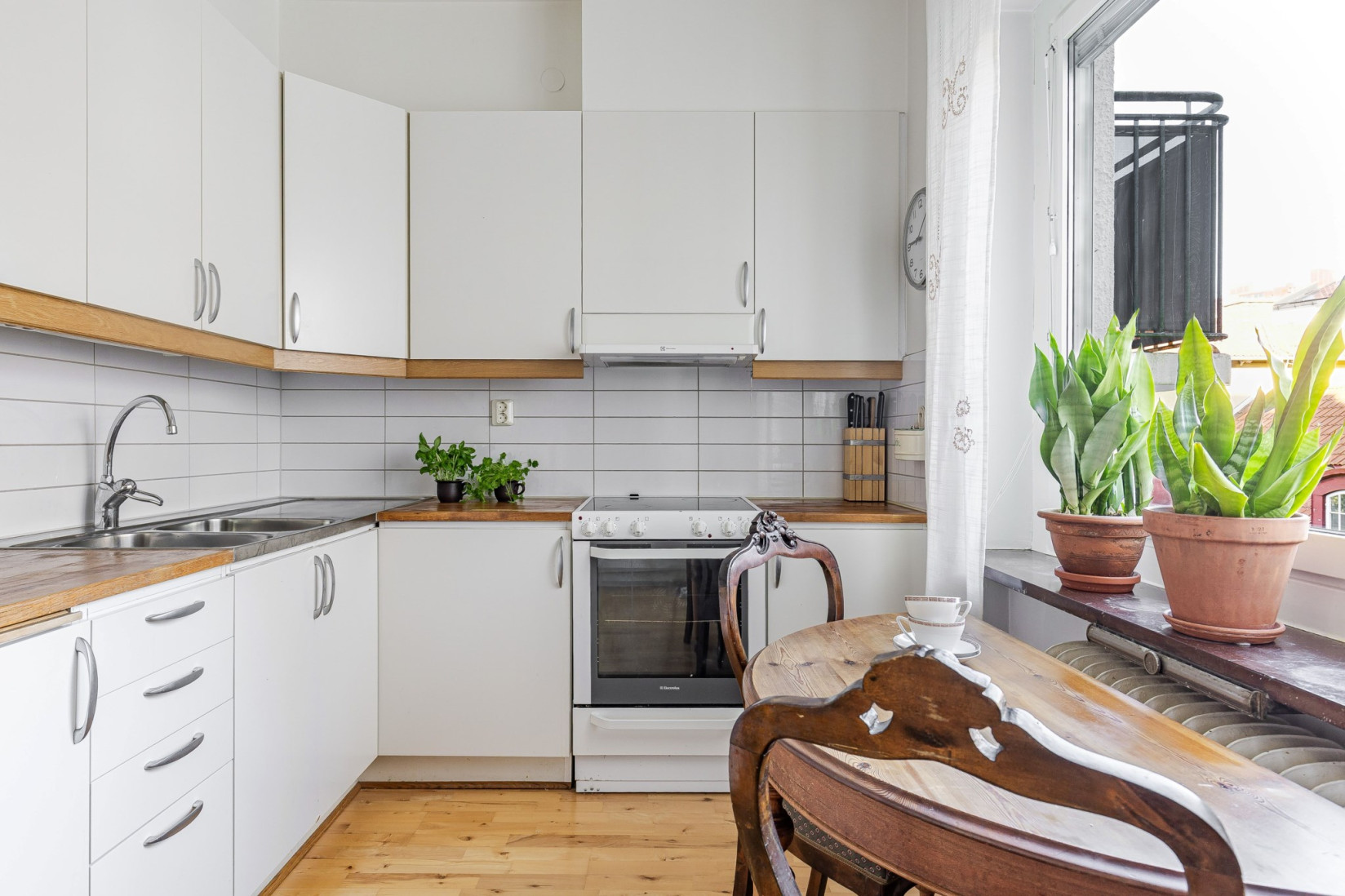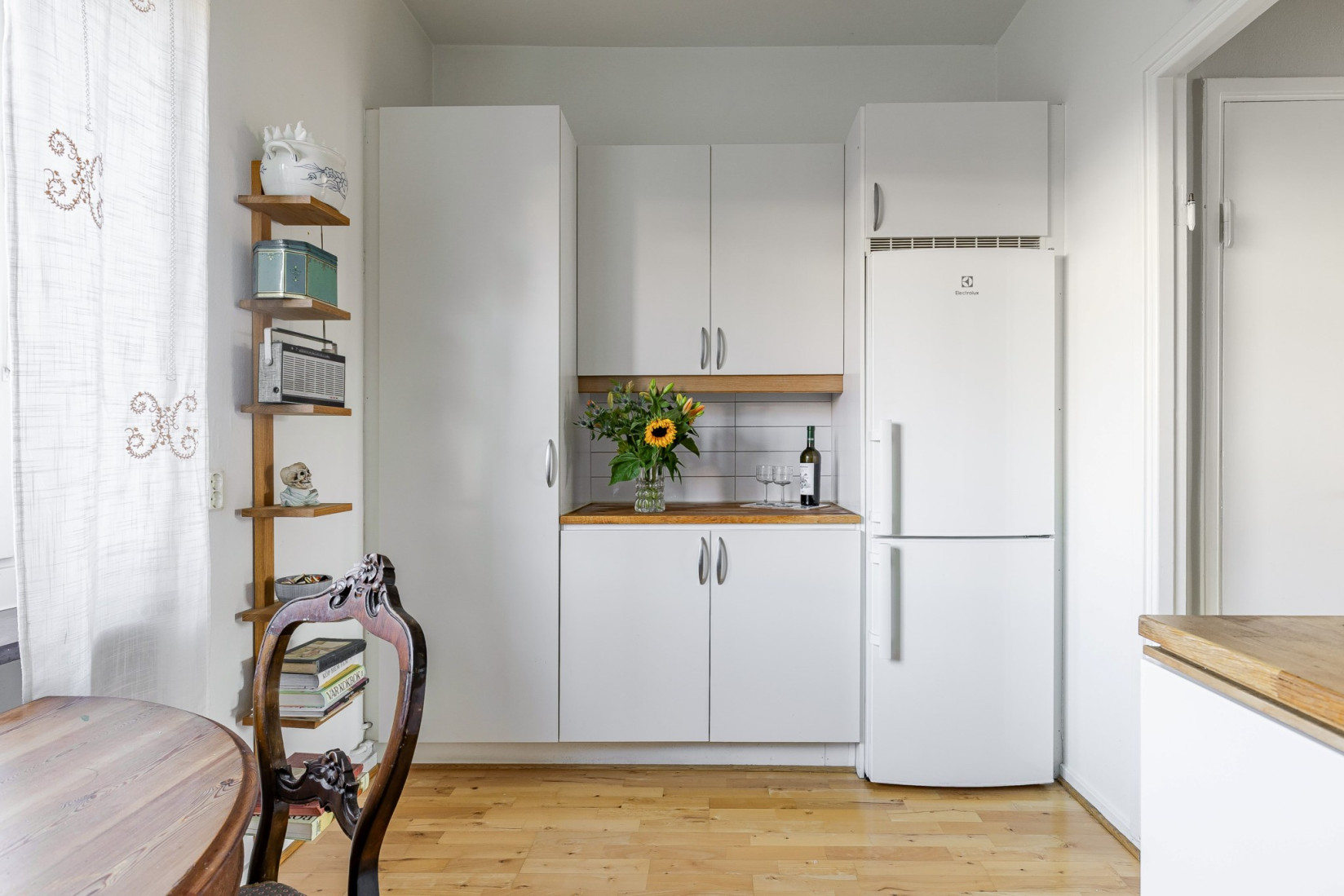 Till vänster från hallen ligger bostadens kök med utsikt mot föreningens gård. Här finns vita luckor, bänkskiva i trä, spis och kyl/frys. Ovanför arbetsytan sitter vitt kakel. Vid fönstret finns plats för ett mindre matbord.