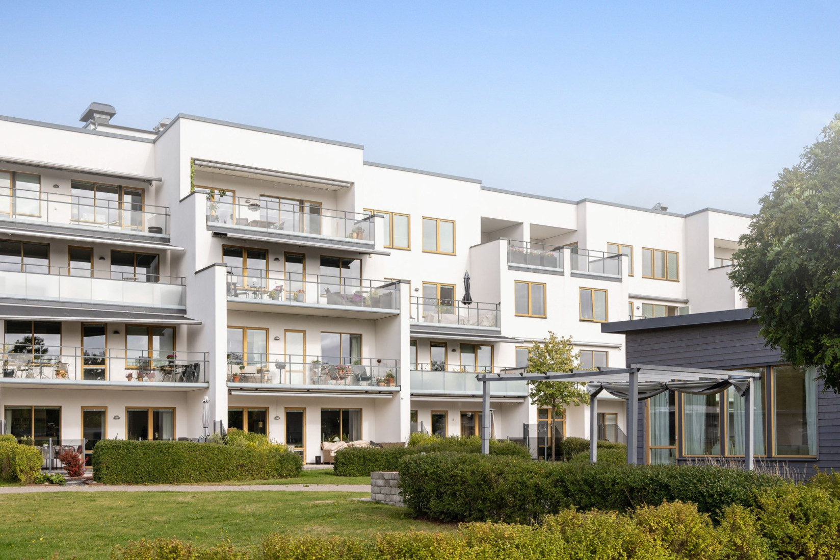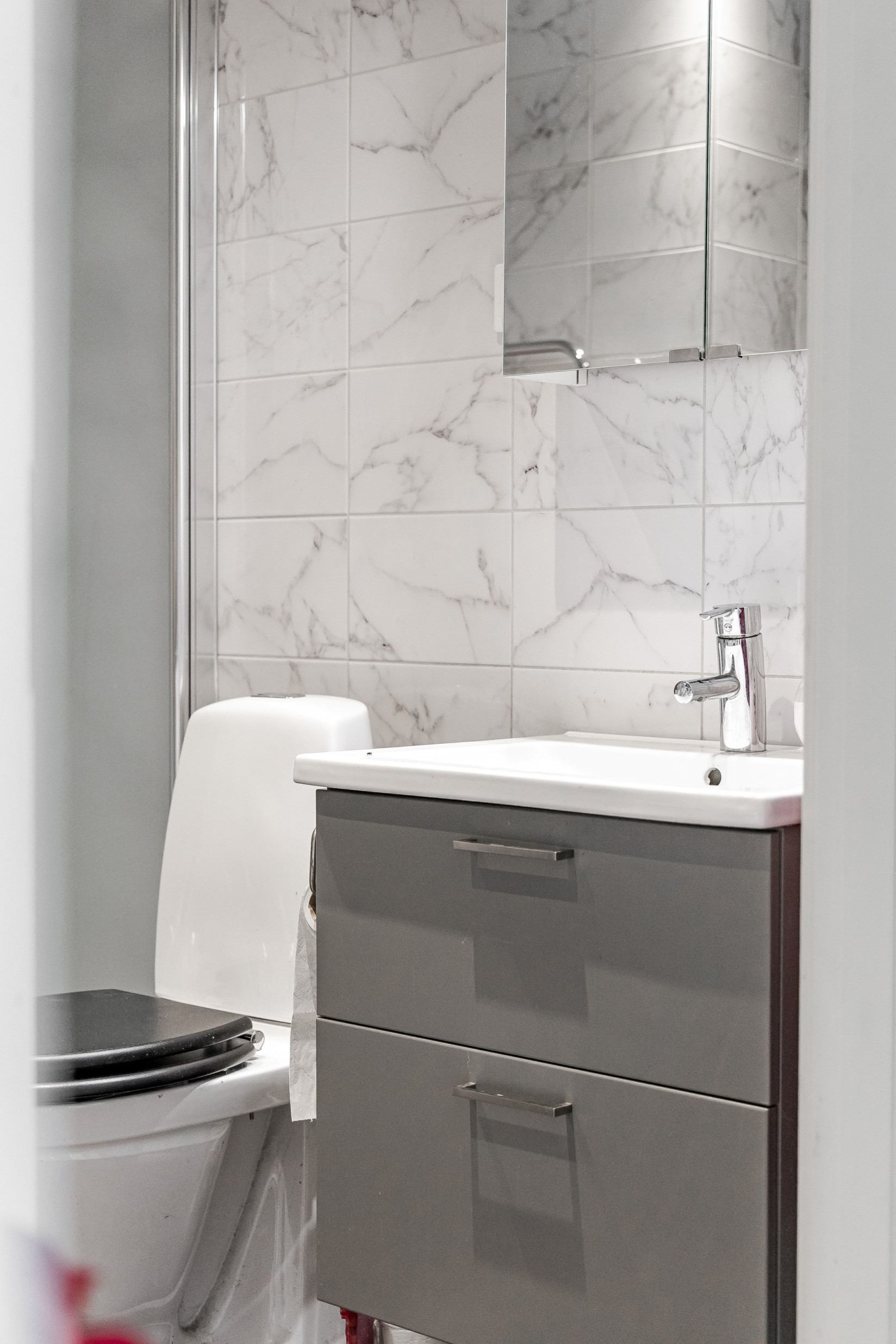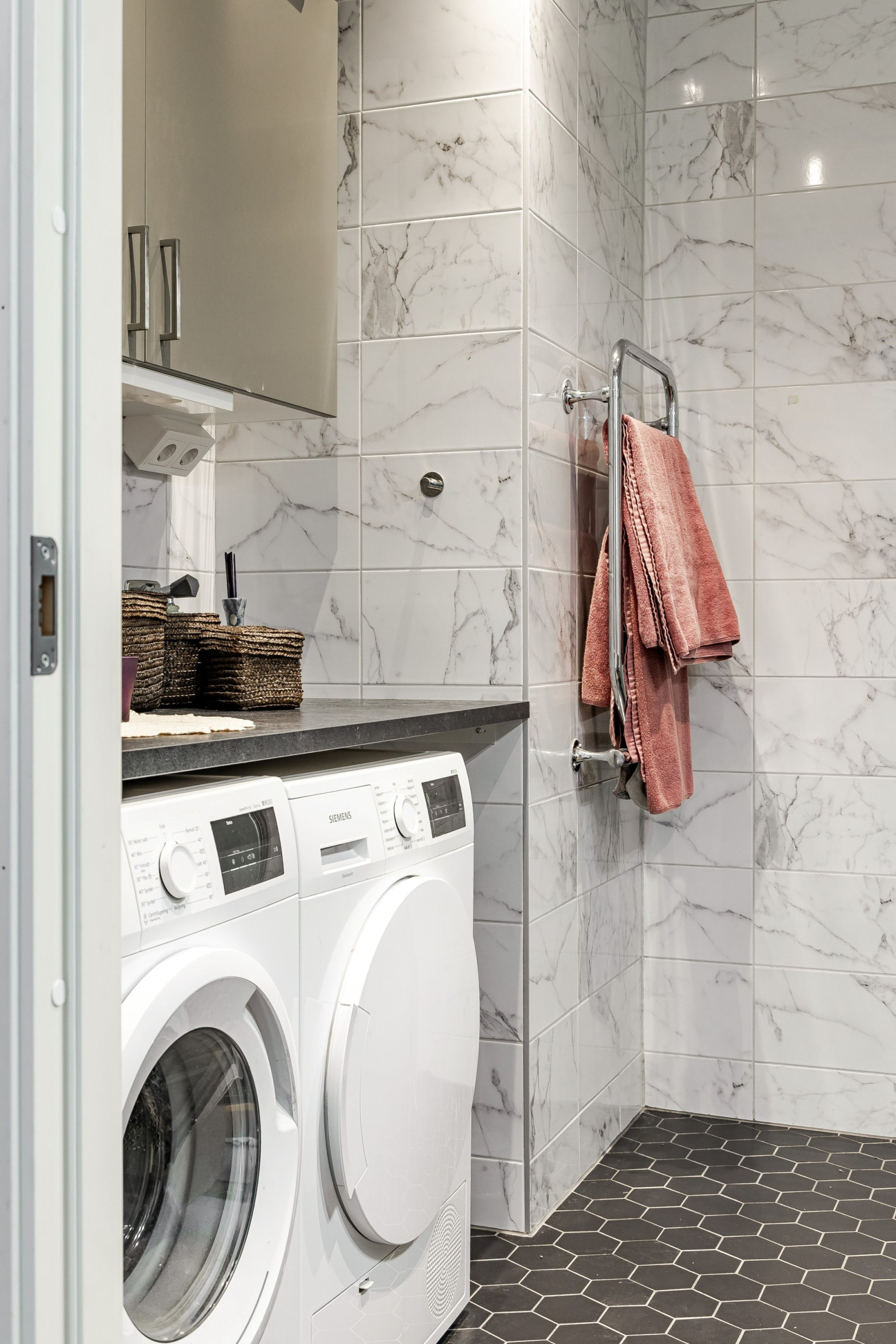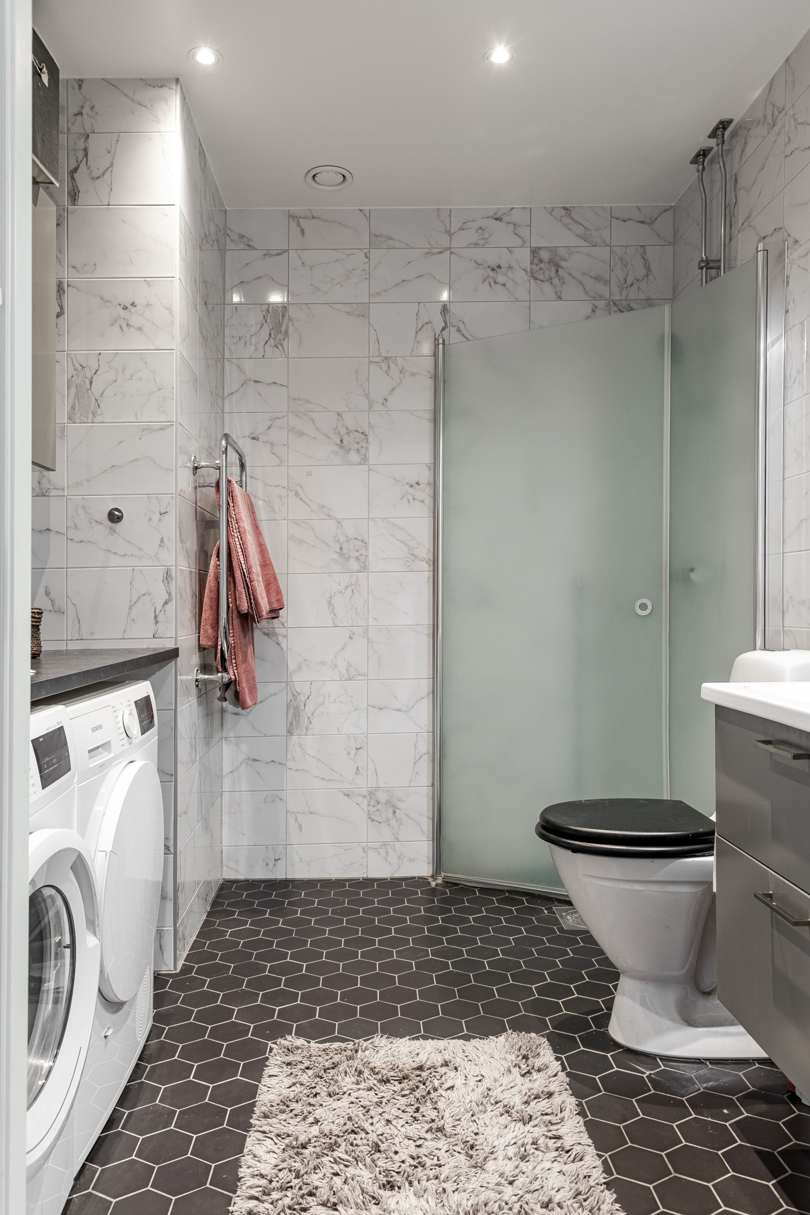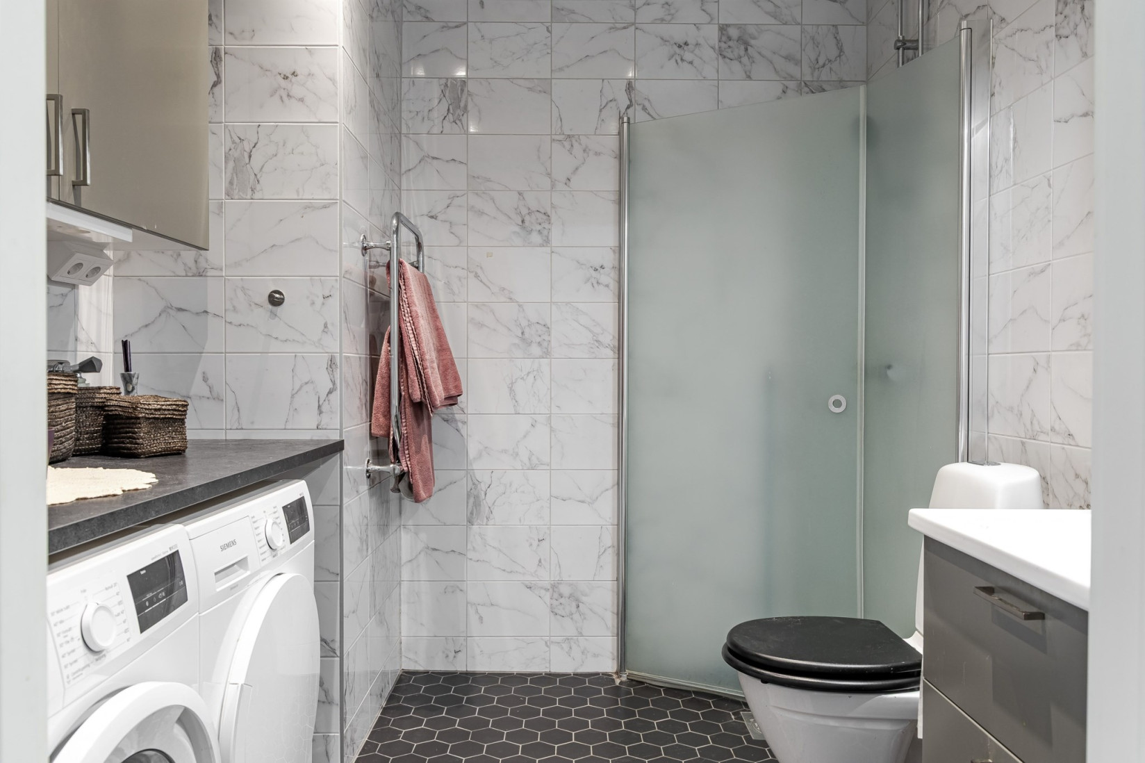 Badrummet är modernt och stilrent med snyggt kakel på väggarna och klinkergolv med underliggande golvvärme och spotlights i taket. Här finns handfat med kommod, dusch, handdukstork och toalett. Bekvämt med egen tvättmaskin och torktumlare. Förvaring smidigt i två skåp.