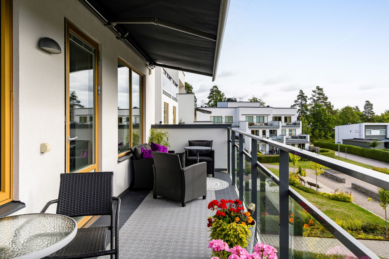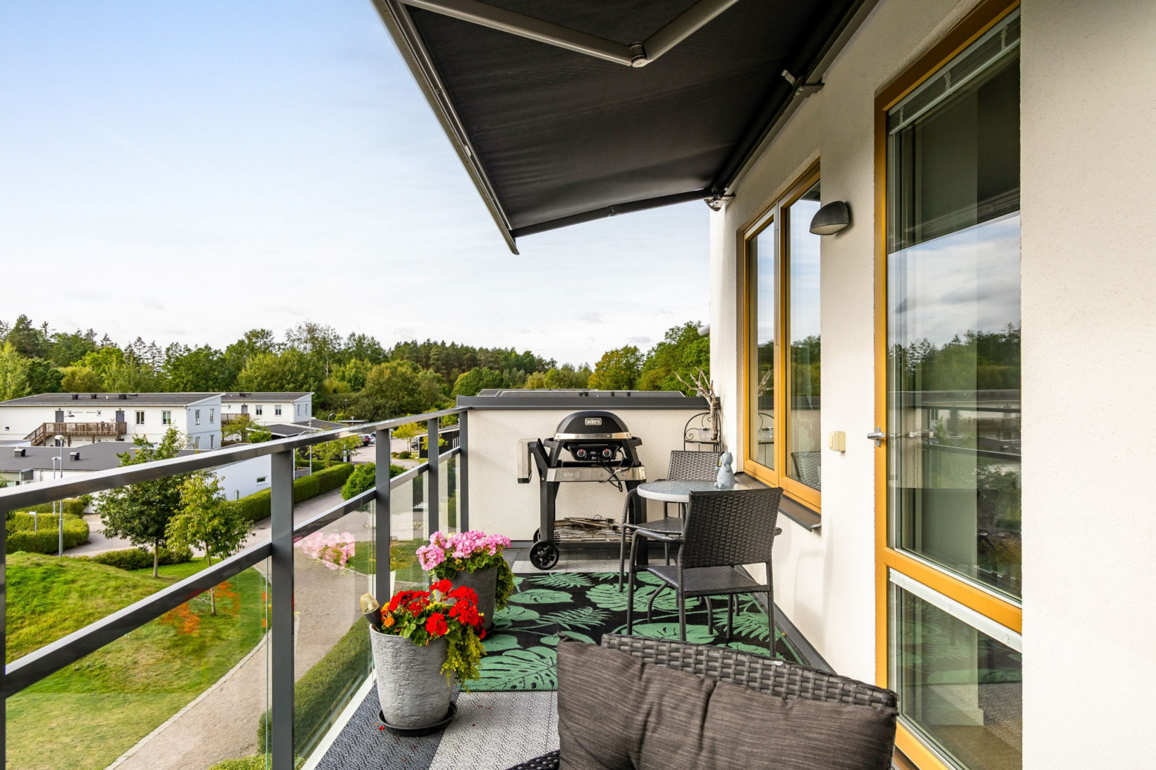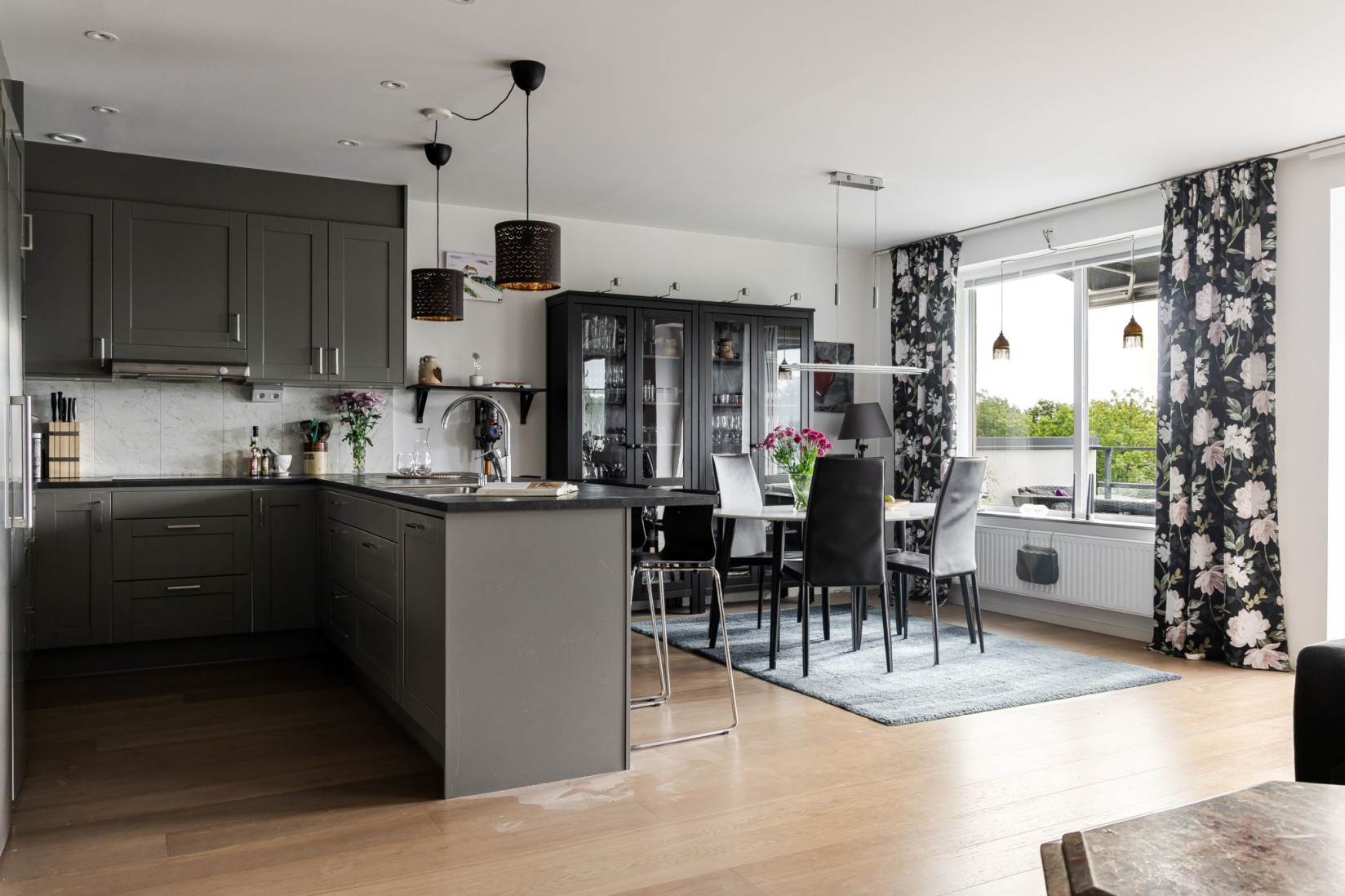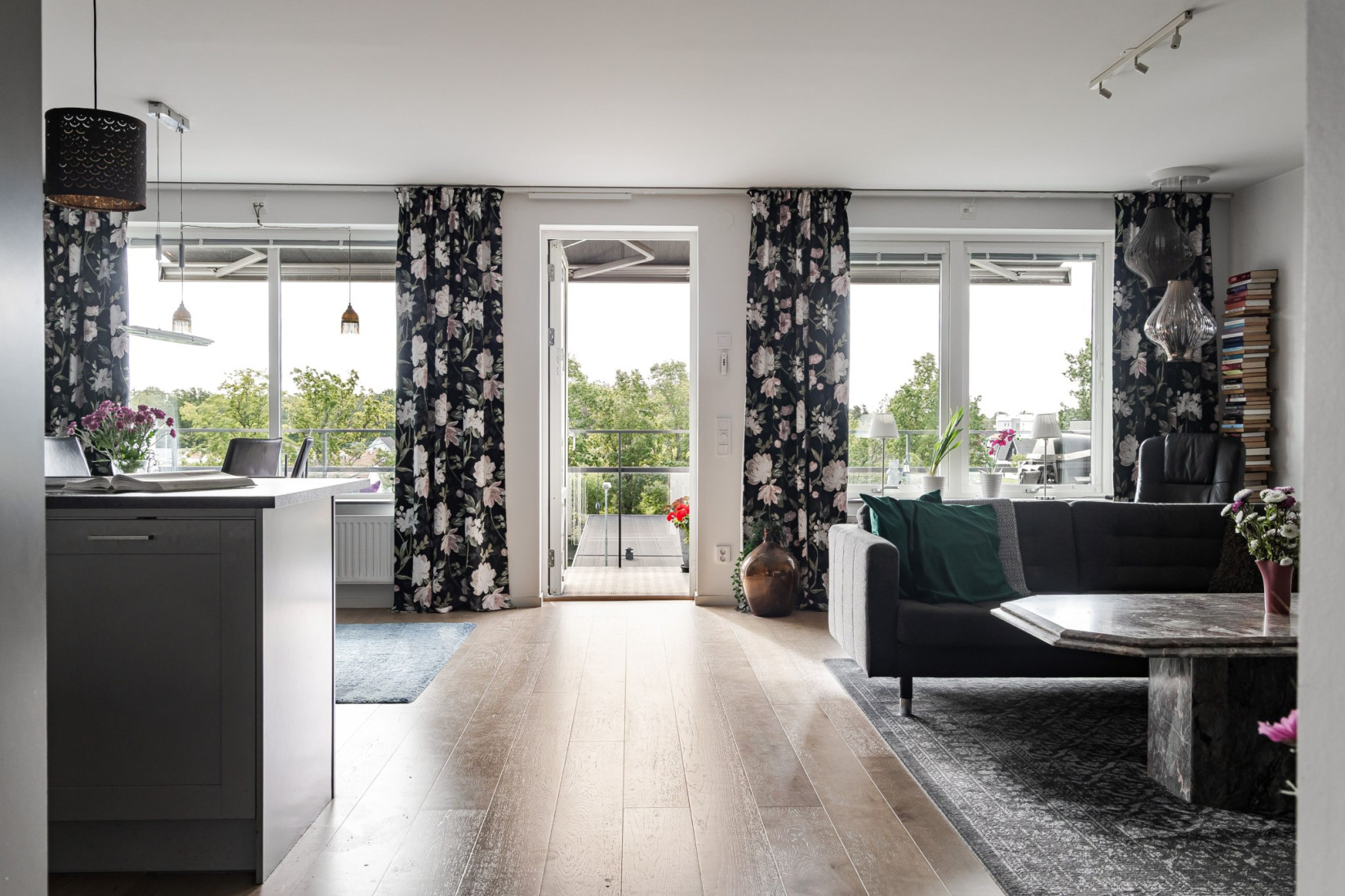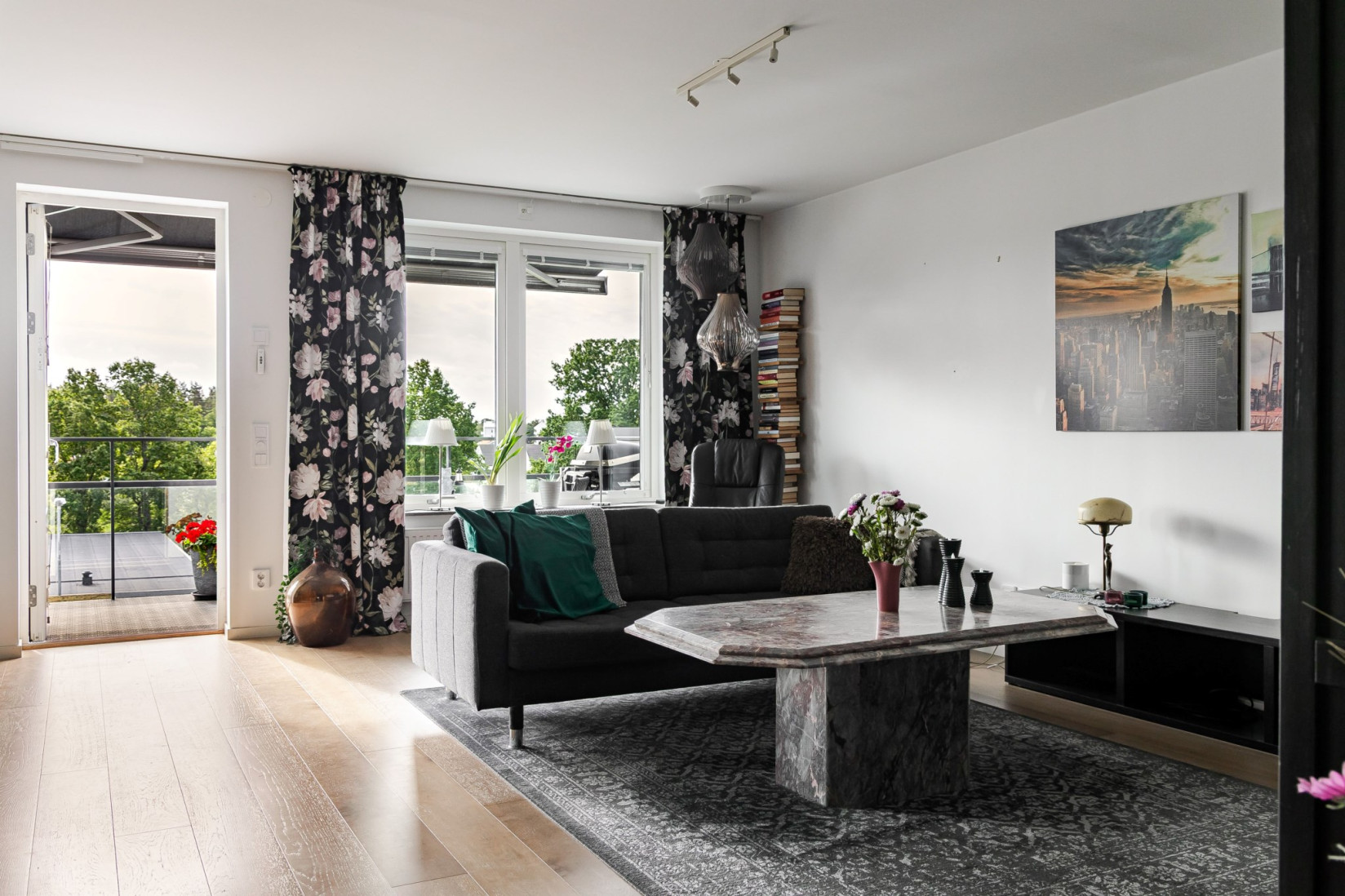 Vardagsrummet är ett kapitel för sig själv! Generös golvyta som möjliggör flera olika möbleringar. Här får du plats med soffa, tv, förvaringsmöbler och ditt allra bästa sällskap. Att uppskatta är det fina ljusinsläppet men de fina utblickarna över Ljusstaden.
