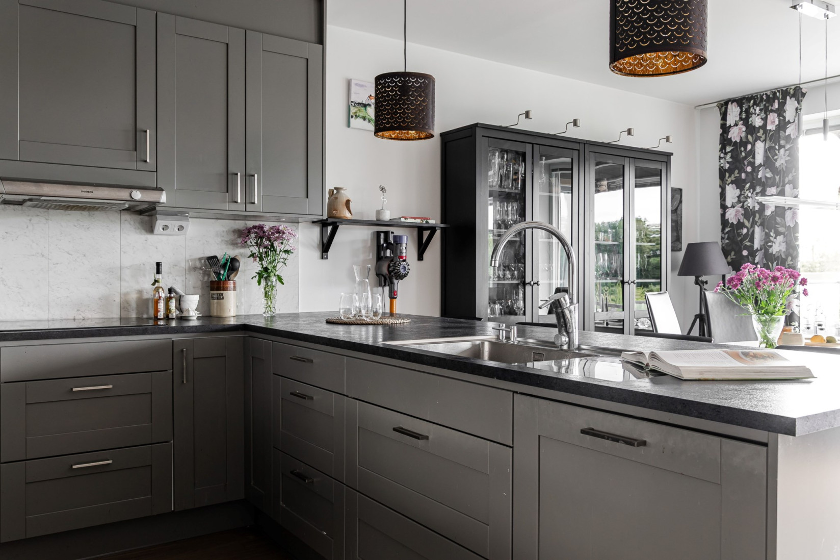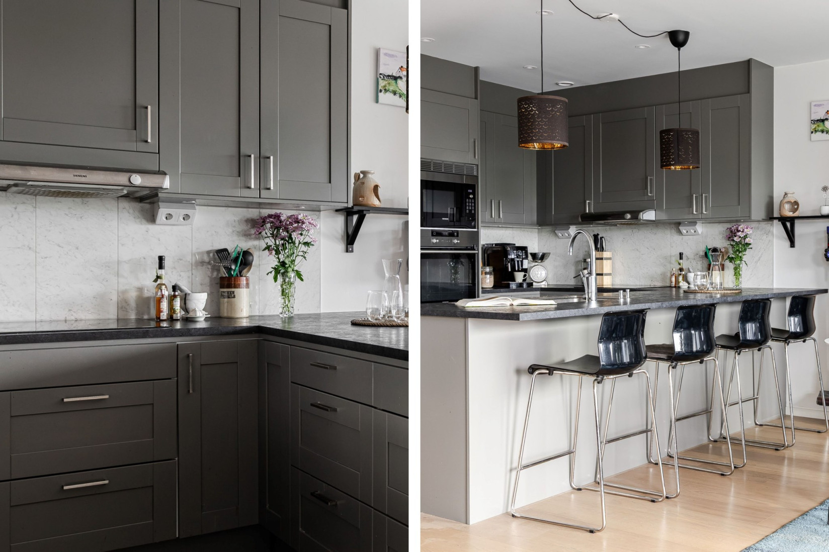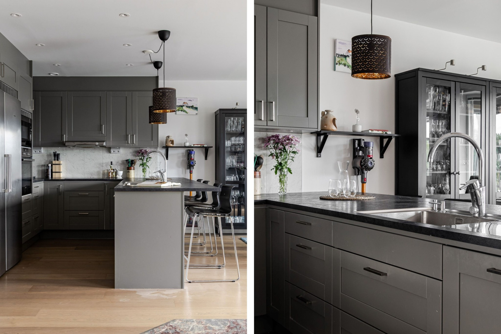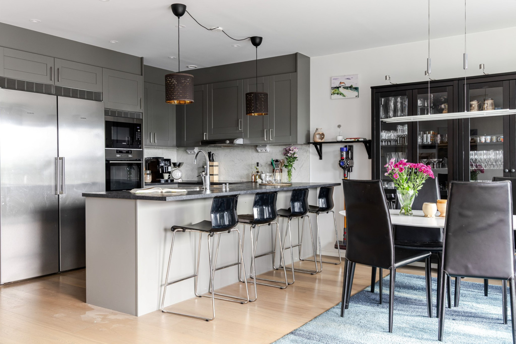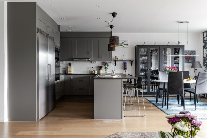 Tack vare den öppna planlösningen samspelar köket fint med vardagsrum. Här samsas många kvadrat om uppmärksamheten! Köksinredning med gråa luckor och mörk laminatbänkskiva. Spotlights i taket. Här finns stora arbetsytor som rymmer många kockar och för dem som inte lagar mat erbjuds sittplatser vid köksön eller vid matbordet intill fönsterpartiet som vetter mot föreningens innergård. Kombinera umgänge och matlagning! Den maskinella utrustningen i rostfritt utförande består av hel kyl och frys, integrerad diskmaskin, inbyggnadsugn och micro i arbetshöjd, induktionshäll och fläkt. Det är från köket vi når den tilltagna söderbalkongen.