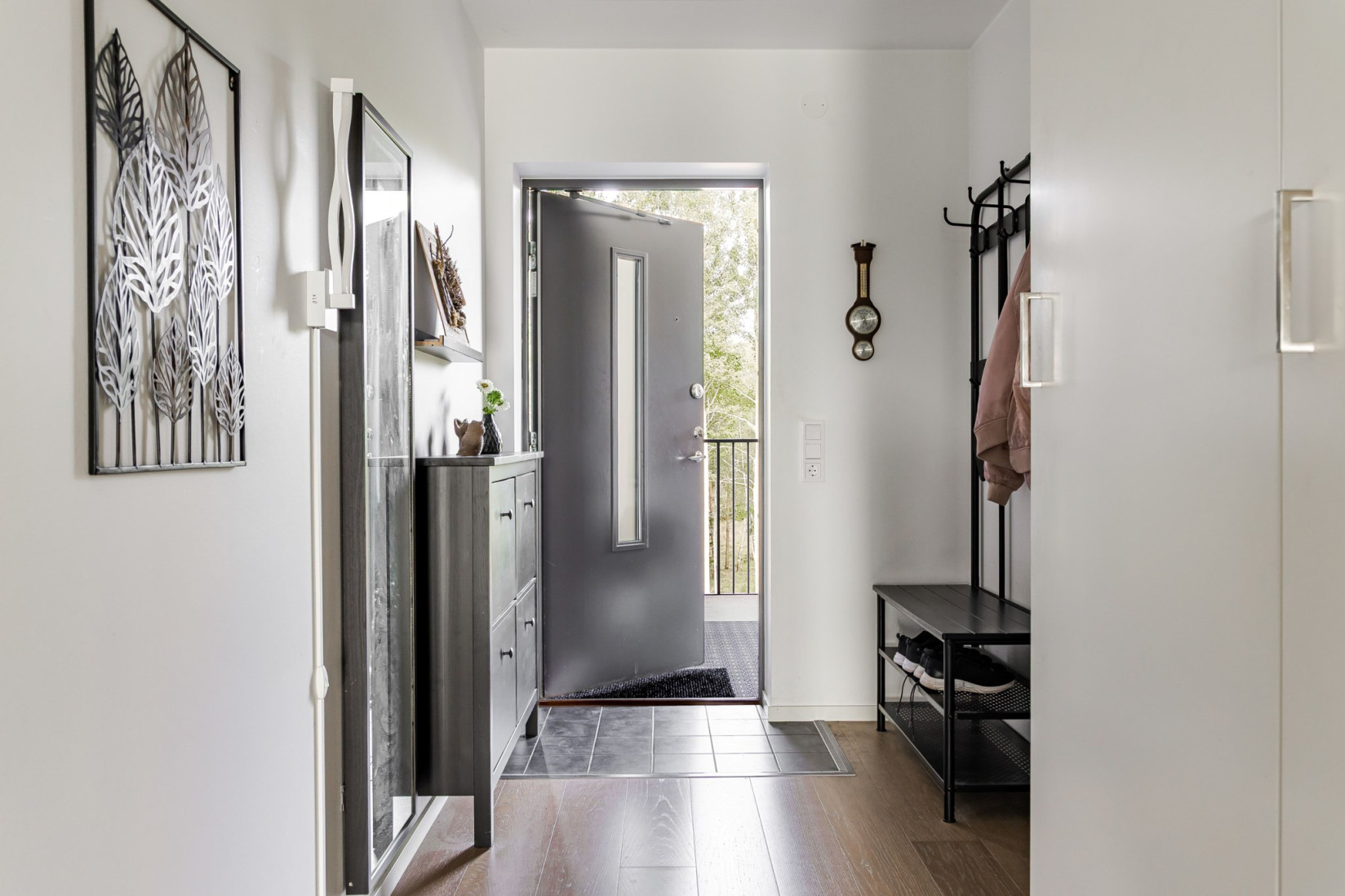 Det blir ett ljust mottagande! Hallen är i vad jag skulle beskriva som, perfekt storlek. Lagom stor för att slippa trängsel när hela familjen har bråttom men fortfarande sparsam med kvadratmetern. Fötterna placerar vi på ekparkettgolv som är återkommande i samtliga rum. Spotlights i taket. Likaså de vitmålade väggarna. Stilrent, neutralt och tidlöst. I direkt anslutning till entrén finns avgängning för ytterkläder och skor. Förvaring i garderober.