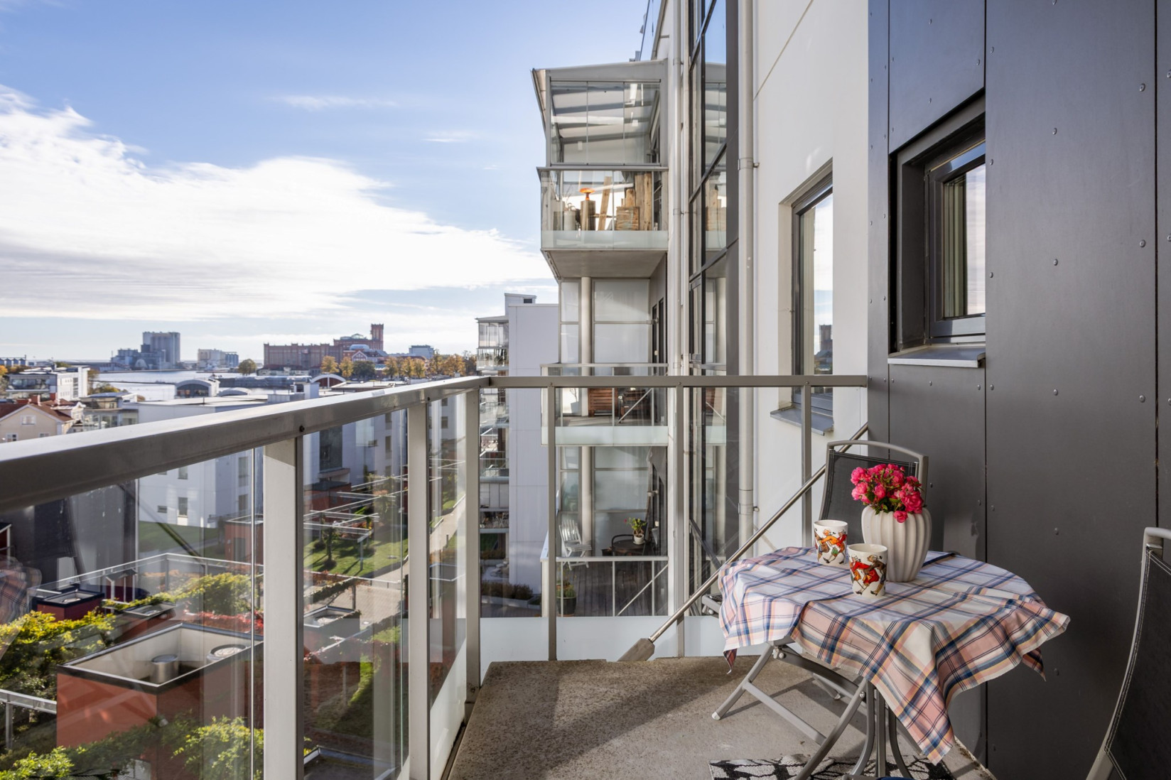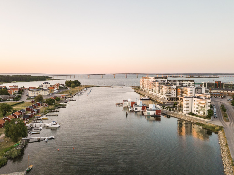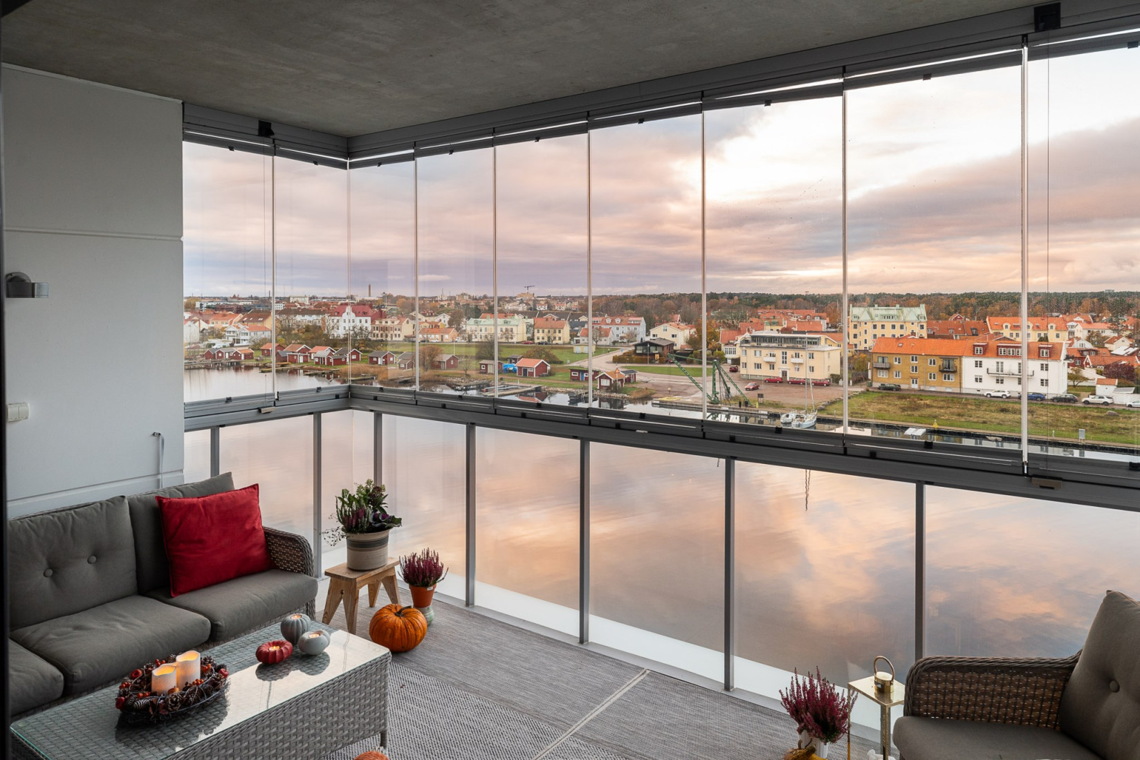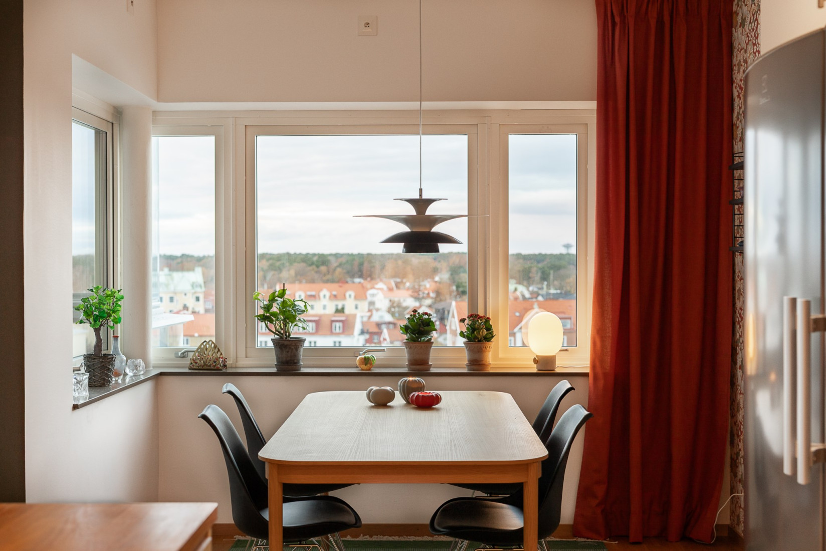 Den inglasade balkongen blir en naturlig förlängning av rummet, en plats att njuta av årets alla dagar med utsikt över Ängö, Ölandsbron, himlen och stadens takåsar.