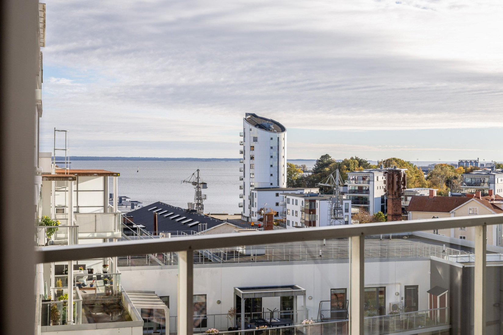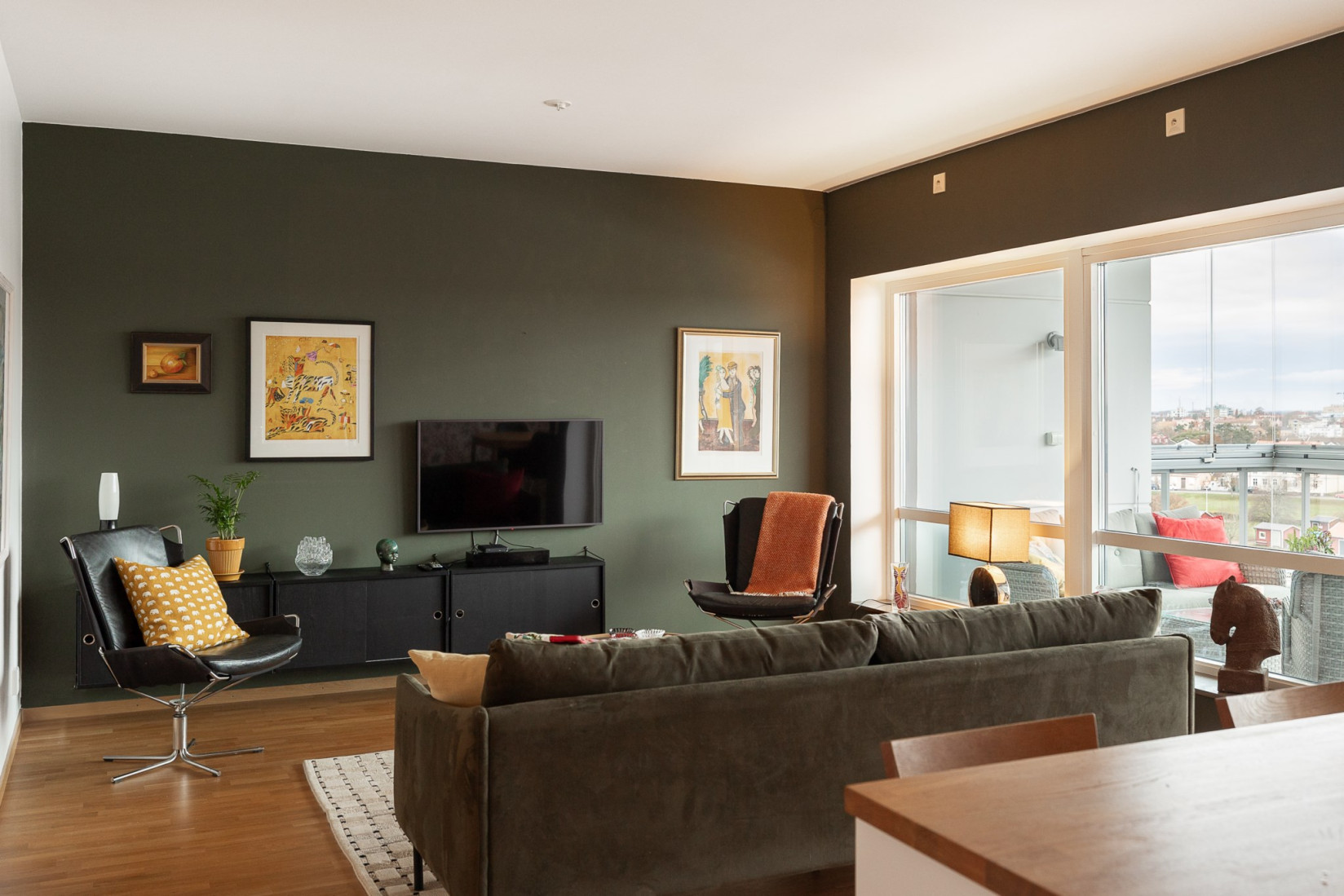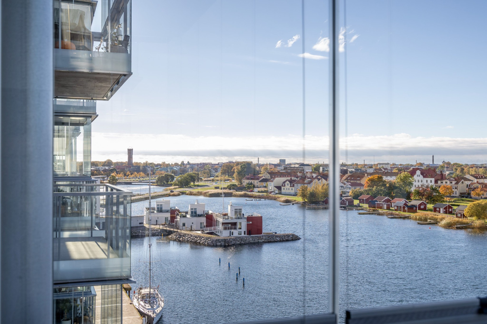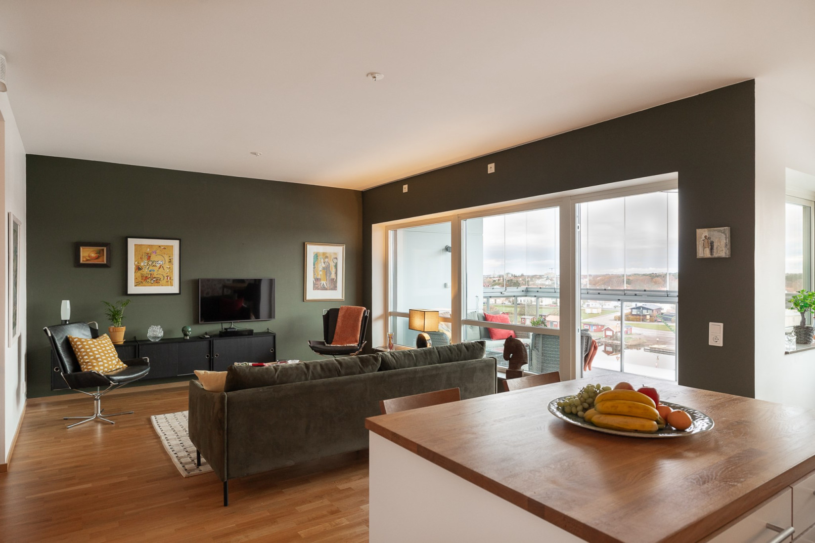 Den inglasade balkongen blir en naturlig förlängning av rummet, en plats att njuta av årets alla dagar med utsikt över Ängö, Ölandsbron, himlen och stadens takåsar.