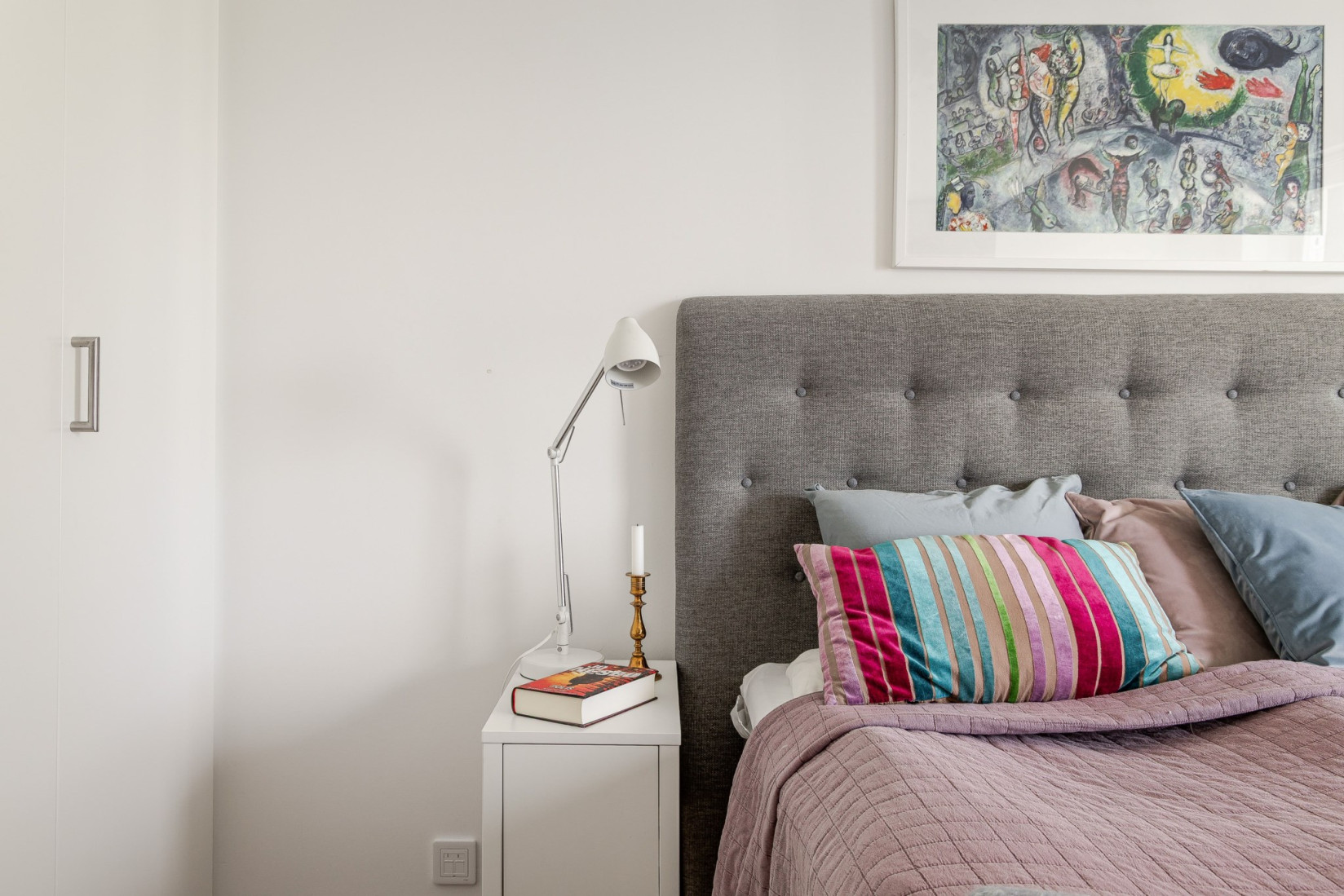 I det större sovrummet får du enkelt plats med en dubbelsäng och tillhörande nattduksbord. De tre garderoberna erbjuder generös förvaring, vilket gör det enkelt att hålla rummet stilrent och organiserat. Härifrån kliver du direkt ut till bostadens andra balkong. Här njuter du av morgonkaffet och av ljuvlig utsikt över Kalmarsund.