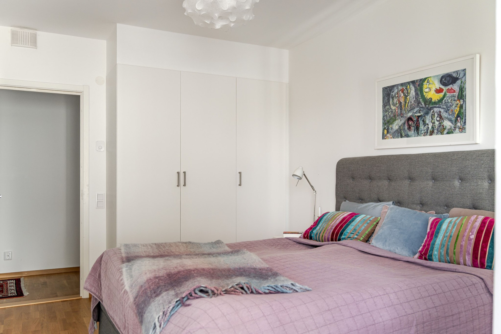 Från hallen leds vi vidare till hemmets två rofyllda sovrum, båda med ett insynsskyddat och harmoniskt läge mot föreningens lugna innergård.
