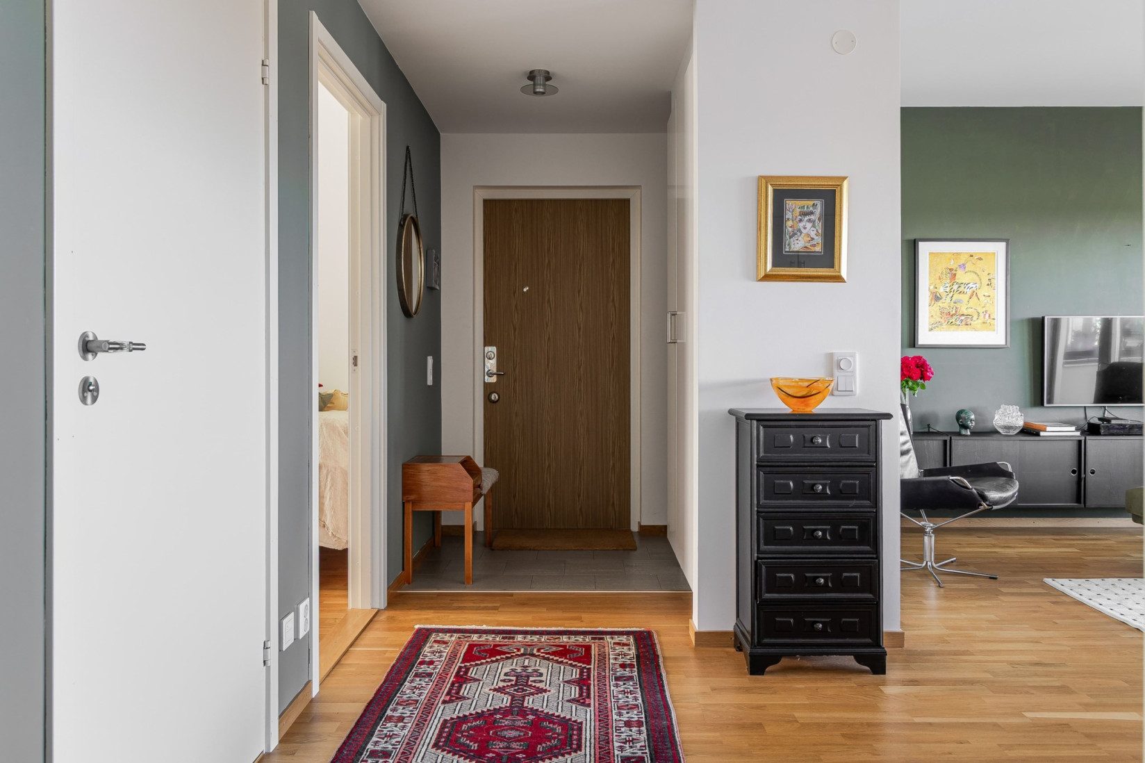 Den genomtänkta planlösningen ger ett luftigt och välkomnande intryck. Här finns gott om plats för avhängning av ytterkläder och skor, men för den som vill hålla hallen prydligt organiserad finns generös förvaring i två rymliga garderober. Längre in döljer sig ännu mer förvaringsyta bakom stilrena skjutdörrar.