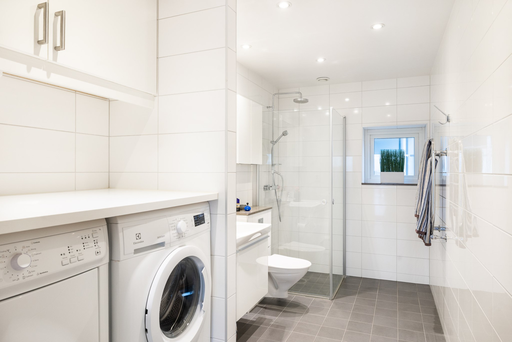 Tvättsektionen är lika praktisk som snygg, med både tvättmaskin och torktumlare, kompletterade av en arbetsyta och förvaring ovanför. Här blir tvättandet inte bara enkelt, det blir ett rent nöje.