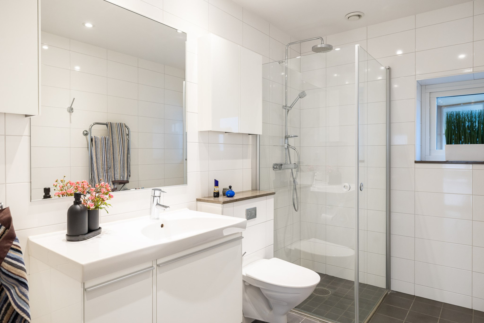 Vi avslutar med ett badrum som har allt du kan önska. Den vägghängda toaletten bidrar till en stilren och luftig atmosfär, medan det eleganta kaklet och klinkergolvet kompletteras av behaglig golvvärme som gör varje steg varmt och skönt. De platsbesparande duschväggarna i glas ger en öppen och rymlig känsla utan att kompromissa med funktionaliteten.