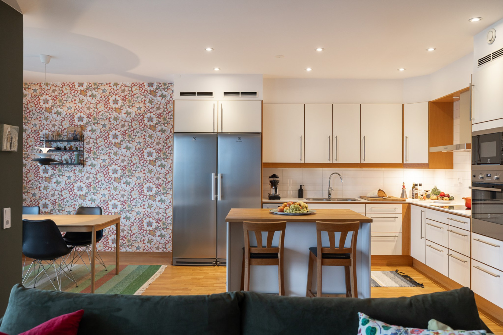 Köket är en dröm för den som uppskattar att stå i köket. Stilsäker inredning från Ballingslöv kombinerar vit skåpinredning med trädetaljer i en sofistikerad kontrast. Köksön blir hemmets naturliga samlingspunkt, med generösa förvaringsmöjligheter och en praktisk arbetsyta där både vardagens snabba måltider och långkok med vänner blir en ren njutning. Den maskinella utrustningen är komplett och består av fristående kyl och frys, inbyggnadsugn, mikrovågsugn, fläktkåpa och induktionshäll.