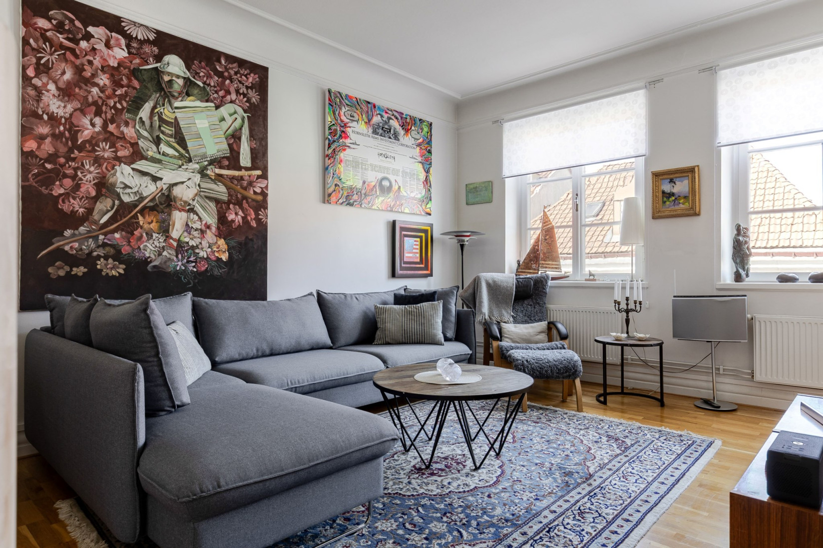 Lägenhetens största rum är vardagsrummet, där ljuset strömmar in genom stora fönsterpartier. Med ljusa ytskikt, generös takhöjd och härlig utsikt skapas ett öppet och trivsamt rum som kan inredas med både soffa, matgrupp och tv-hörna.