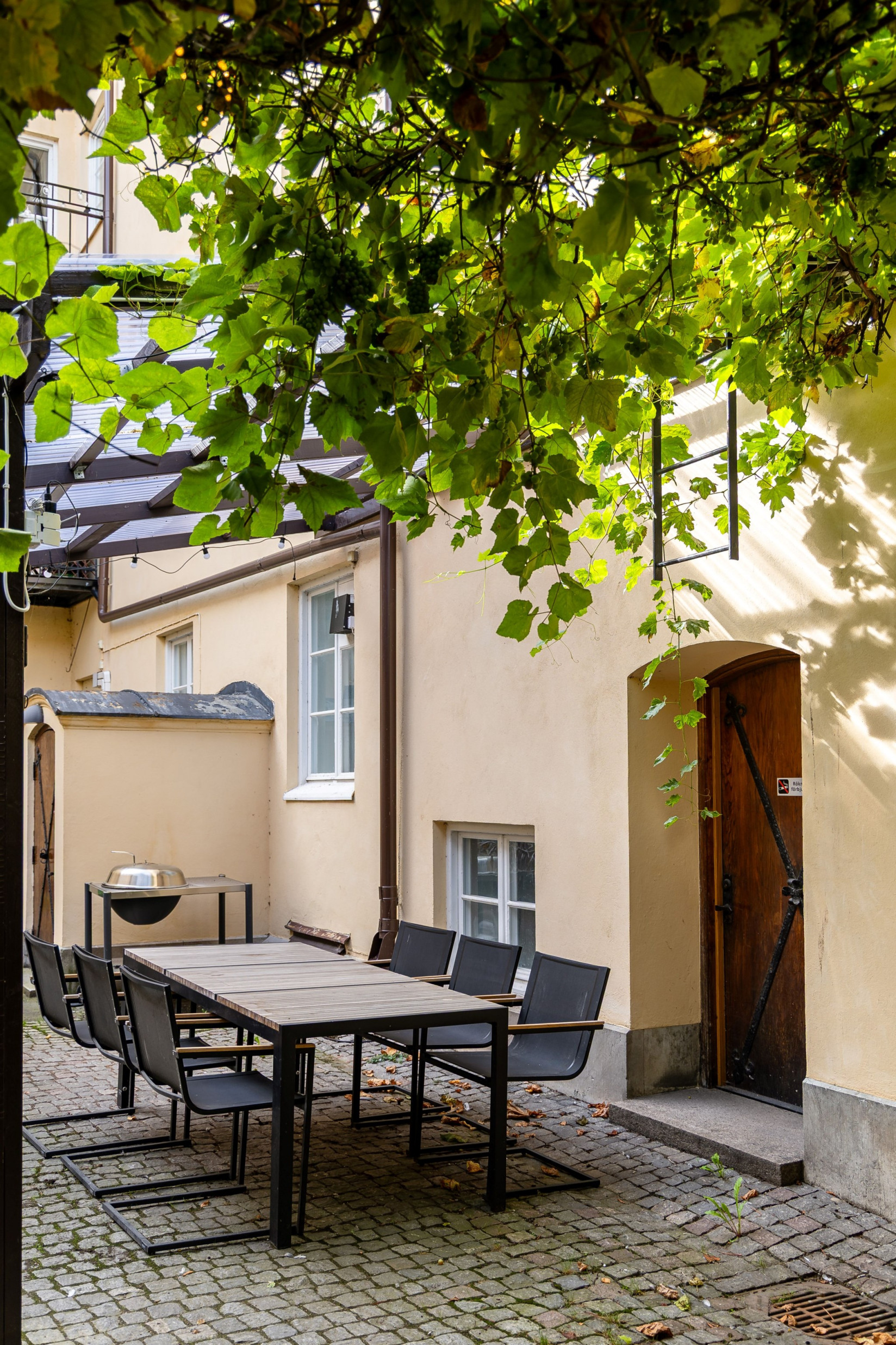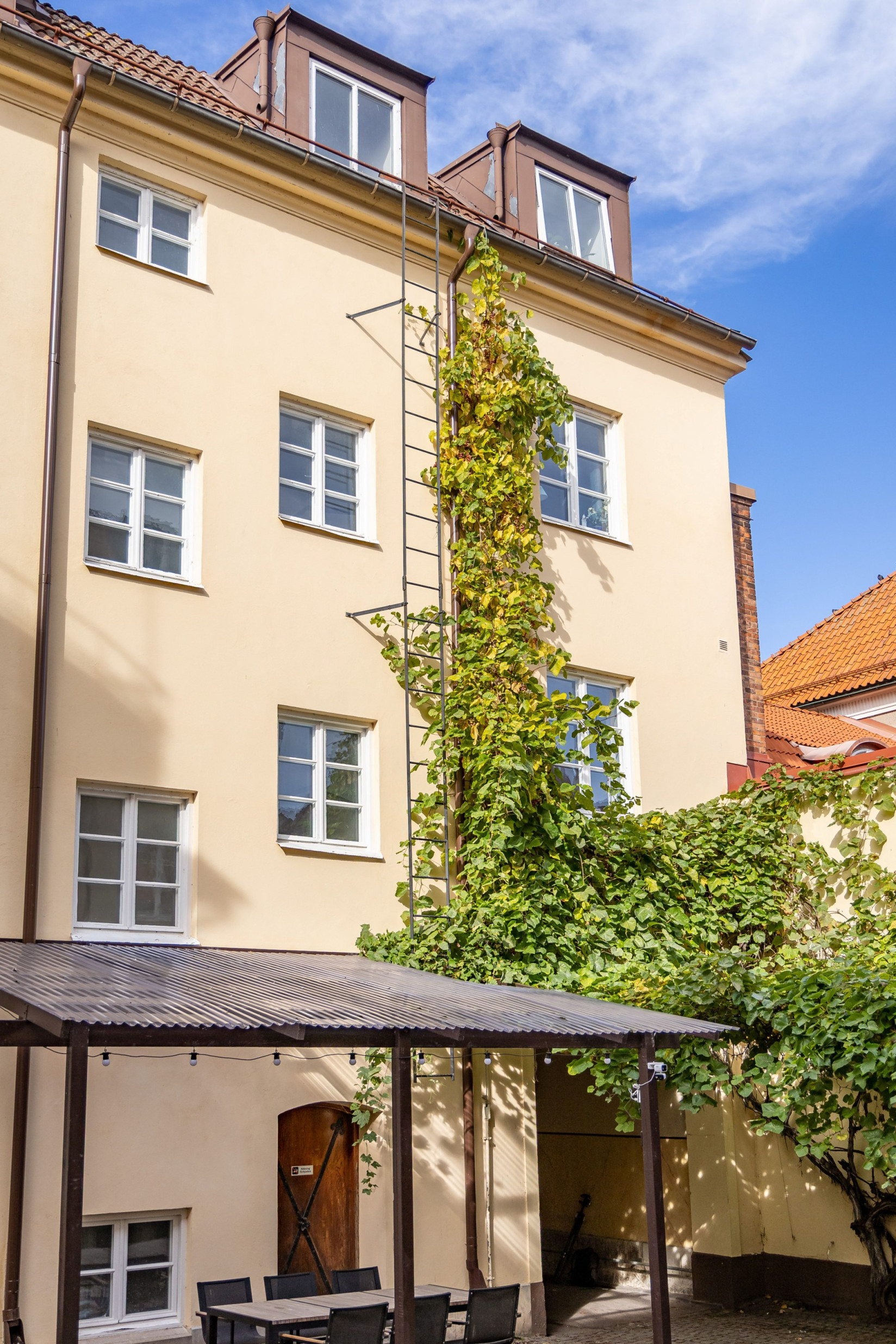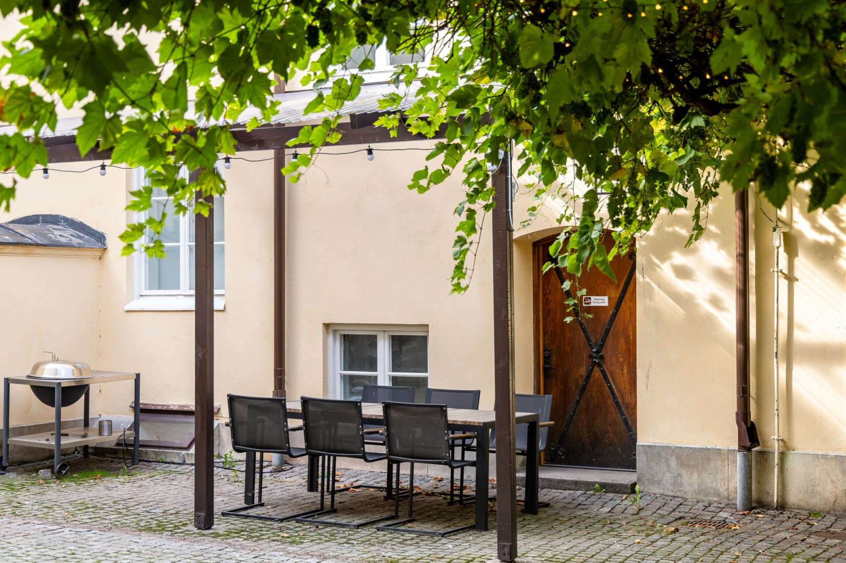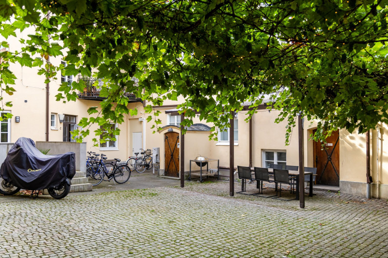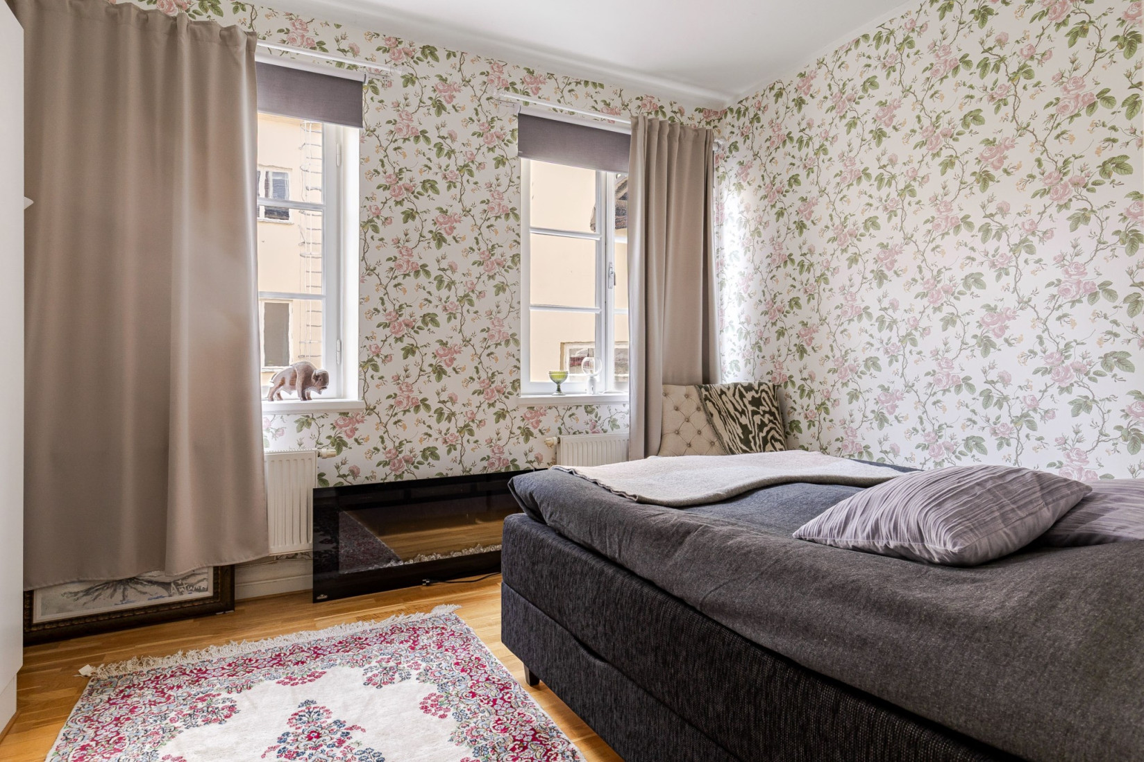 Sovrummet vetter mot den lugna innergården och har stora fönster som ger rummet ett behagligt ljus. Här erbjuds flera garderober med gott om plats för förvaring.