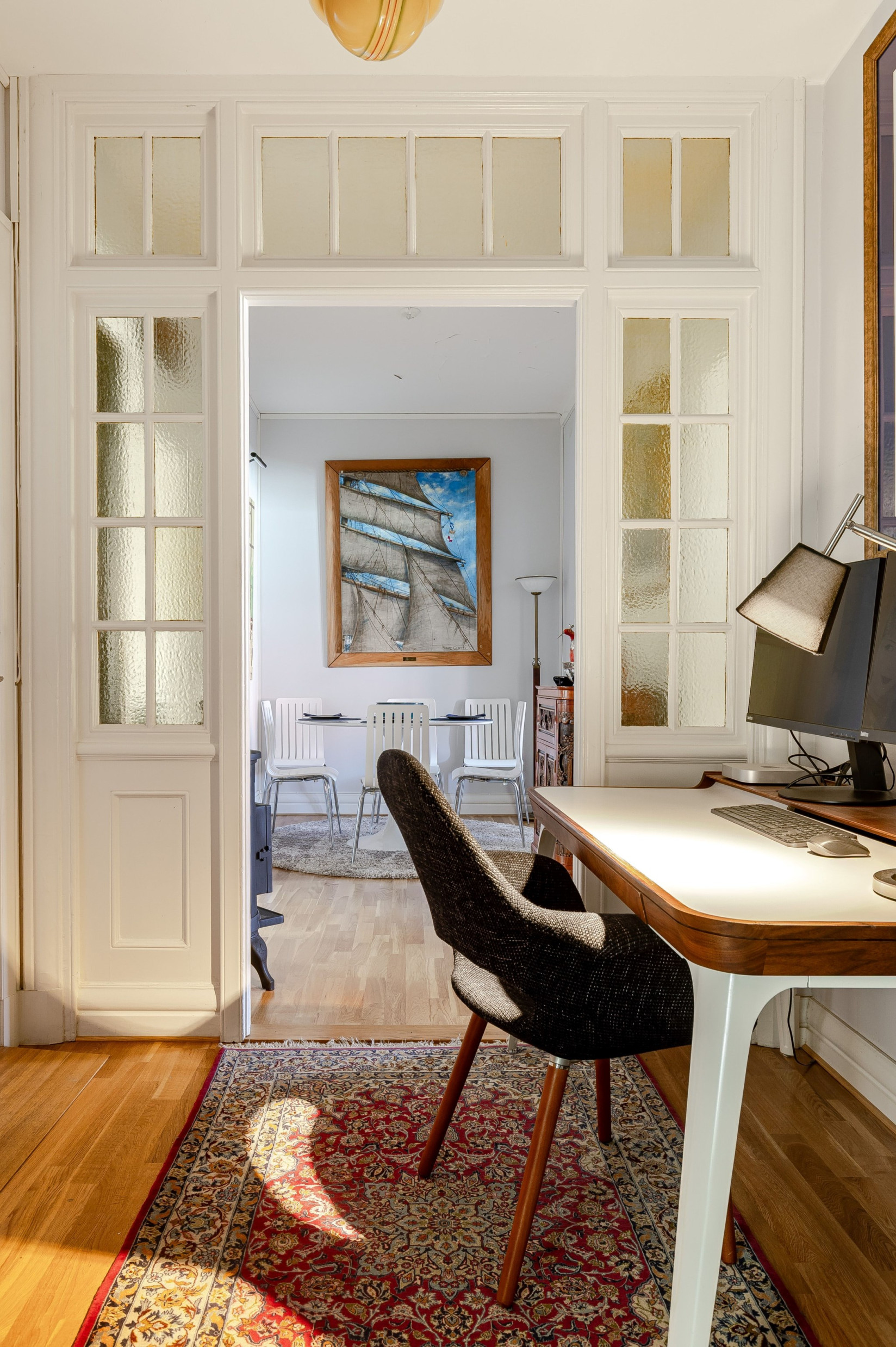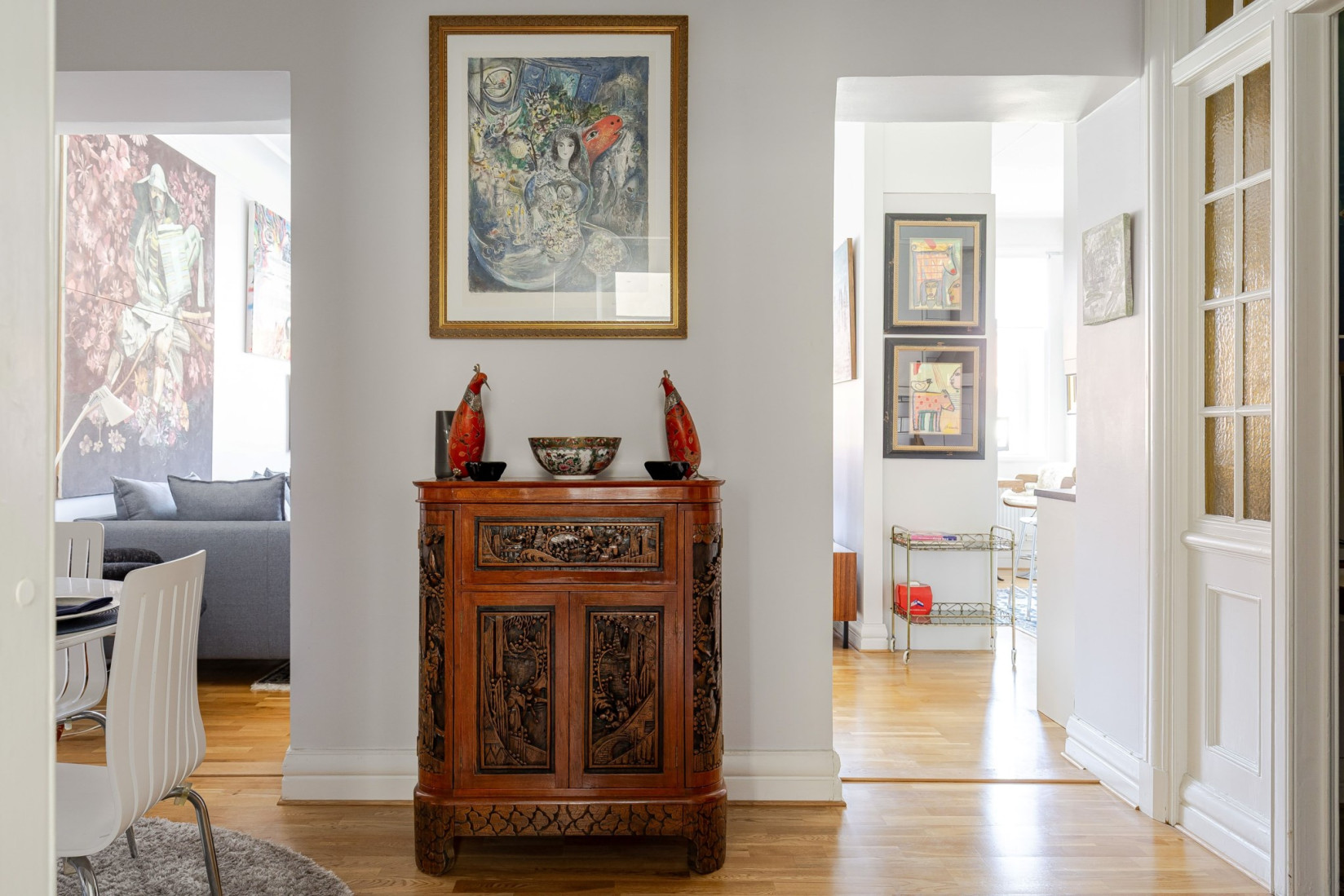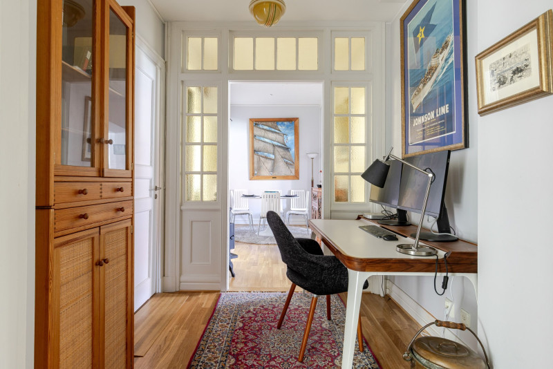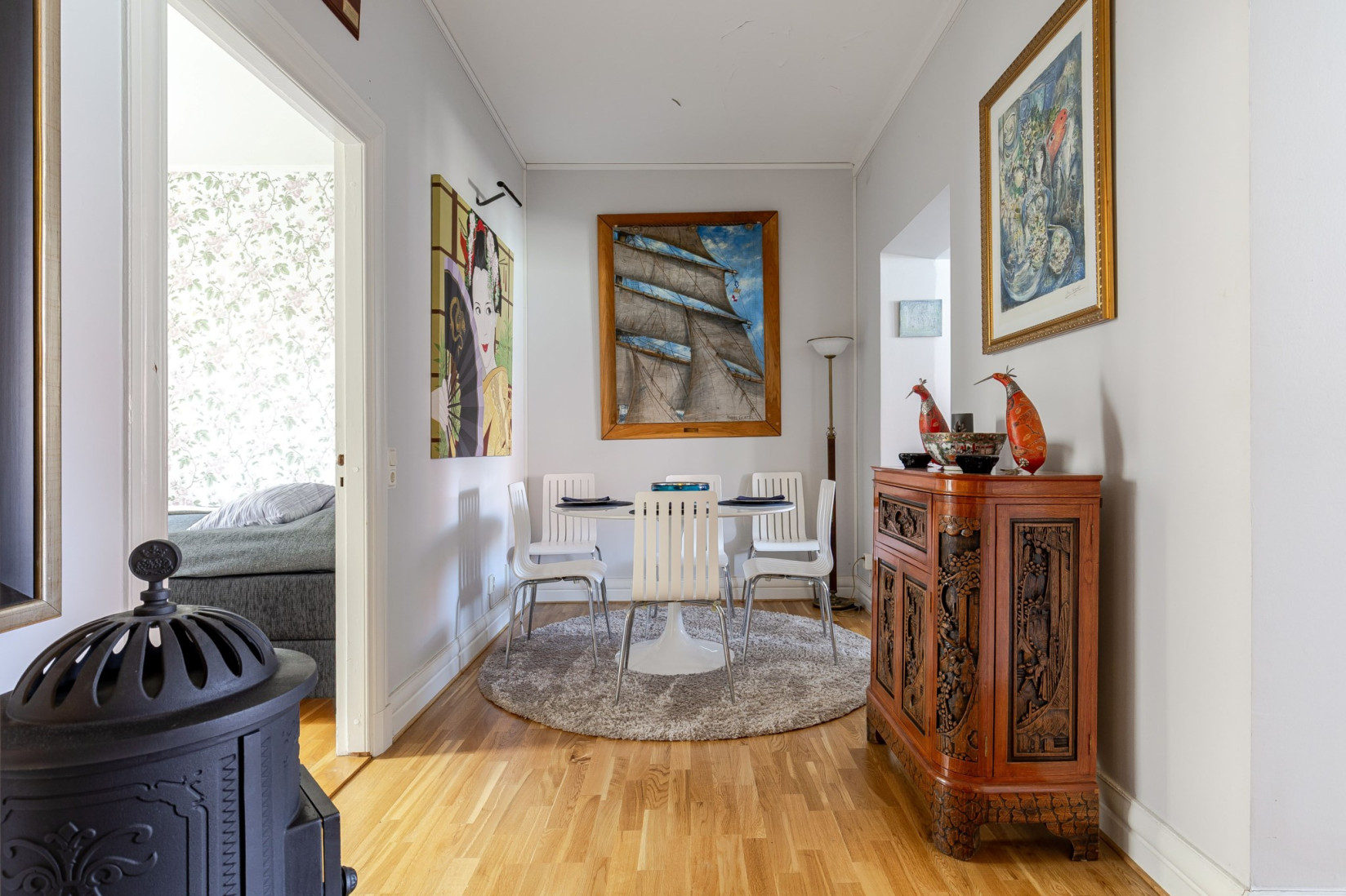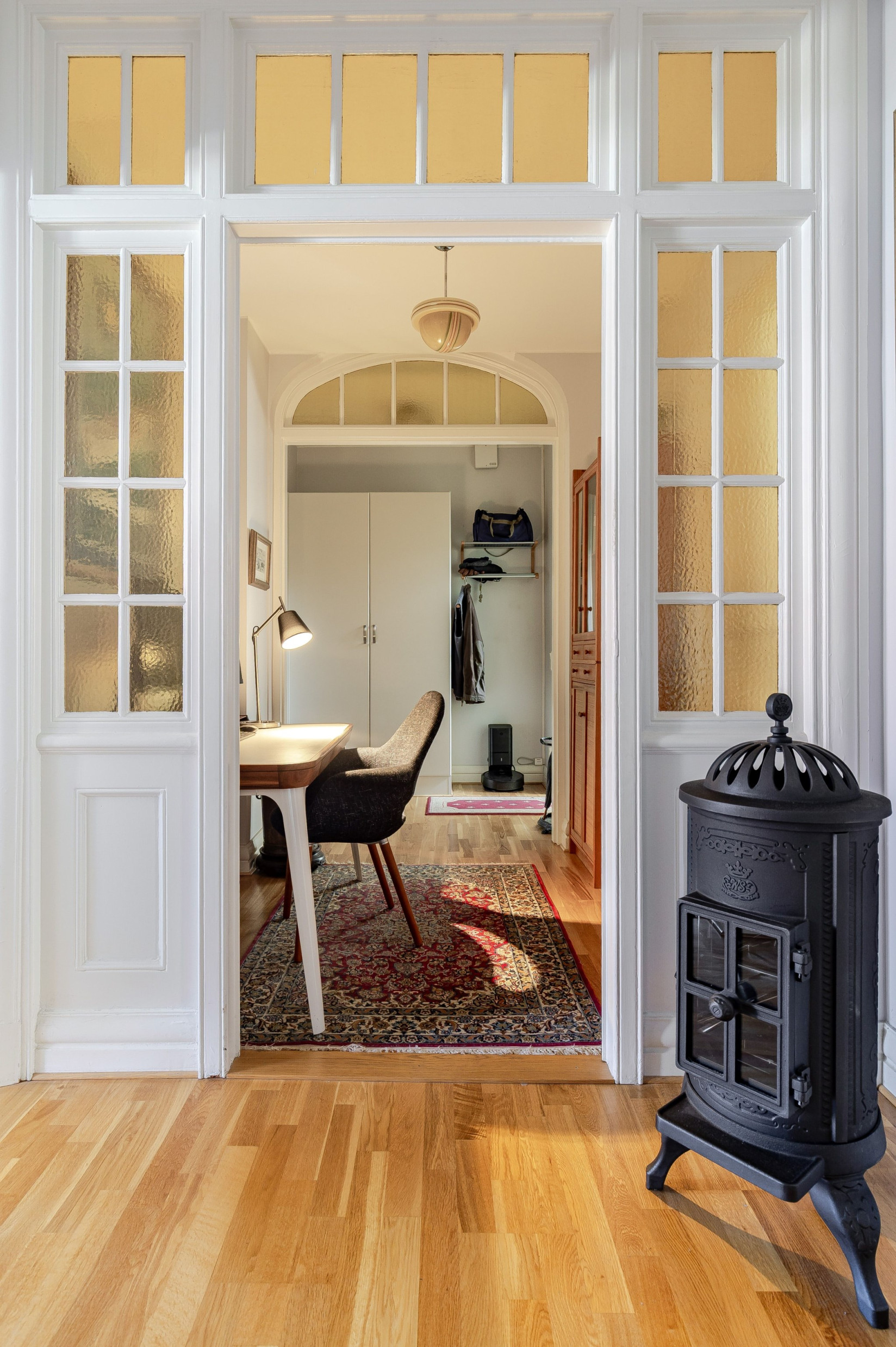 Vid ankomsten möts du av en rymlig hall med gott om förvaringsmöjligheter. Det vackra parkettgolvet löper genom hela bostaden och skapar en enhetlig helhet. Redan här märks den bevarade originalkänslan från 1920-talet, som tillför hemmet sin unika karaktär.