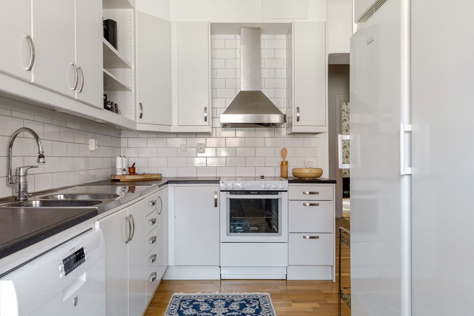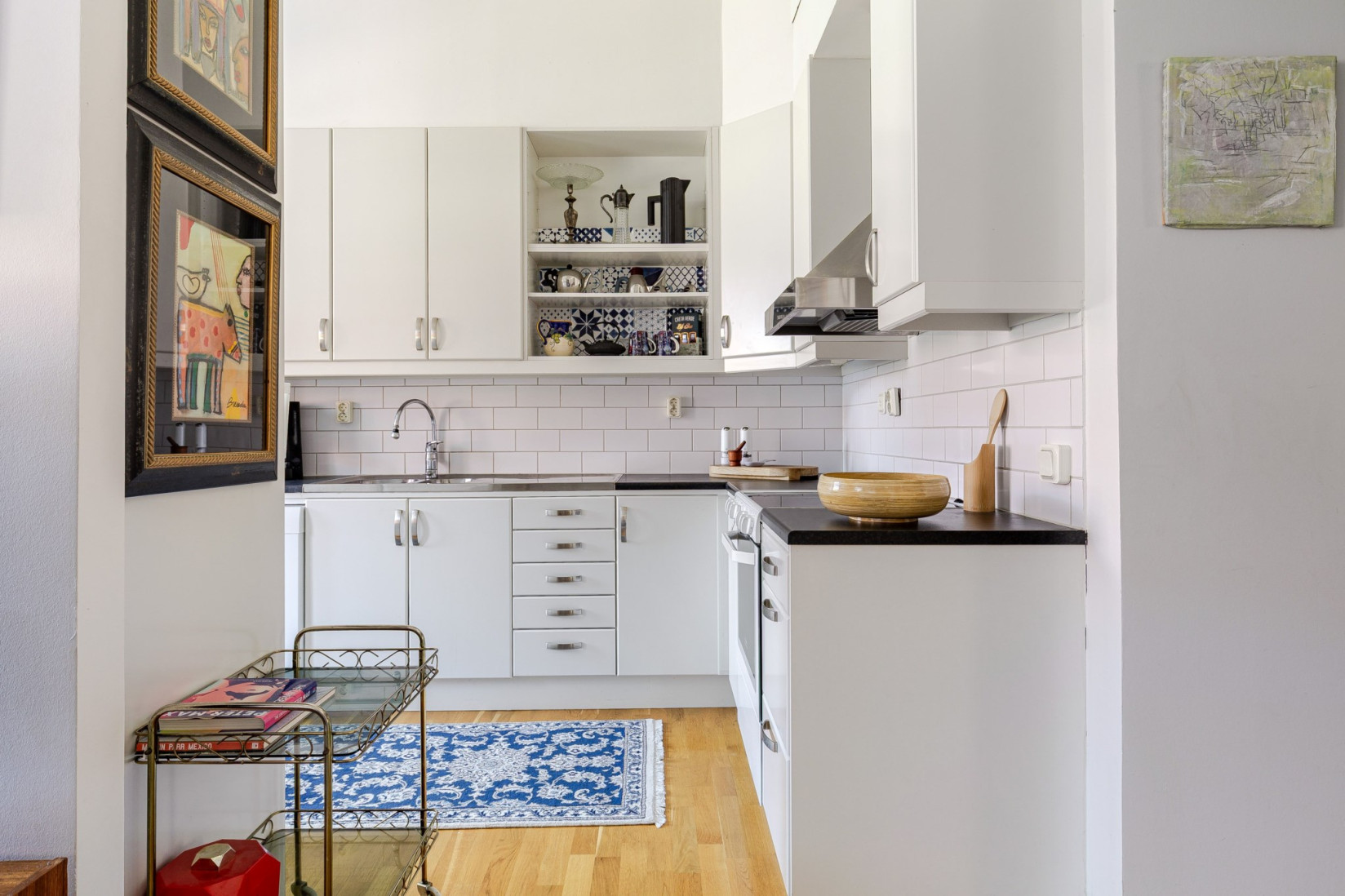 I anslutning ligger det ljusa köket med goda förvaringsmöjligheter och utrustning i form av kyl, frys, ugn, spis, fläkt och diskmaskin. Tack vare den öppna planlösningen mot vardagsrummet blir detta en naturlig samlingspunkt för sociala måltider och umgänge.
