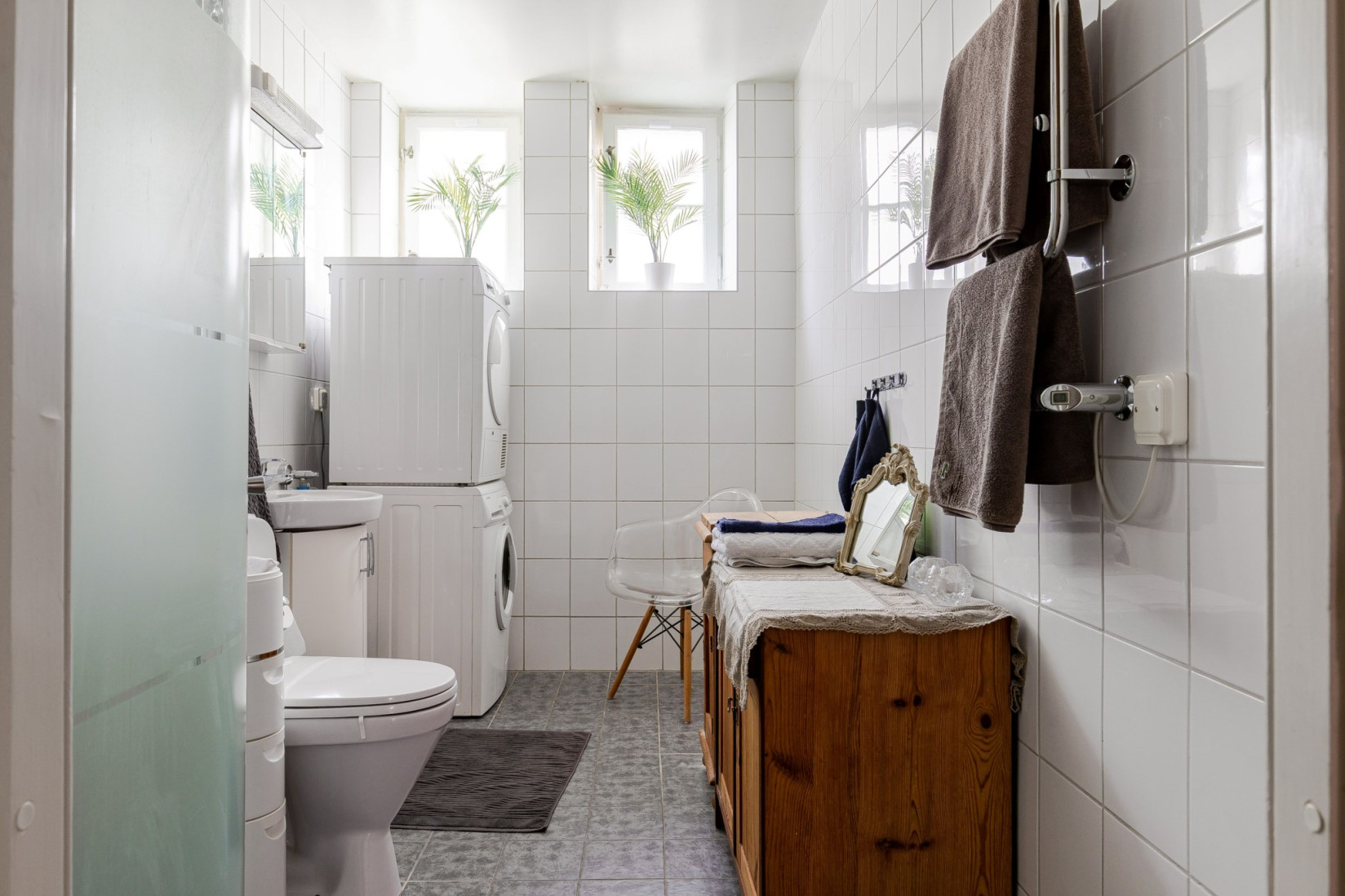 Från hallen nås det helkaklade badrummet, utrustat med dusch, toalett, handfat och spegelskåp med belysning. Här finns även handdukstork och golvvärme för extra komfort, liksom egen tvättmaskin och torktumlare.