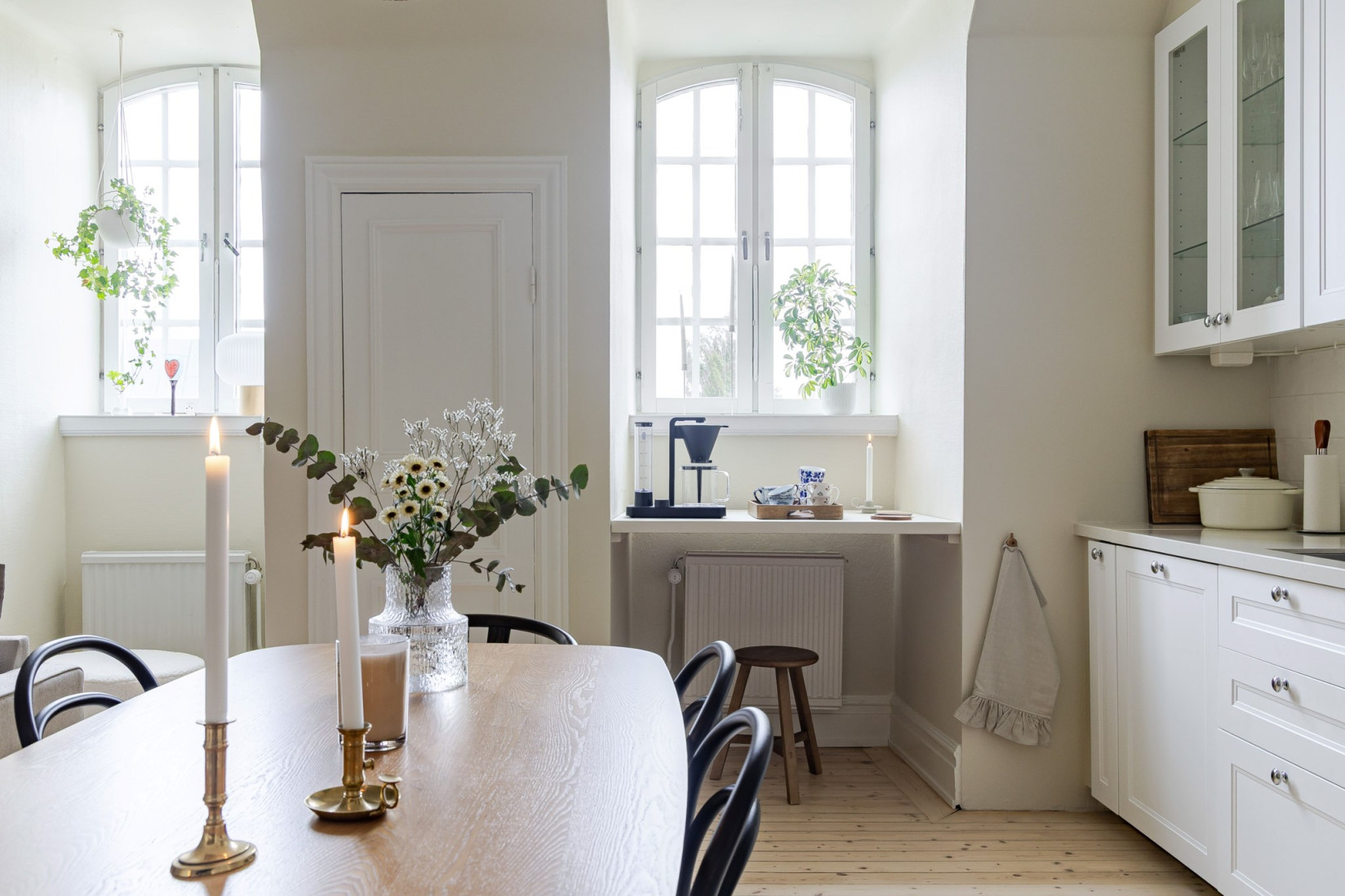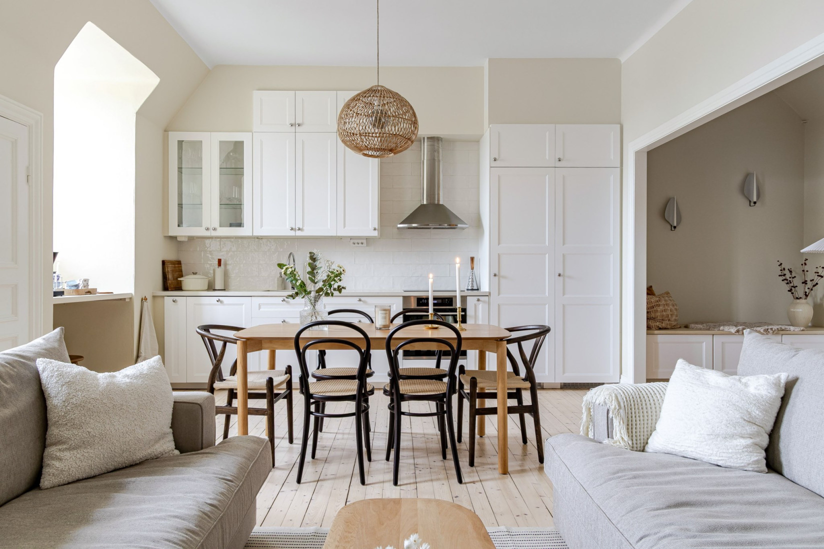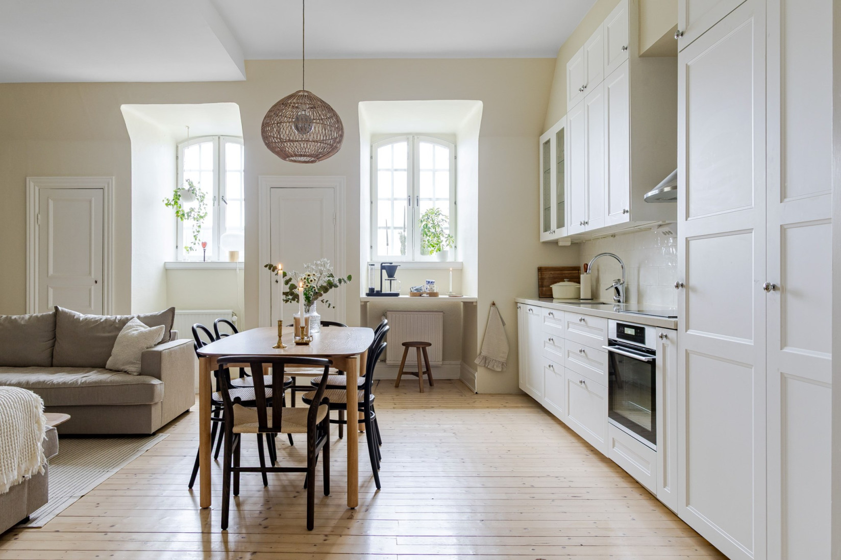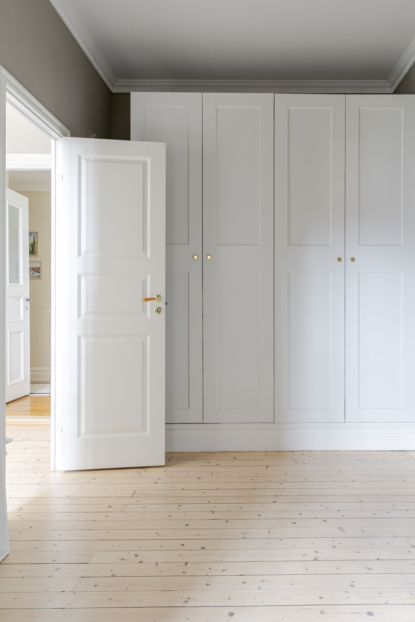 Det stilrena och välutrustade köket fräschats så sent som 2022/2023. Nya luckor, nya bänkskivor och nya vitvaror. Det vackra plankgolvet gör sig fint med köksinredningen. Vita, profilerade skåpsluckor, bänkskivor i sten och vackra detaljer. Med sina kvalitéer och egenskaper är detta ett kök för den kräsne, skicklige och nyfikne kocken. Den maskinella utrustningen består av diskmaskin, induktionshäll, ugn, fläkt samt inbyggd kyl och frys. Rummet bjuder på charm i överflöd. På tal om charm. Bakom de två dörrarna hittar du oanade förvaringsutrymmen. Det ena gör sig utmärkt som skafferi.