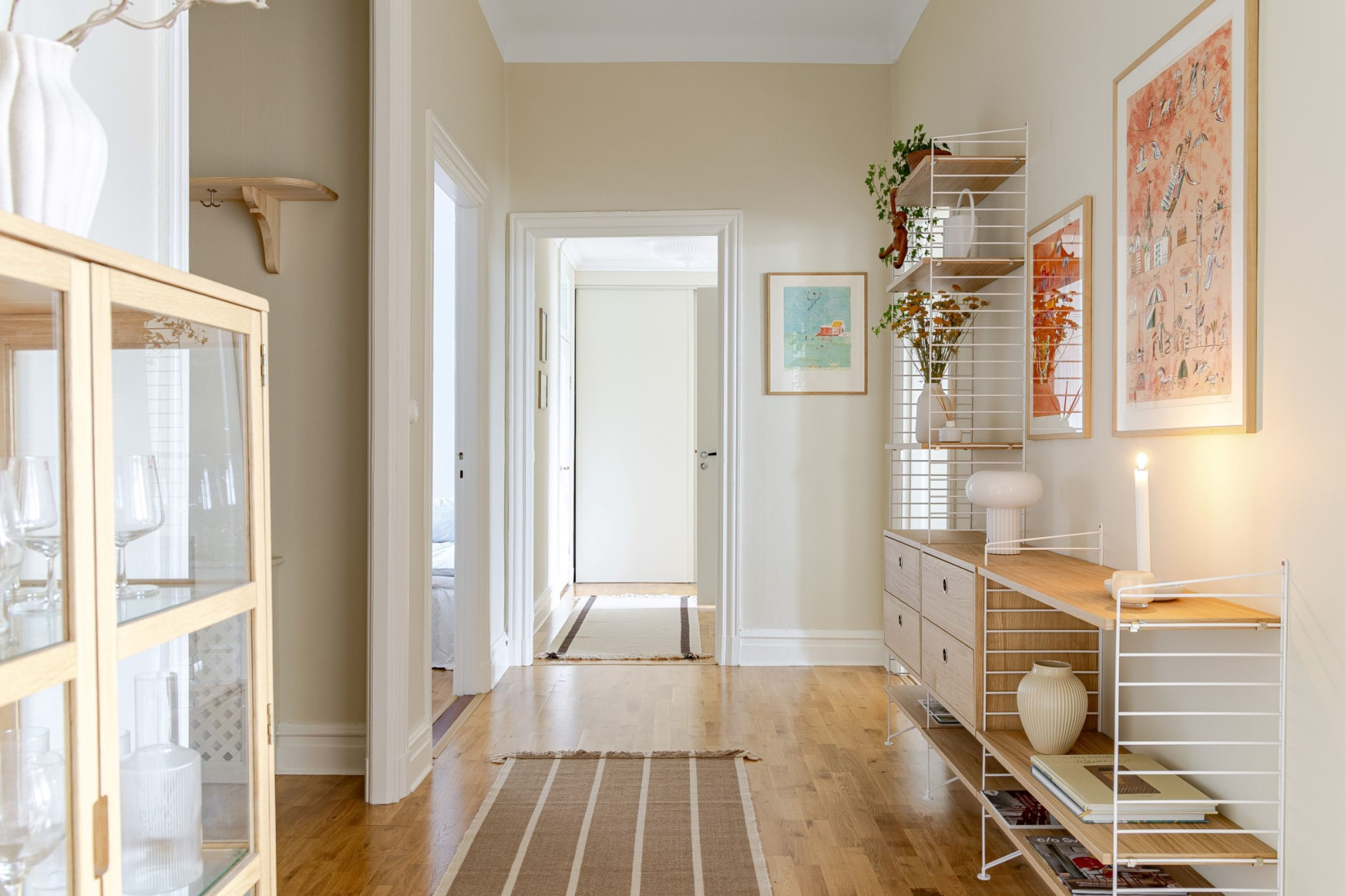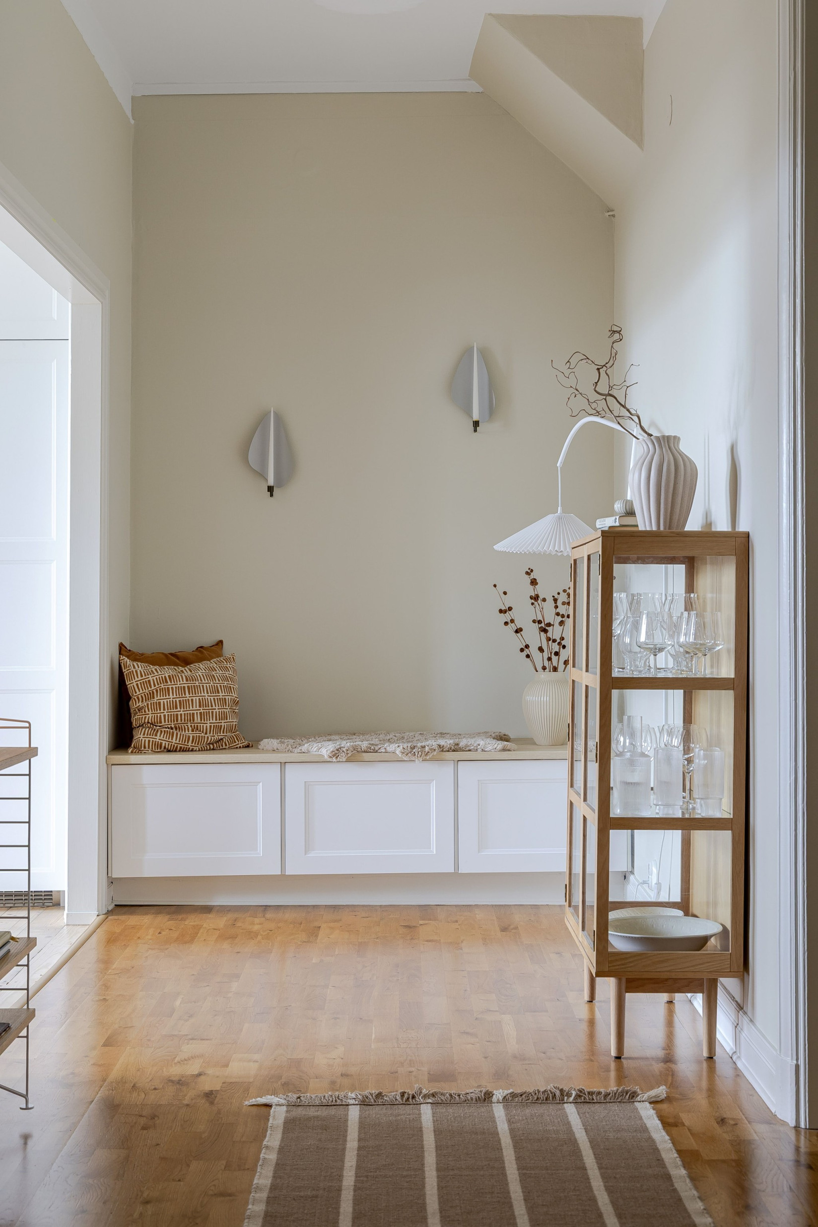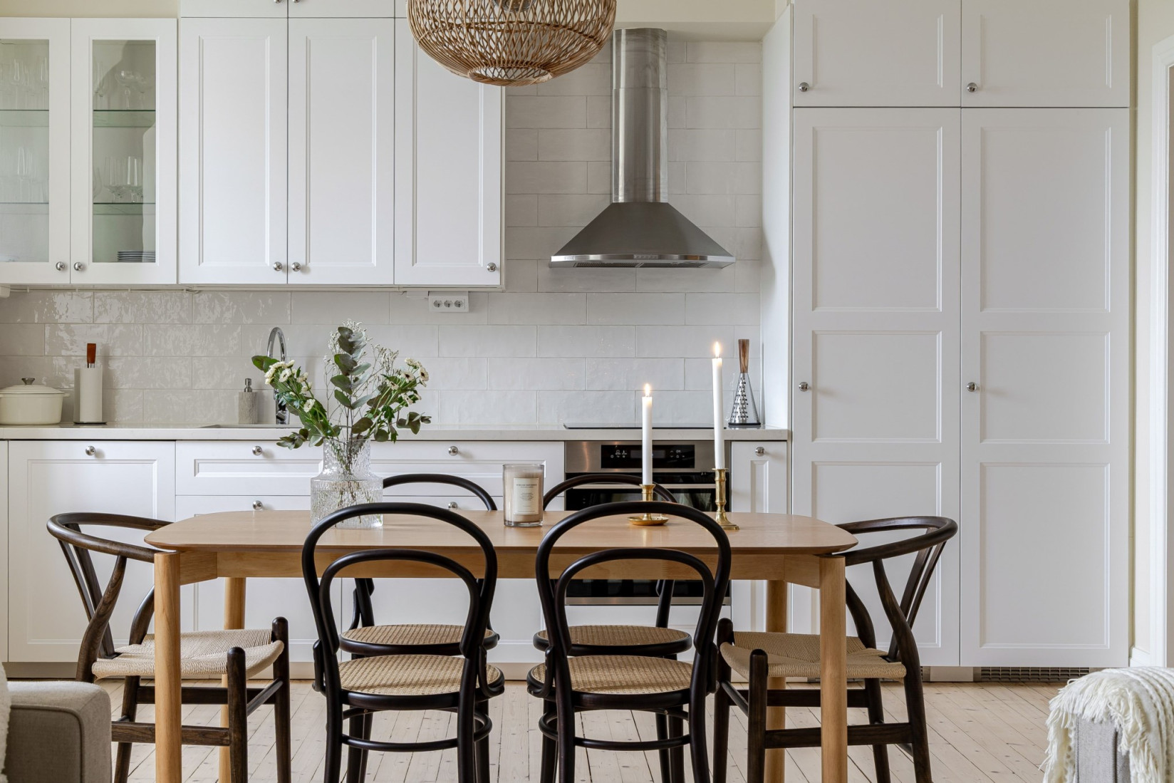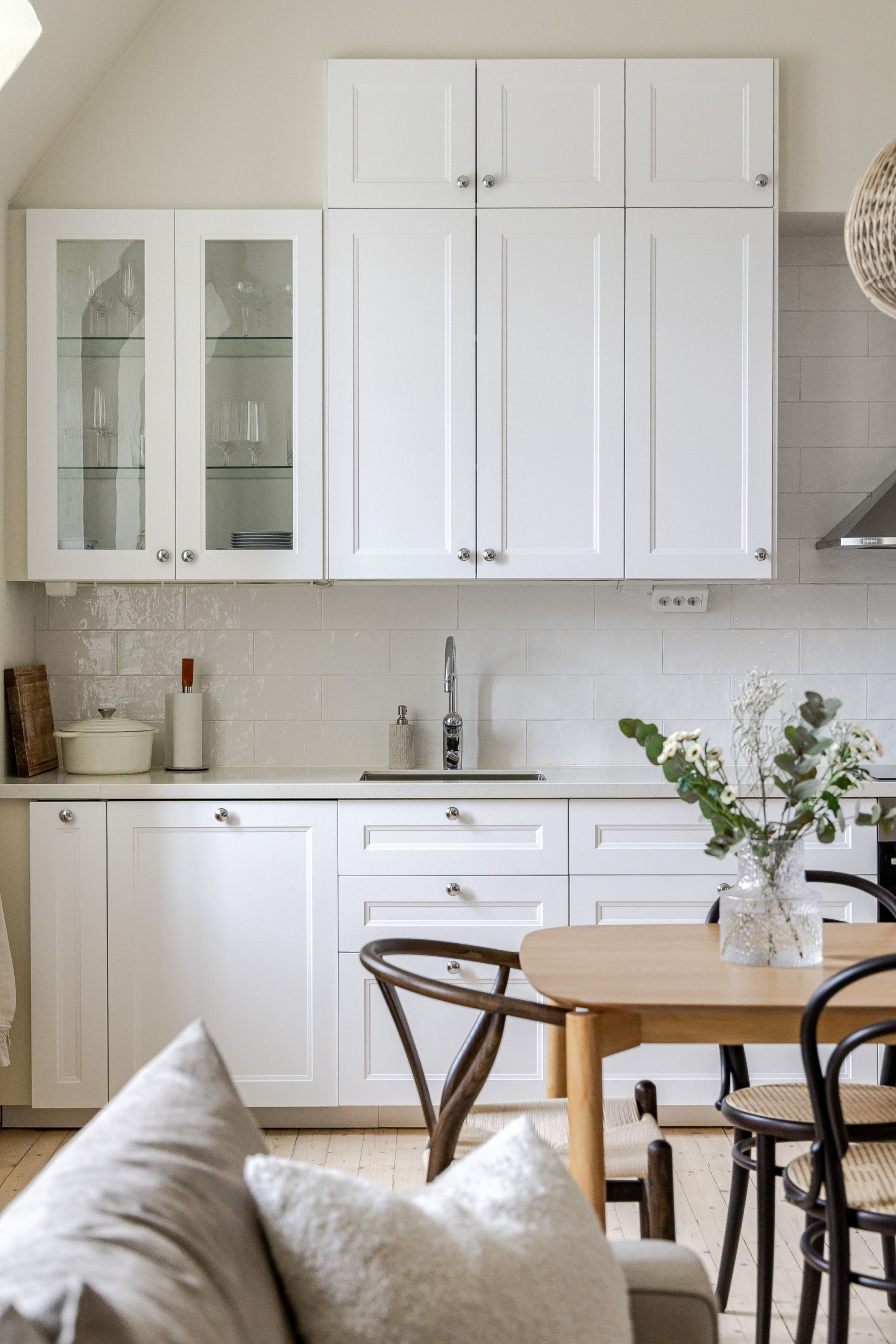 Det stilrena och välutrustade köket fräschats så sent som 2022/2023. Nya luckor, nya bänkskivor och nya vitvaror. Det vackra plankgolvet gör sig fint med köksinredningen. Vita, profilerade skåpsluckor, bänkskivor i sten och vackra detaljer. Med sina kvalitéer och egenskaper är detta ett kök för den kräsne, skicklige och nyfikne kocken. Den maskinella utrustningen består av diskmaskin, induktionshäll, ugn, fläkt samt inbyggd kyl och frys. Rummet bjuder på charm i överflöd. På tal om charm. Bakom de två dörrarna hittar du oanade förvaringsutrymmen. Det ena gör sig utmärkt som skafferi.