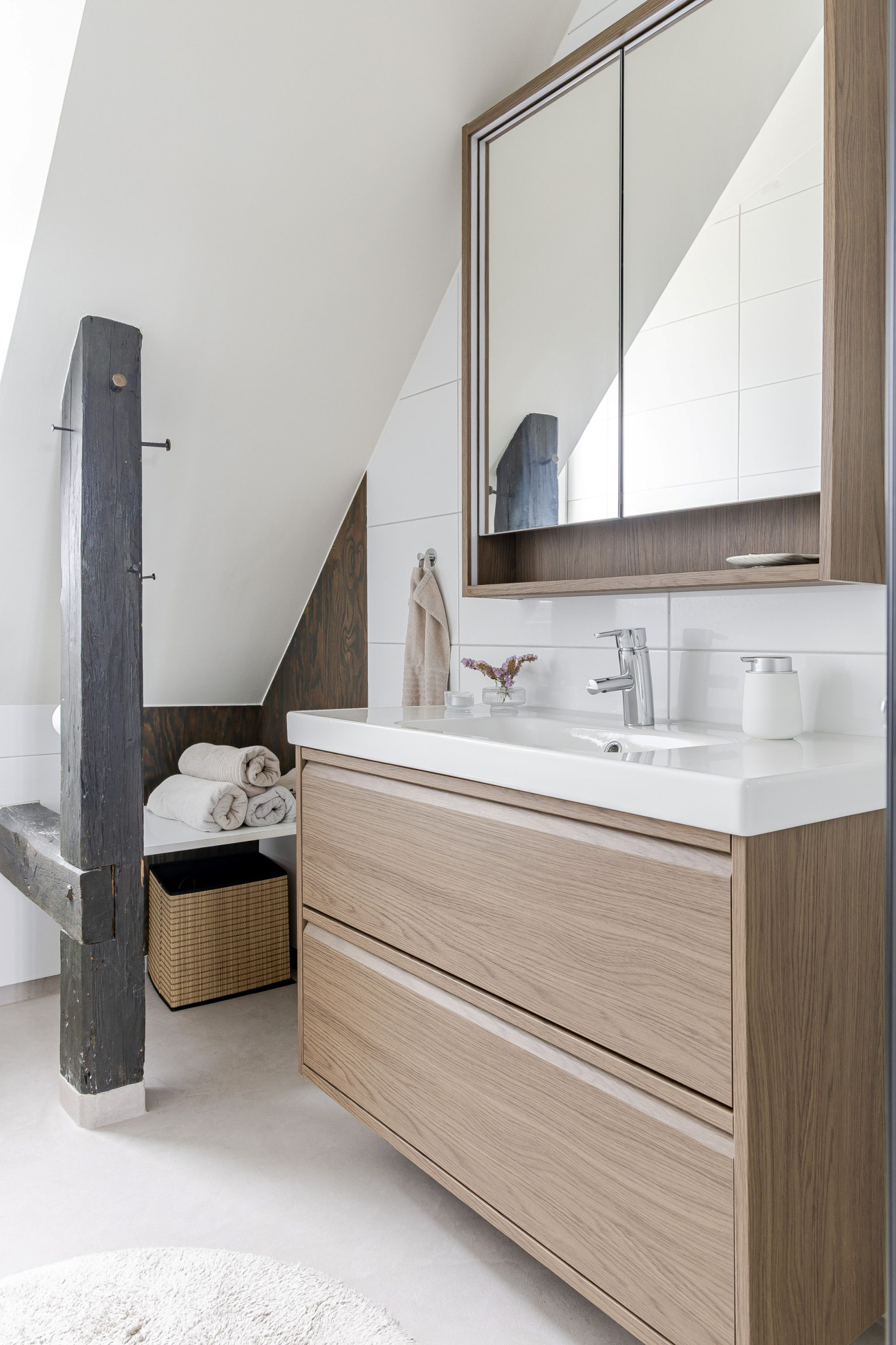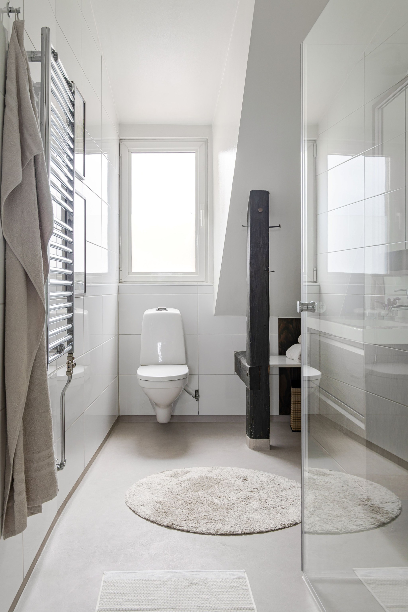 Badrummet totalrenoverades 2014/2015. 2025 byttes duschdörrarna, kommoden och spegelskåpet. Nytt golv i microfibercement. Du möts av smakfulla material- och färgval. Helkaklade väggar, gott om yta och fint ljusinsläpp från öppningsbart fönster. Här finns dusch med platsbesparande vikväggar, tvättställ med undersittande kommod, spegel, toalett, handdukstork och goda förvaringsmöjligheter. Dimbara spotlights i taket. Intill badrummet, i slutet på hallen, bakom skjutdörrar finns en utrustad tvättavdelning med tvättmaskin och torktumlare.