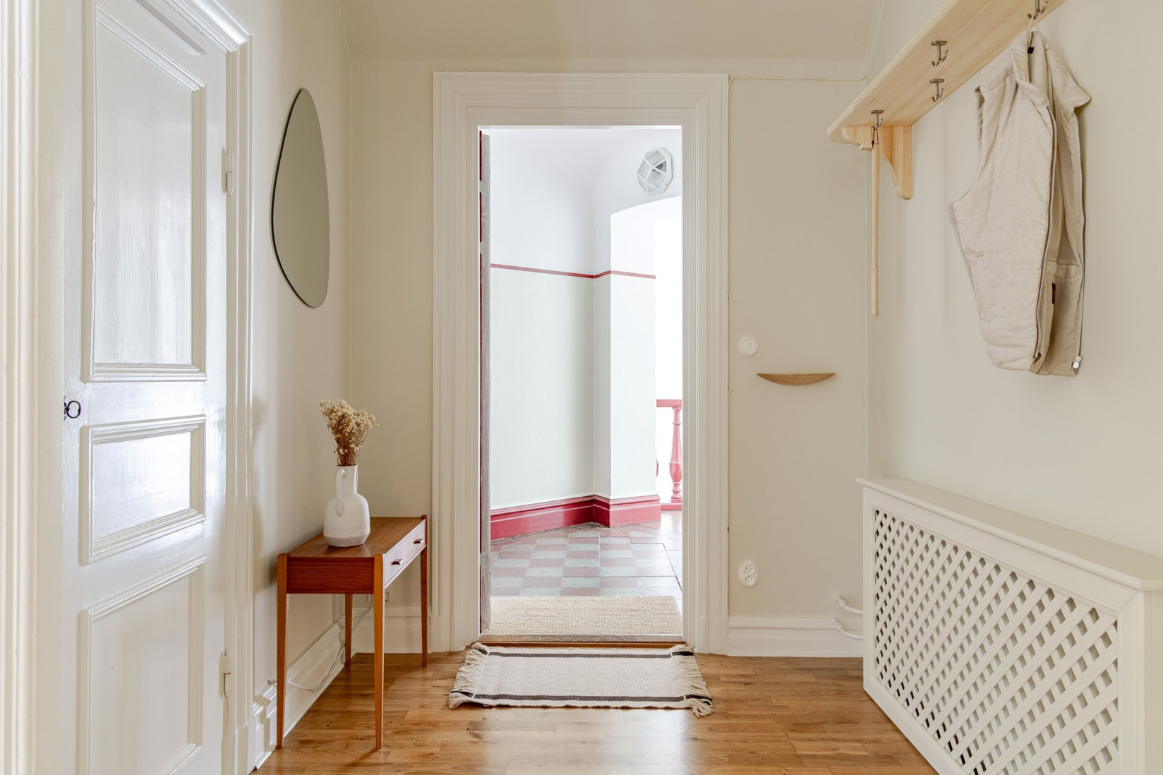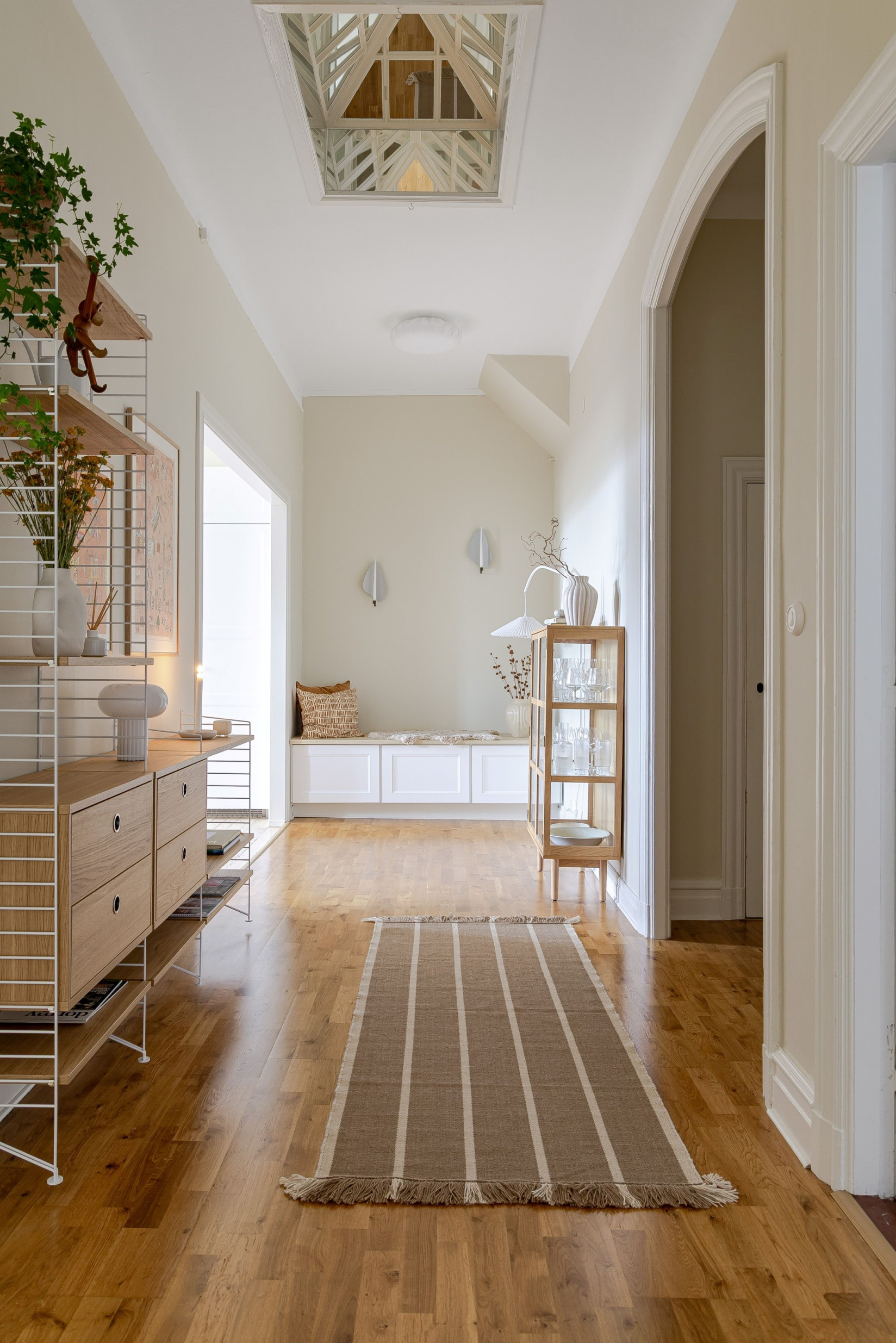 Känner du dig redo? Då tar vi klivet in! Det blir ett varmt mottagande med en rymlig och ljus hall. Titta upp - fantastisk takhöjd. Det som fångar vår uppmärksamhet är det spegelinklädda takfönstret - unikt och vackert! I direkt anslutning till entrén finns avhängningsmöjligheter för ytterkläder och skor. Till höger finner vi bostadens tidigare klädkammare. Ett rejält utrymme som nuvarande ägare valt att ta tillvara på. Rummet har fått göra plats för ett skrivbord. Hemmets tonårig skryter mer än gärna om sitt kryp-in. Förvaring, kontor, gäst- eller tonårsrum - du avgör! Fötterna har fått bekanta sig med gediget parkettgolv.